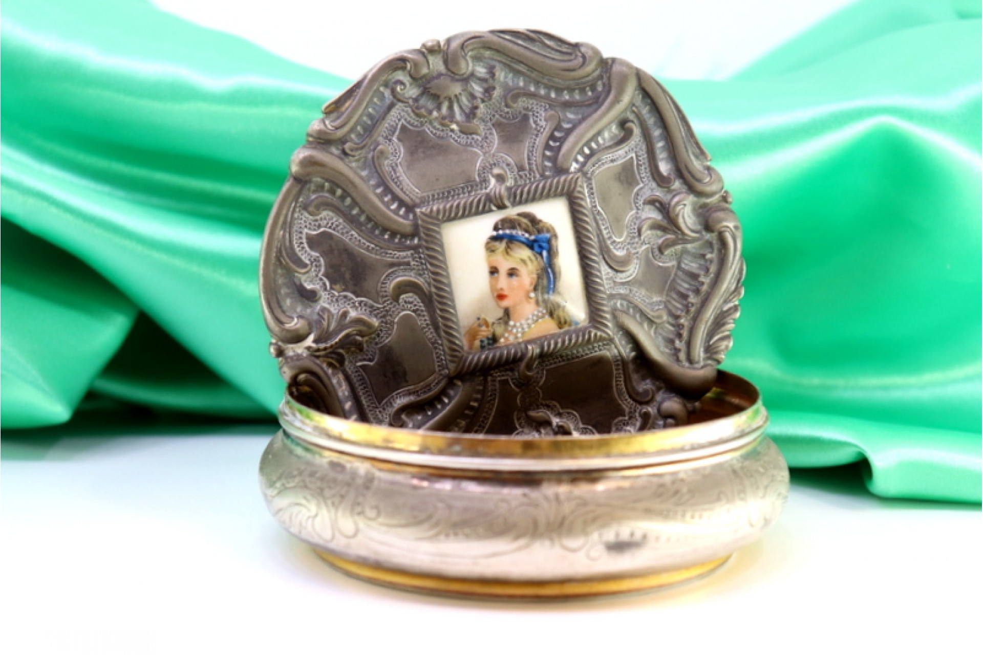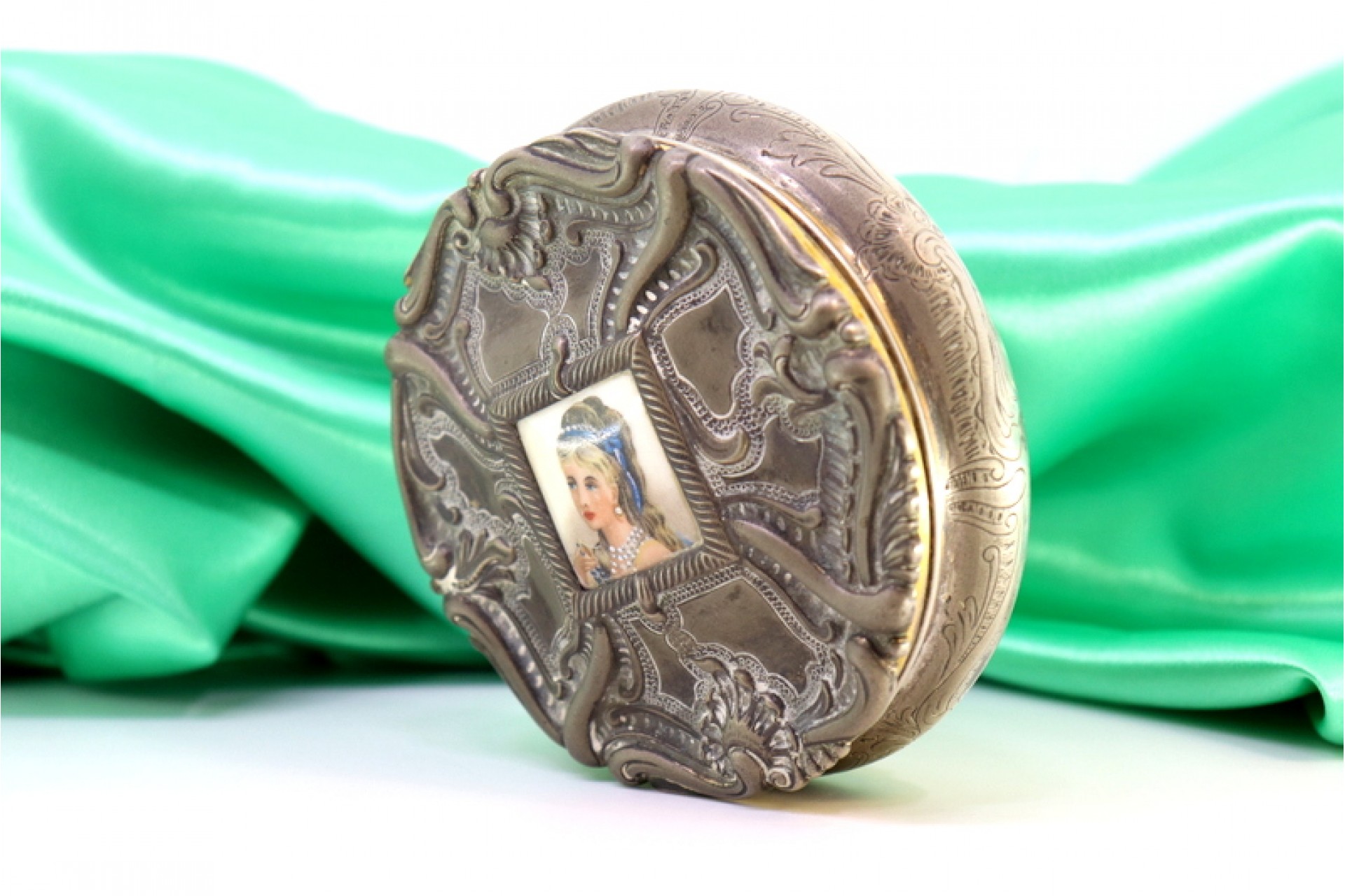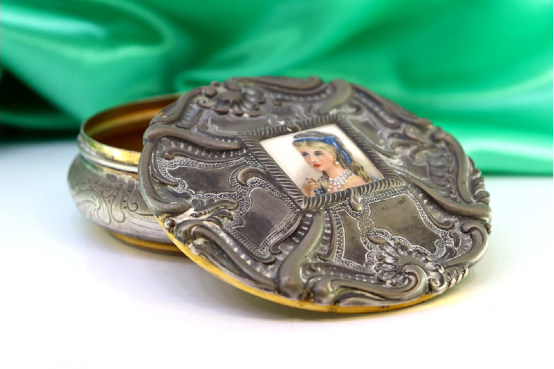 Guarda joias em prata com relevos e frisos dourados, limoge de dama antiga