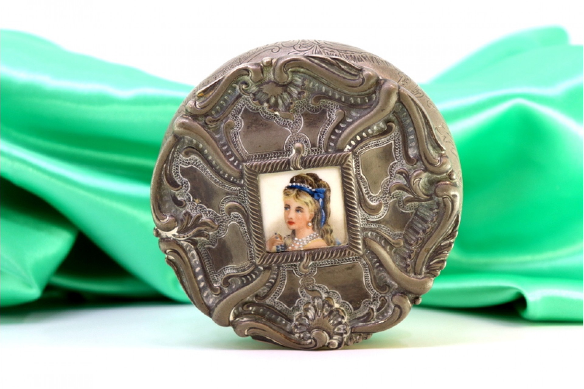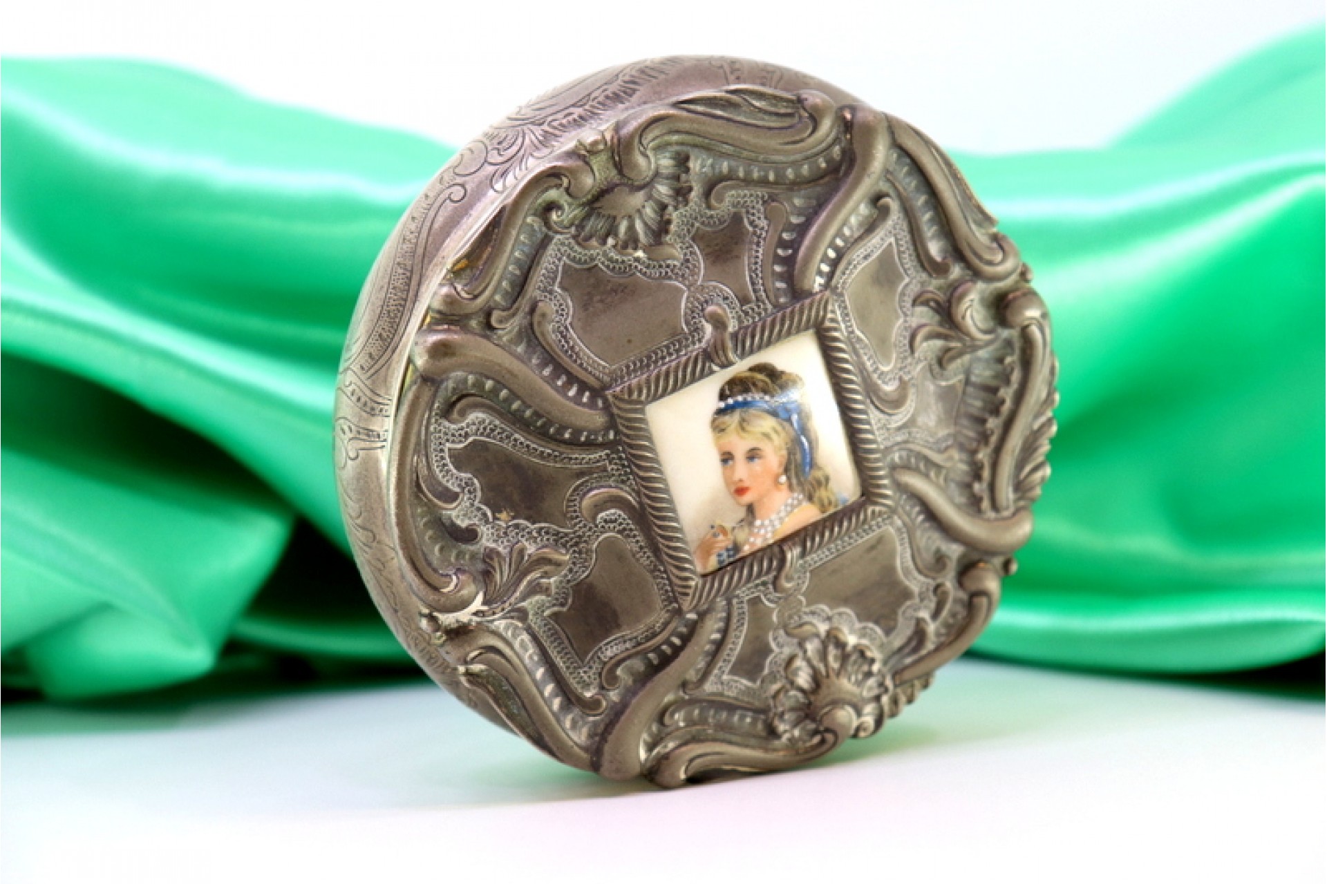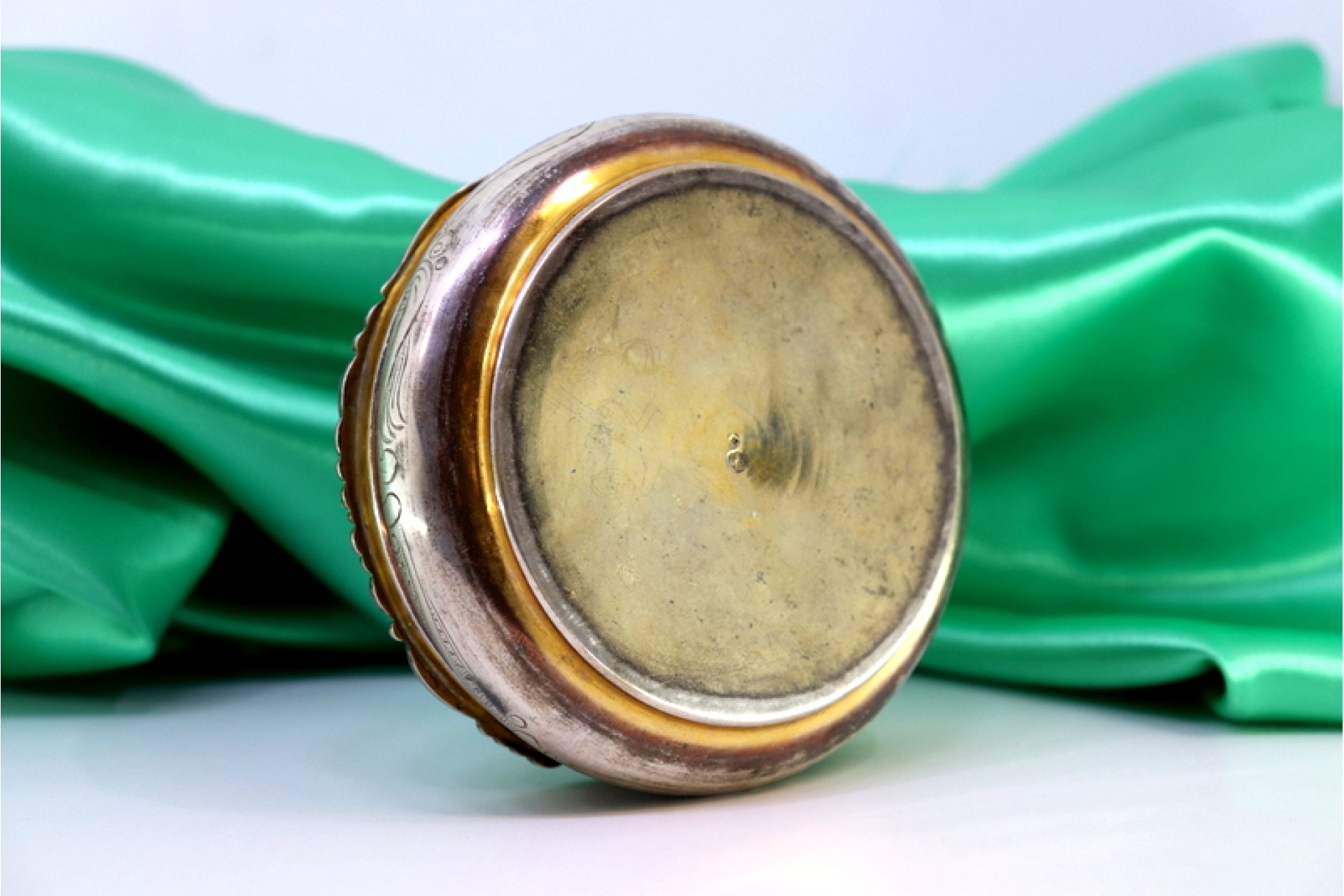Guarda joias em prata com relevos e frisos dourados, limoge de dama antiga