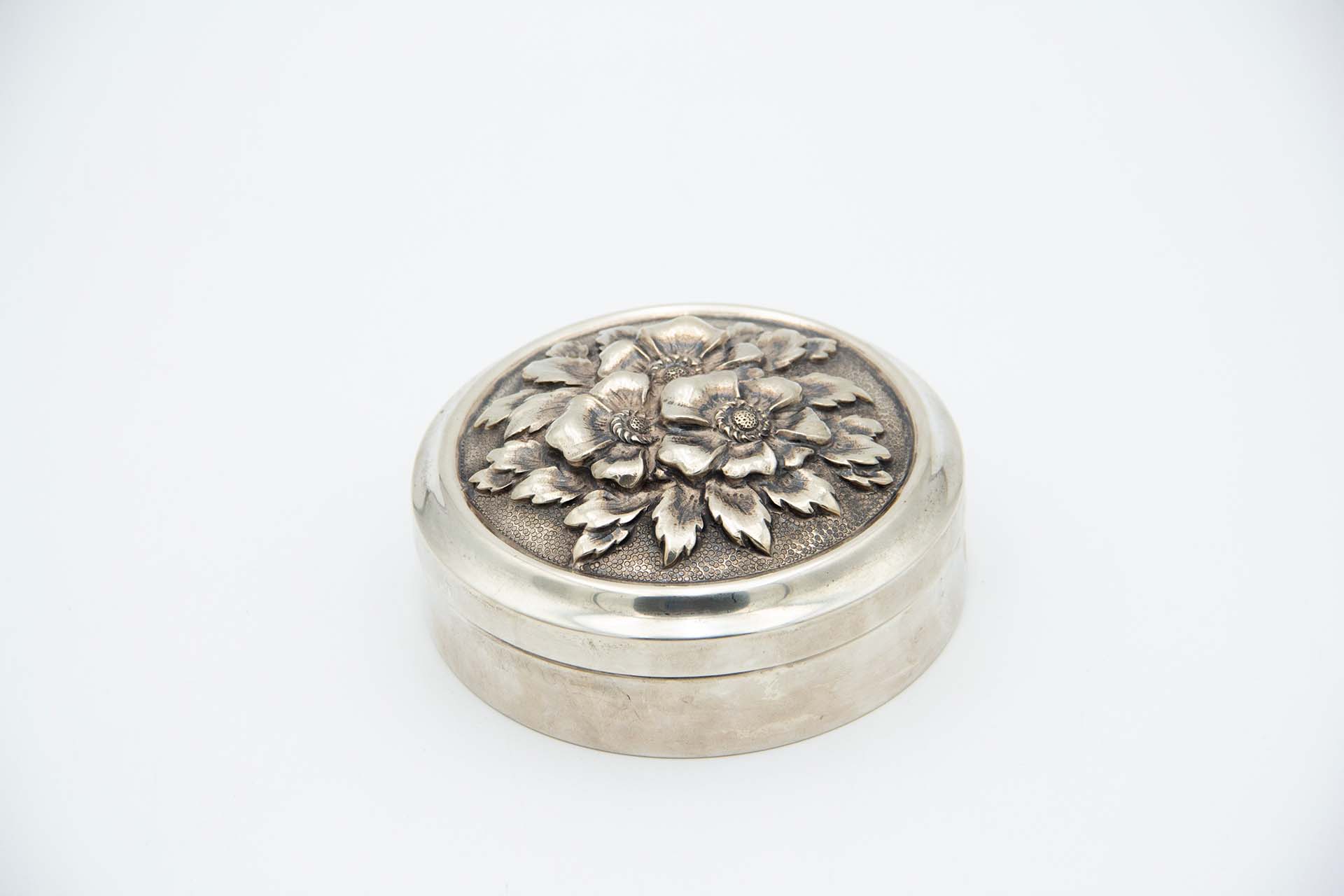 • Descrição: Guarda jóias em prata de forma cilíndrica com motivos florais em alto relevo e interior dourado.