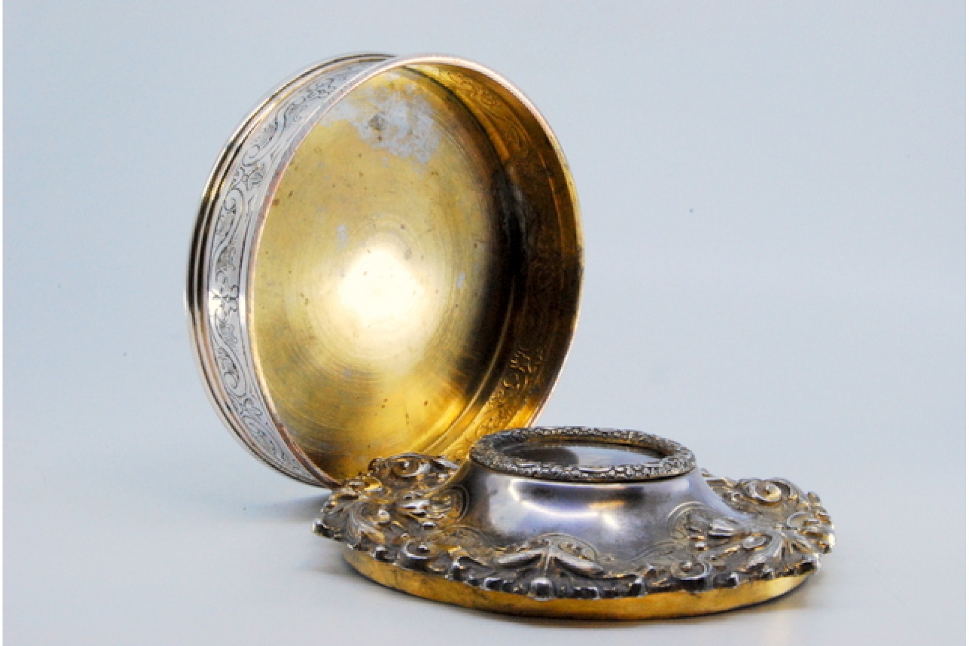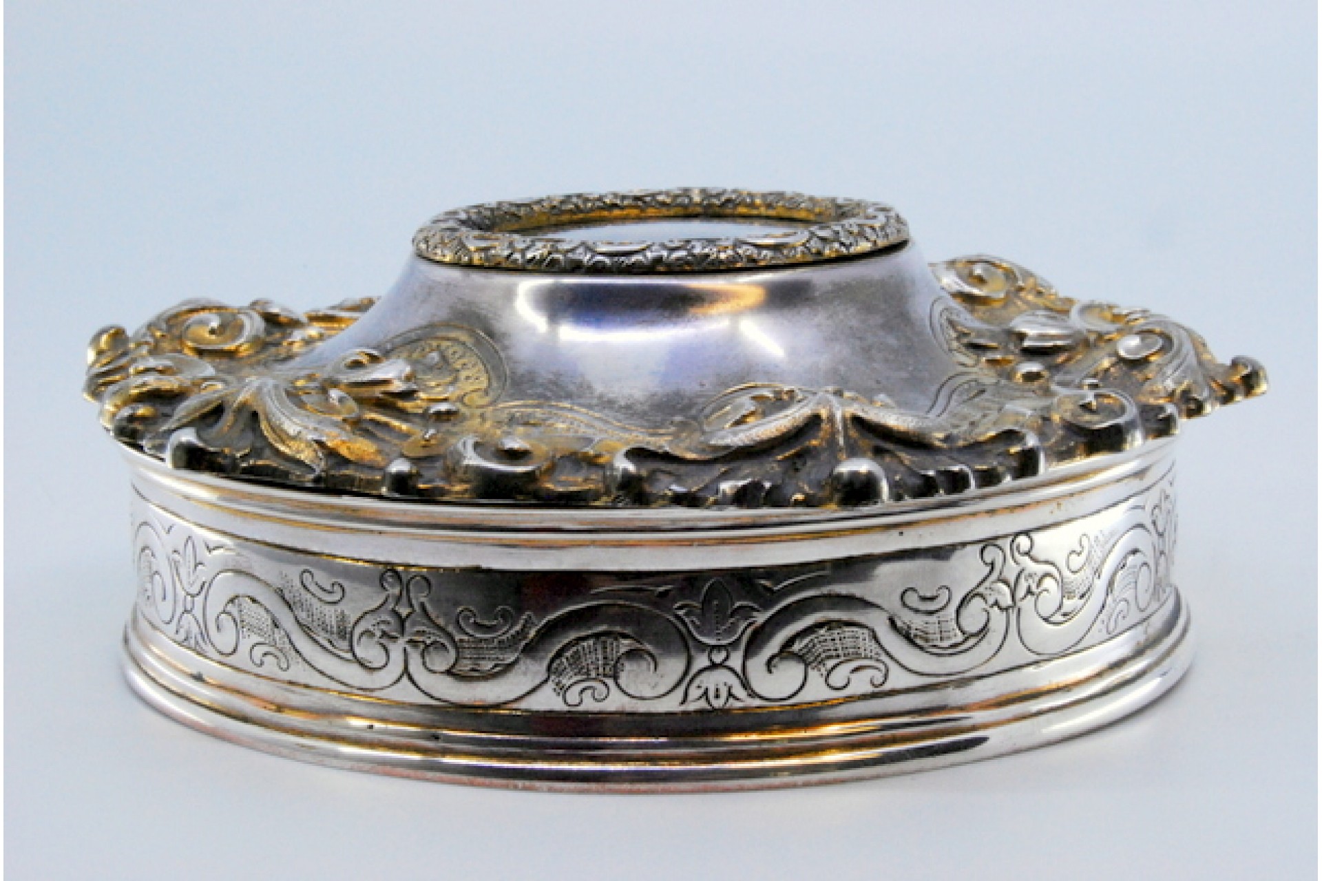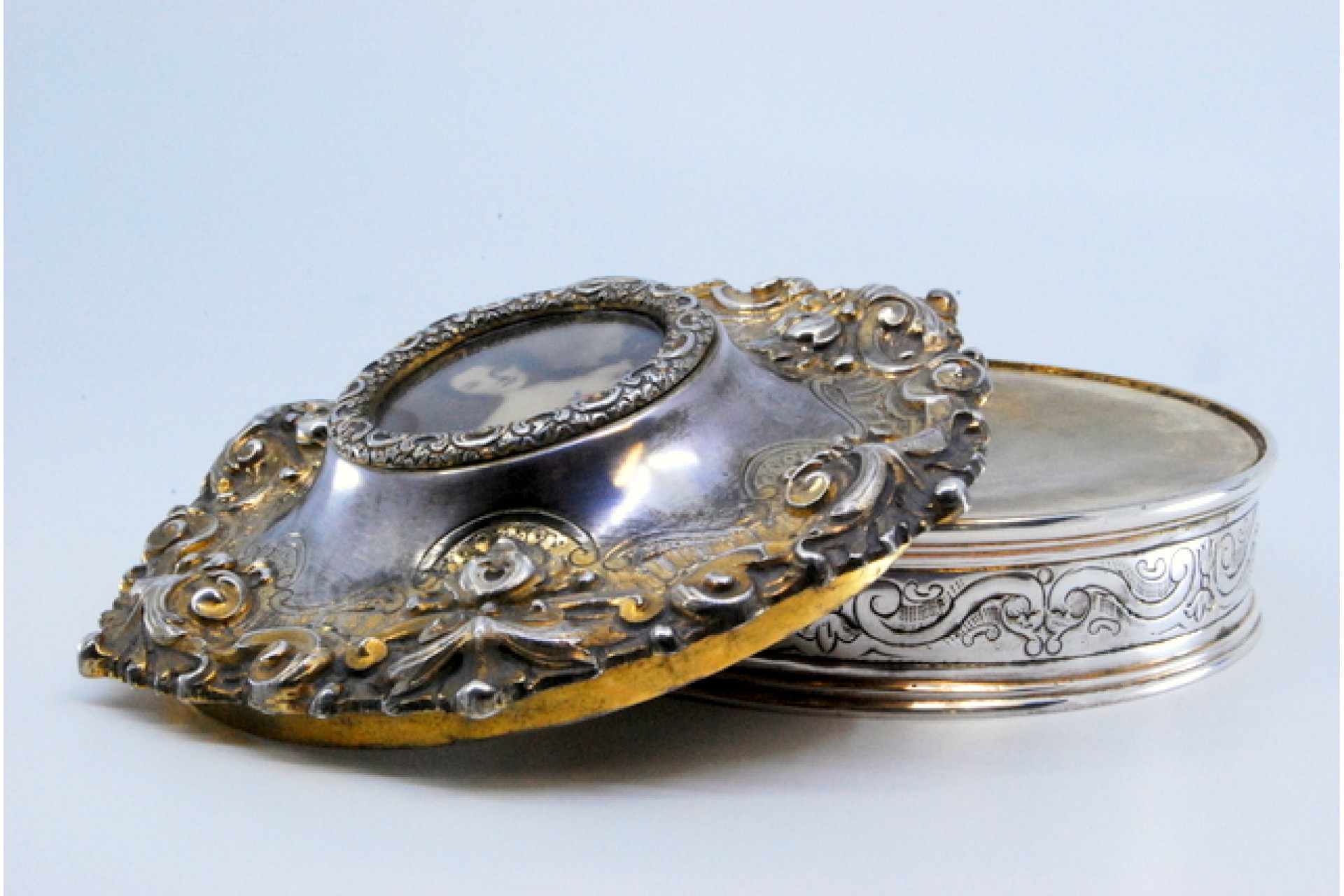 • Descrição: Guarda joias em prata concheada envolvendo cartela com dama antiga na tampa amovível.