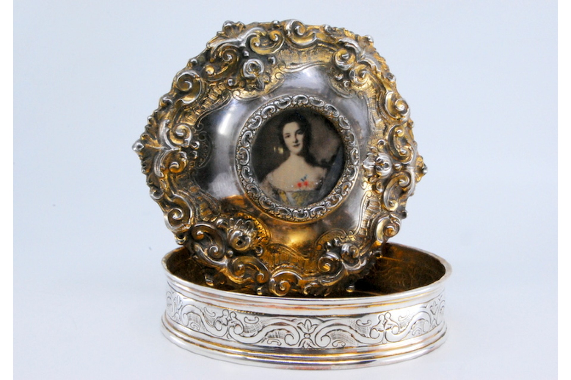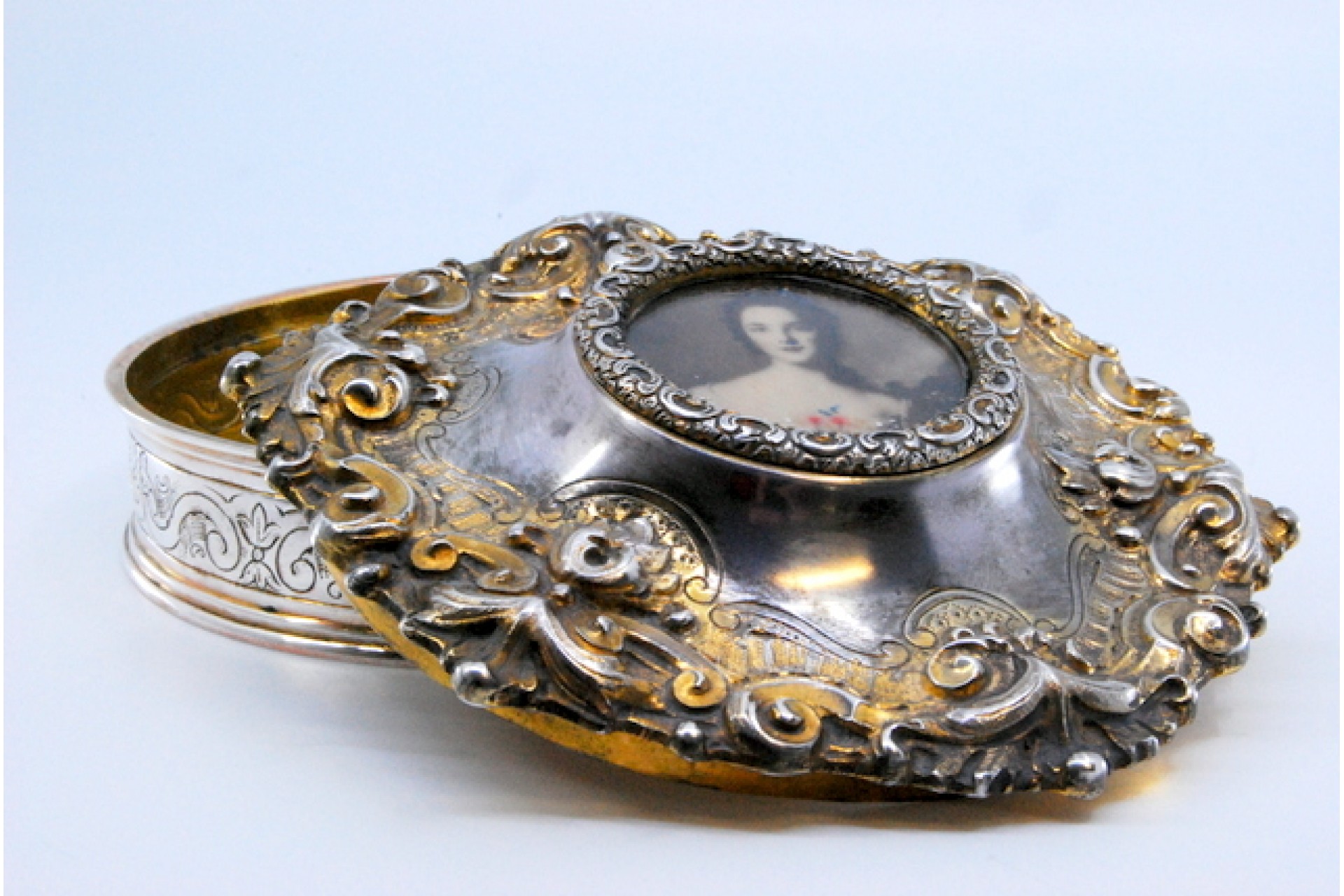 Guarda joias em prata concheada envolvendo cartela com dama antiga na tampa amovível.