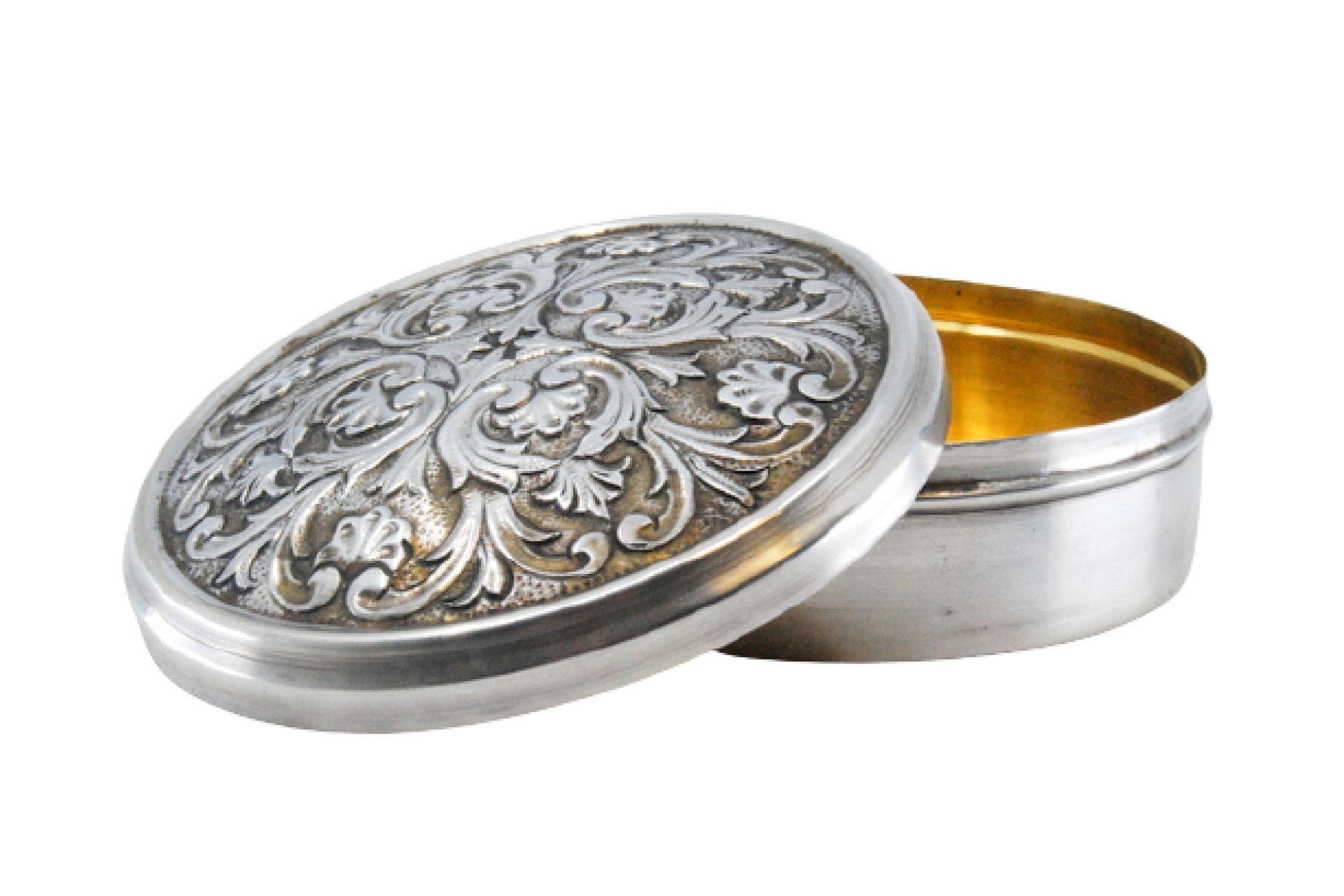 Guarda jóias em prata de forma circular com relevos na tampa amovível.