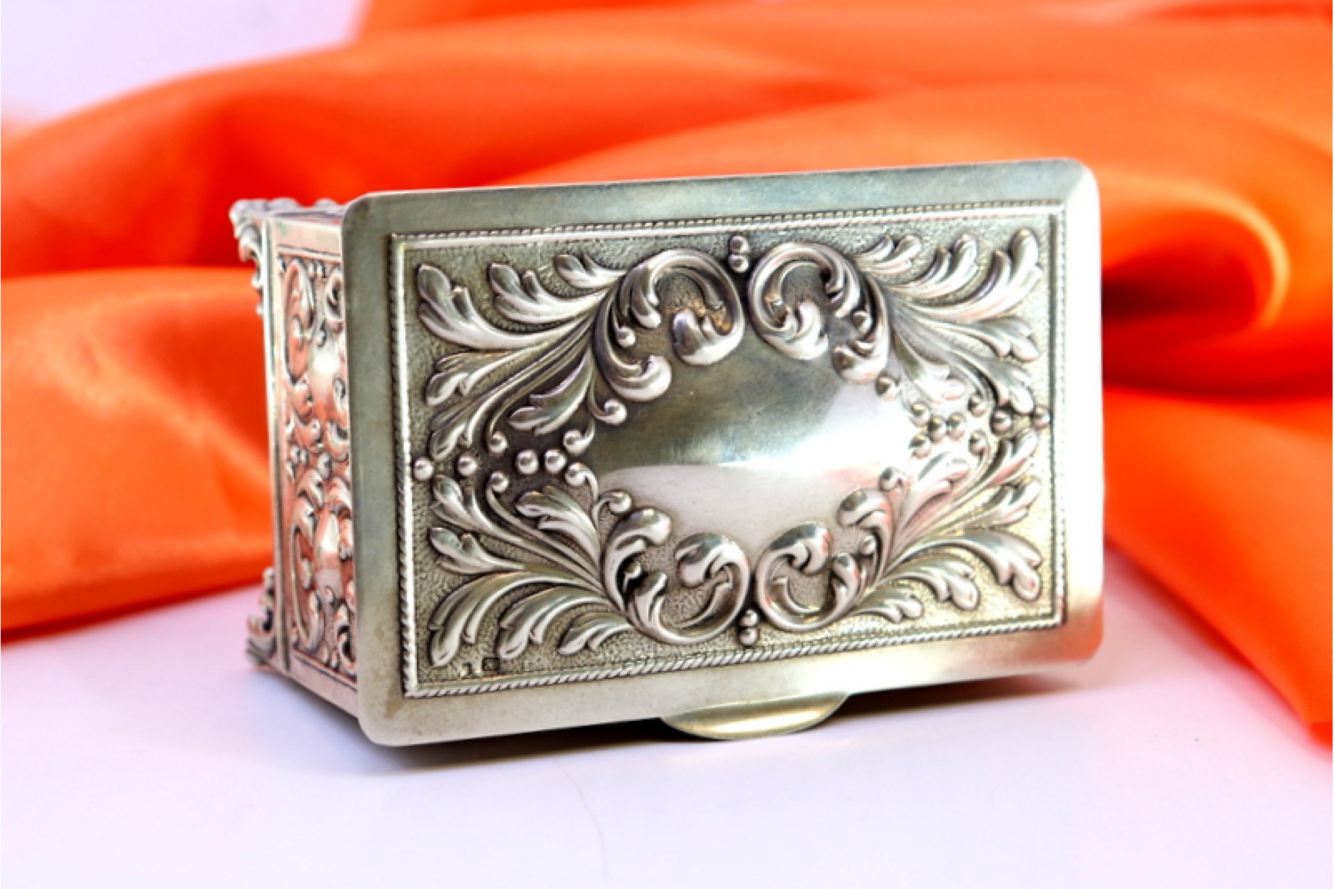 • Descrição: Guarda joias em prata com relevos envolvendo cartela para monograma na tampa e interior aveludado, assente em quatro pés.