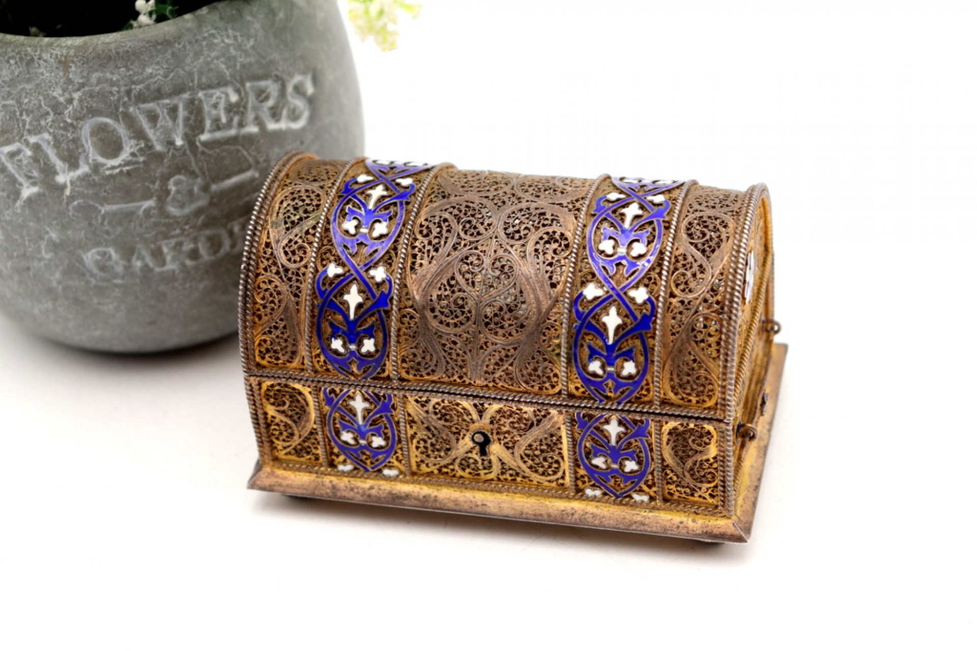 Guarda joias em prata filigrana dourada em forma de baú.