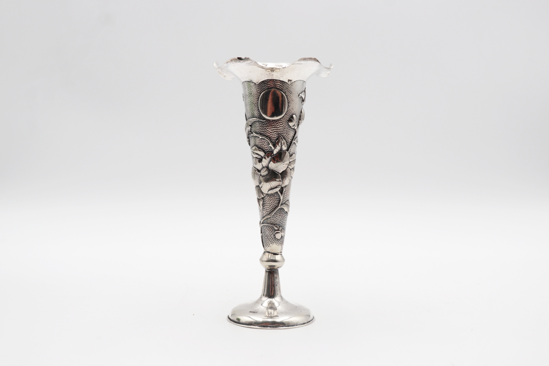 • Descrição: Jarra em prata com relevos florais e bordo ondeado.