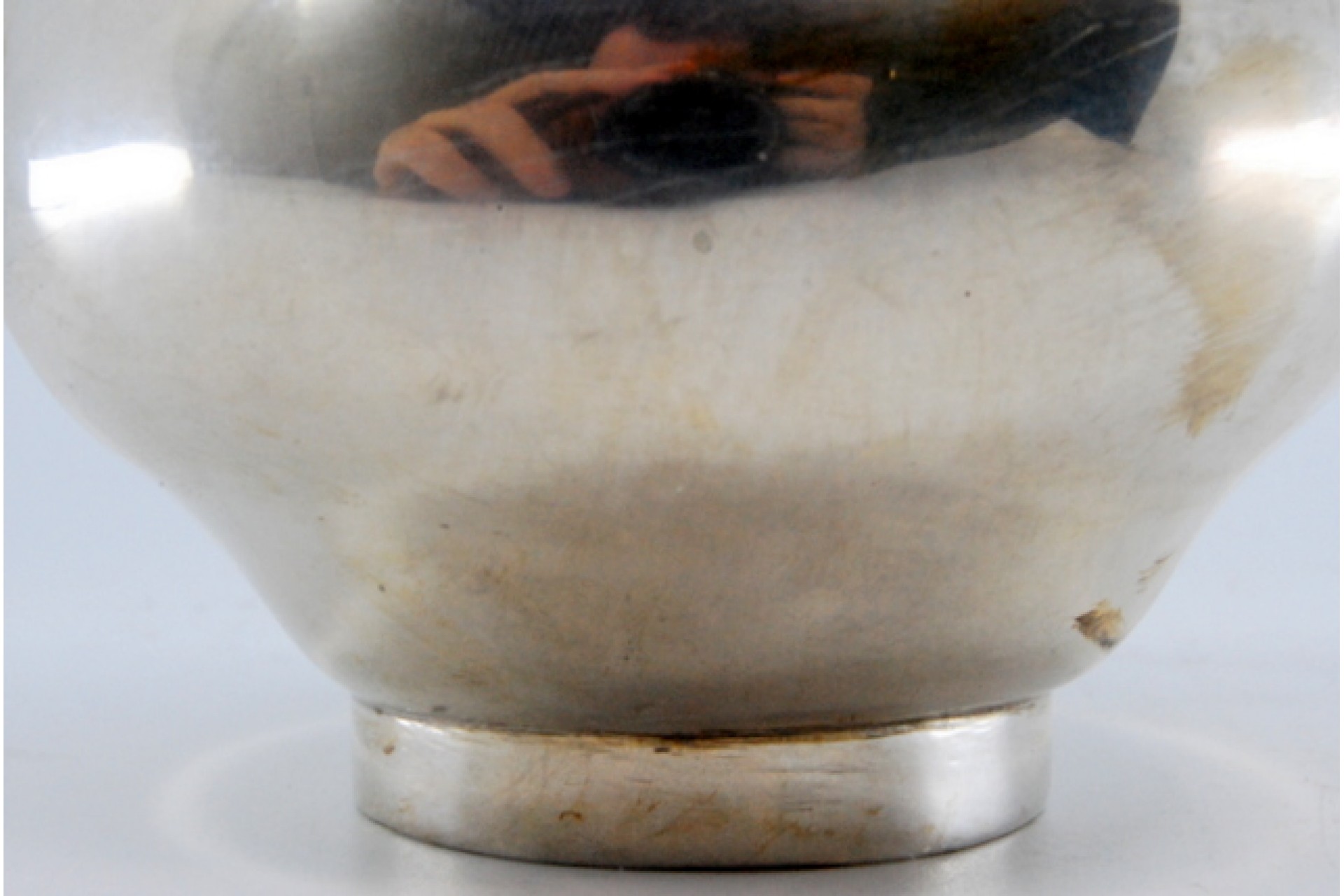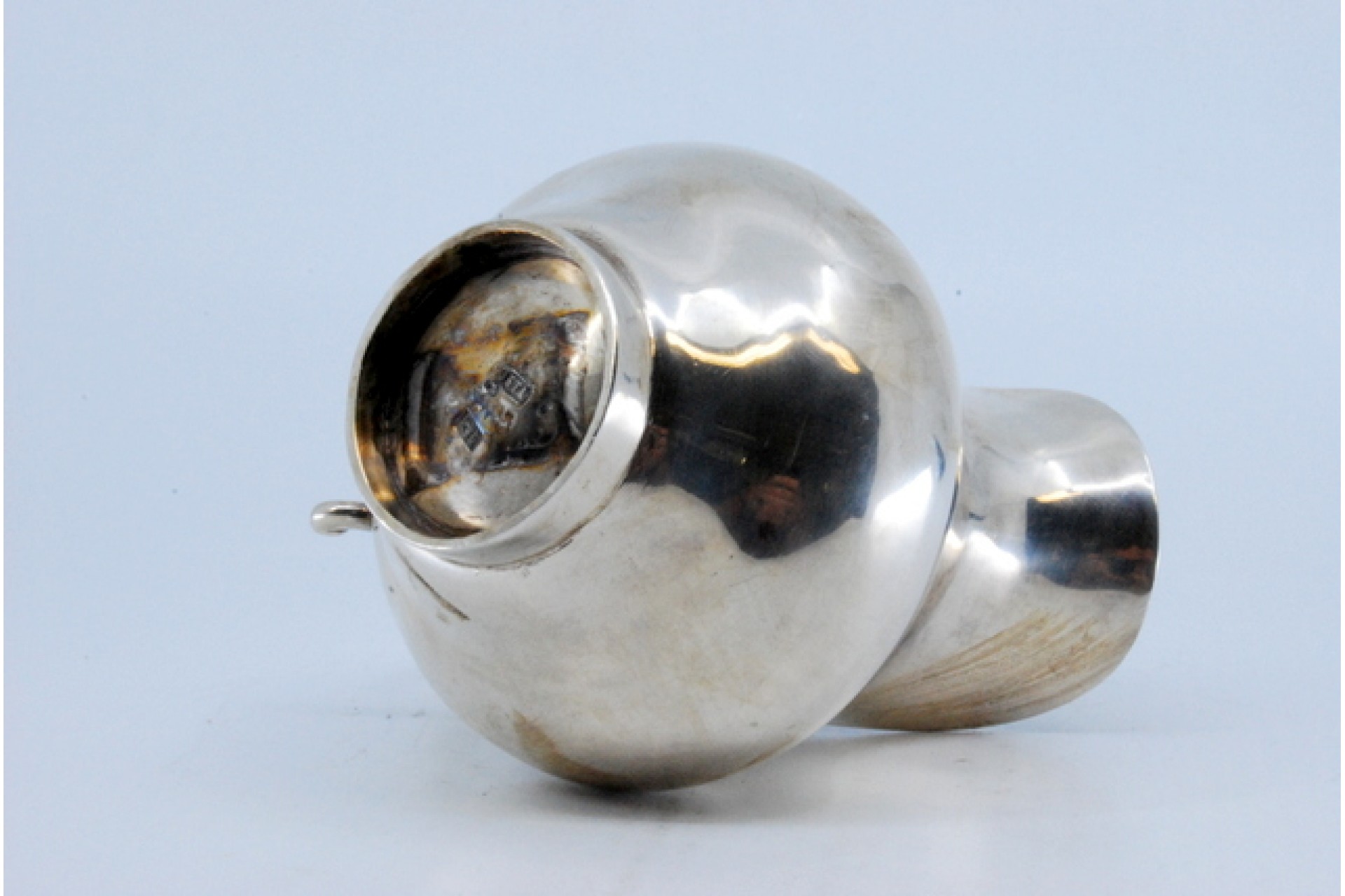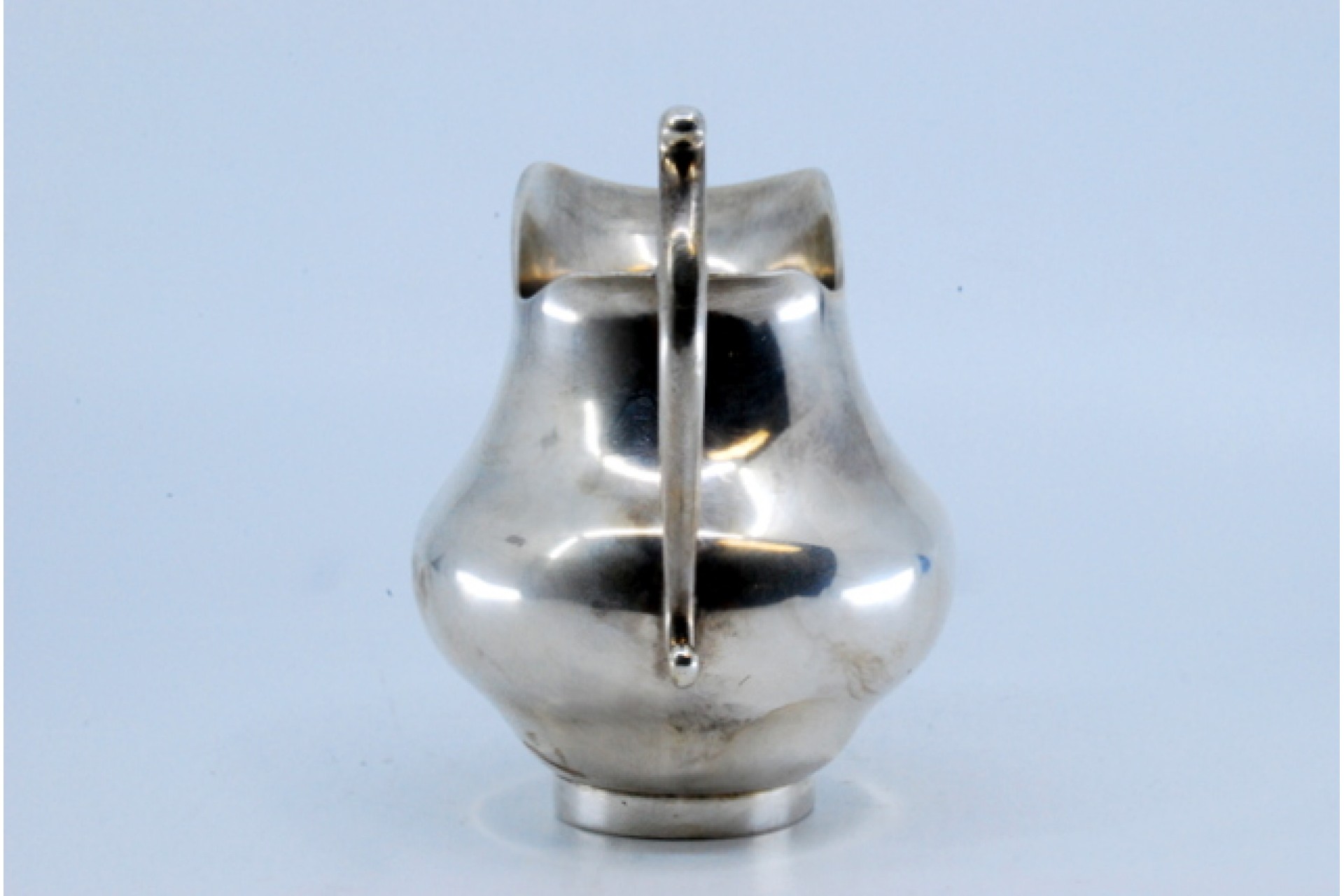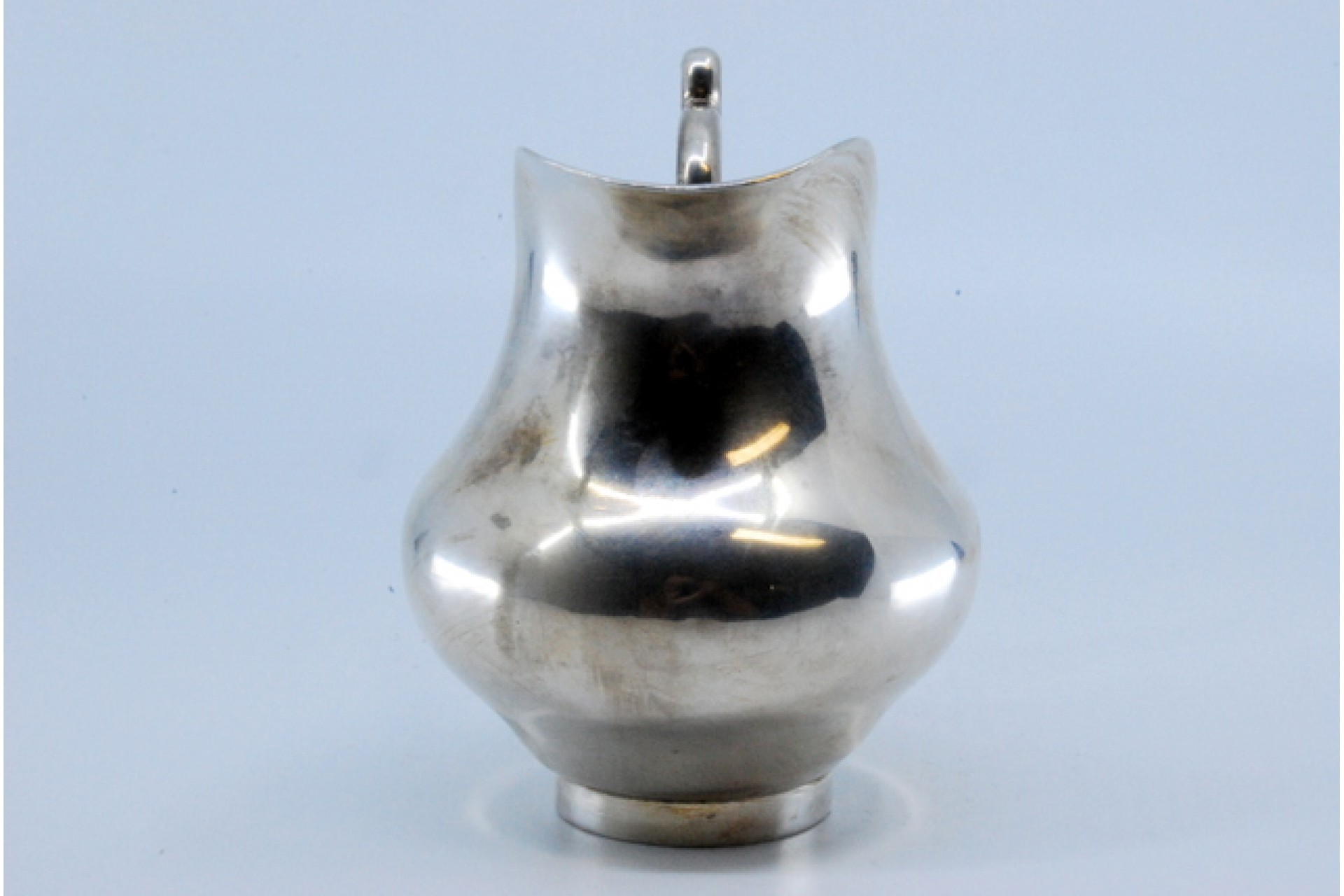 Jarro de água bojudo liso em prata com asa relevada.