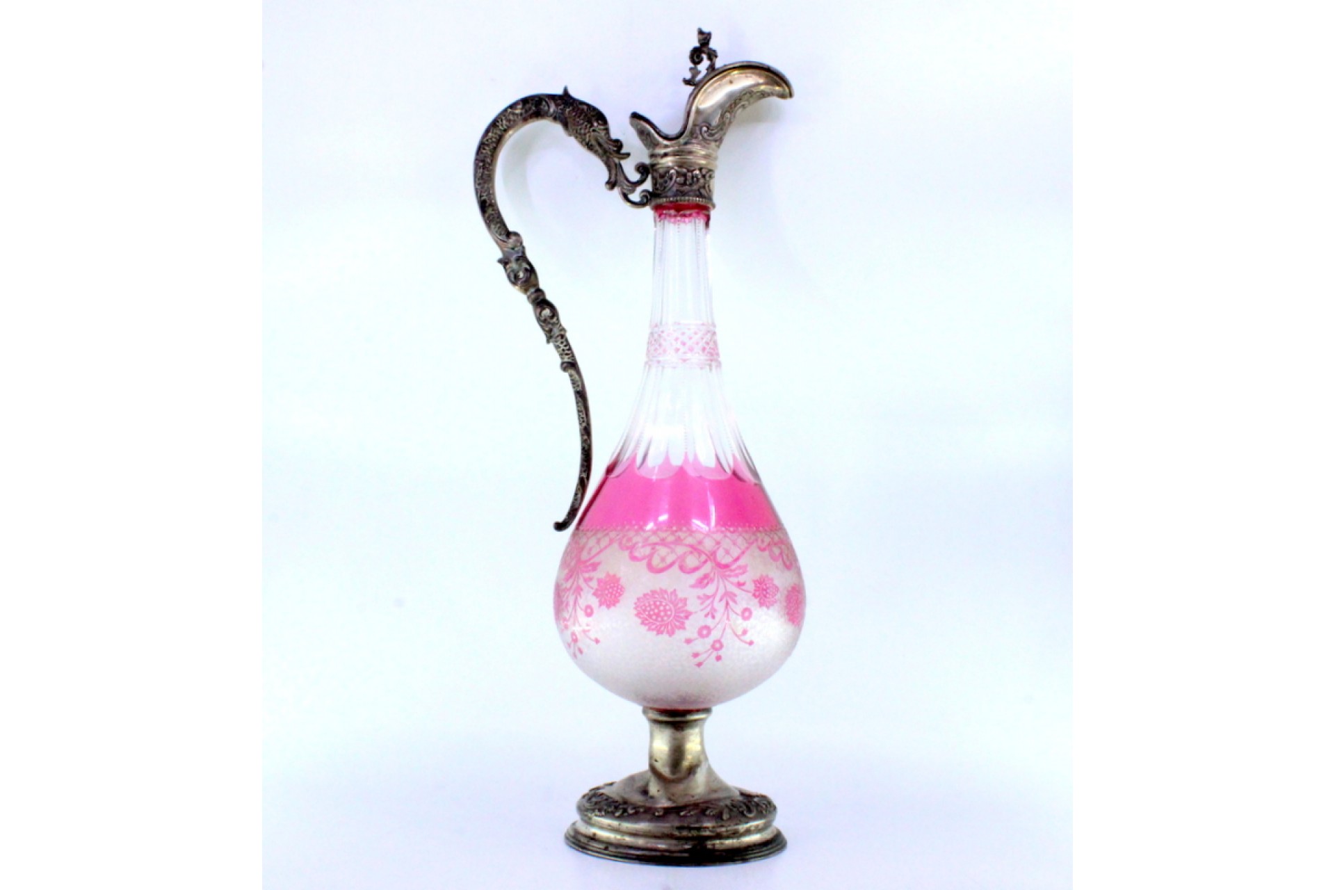 Jarro de vinho em vidro lapidado com estrutura em prata com pomo vazado na tampa basculante e pega em forma de dragão.
