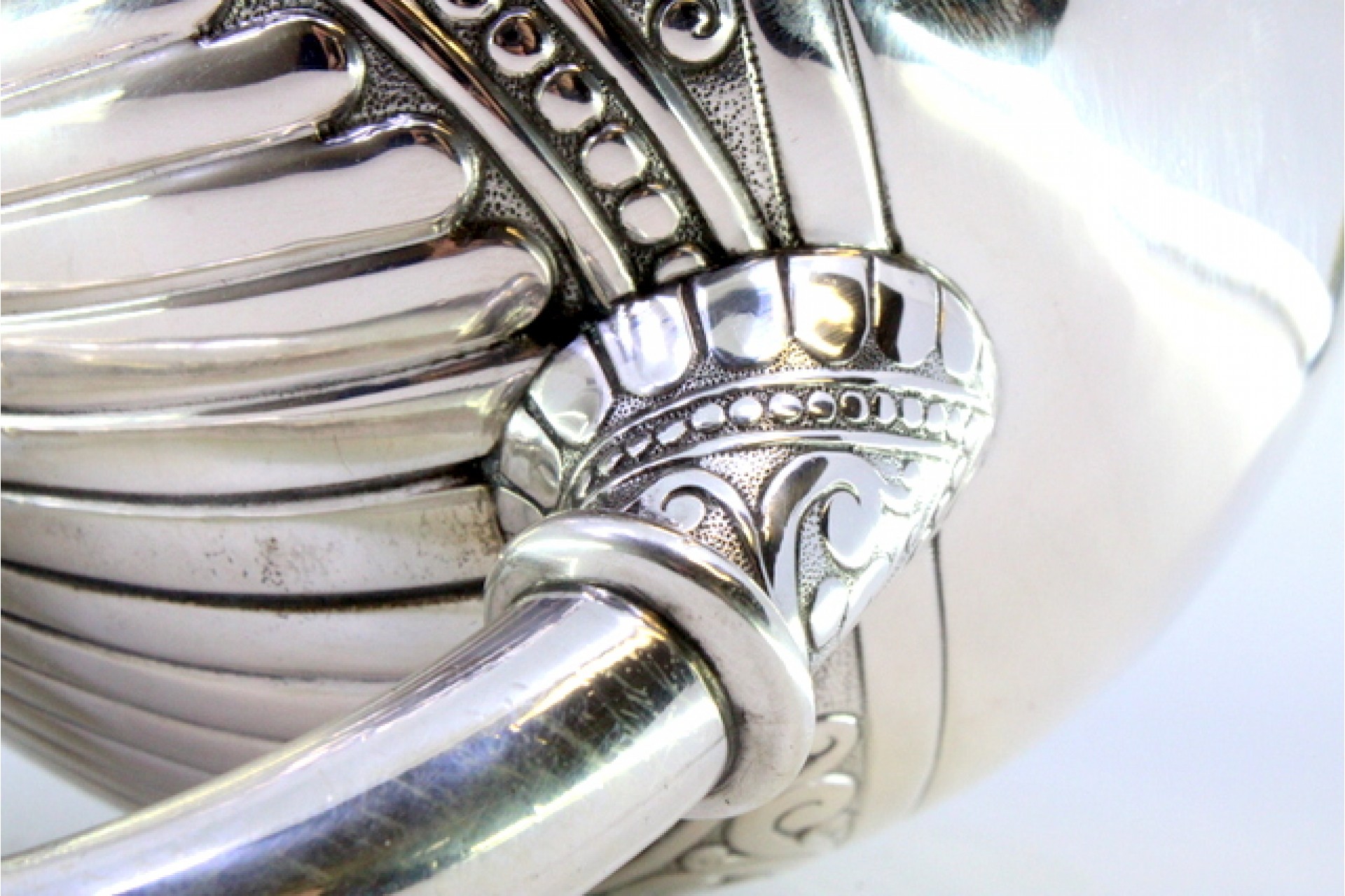 • Descrição: Jarro de vinho em prata canelada em forma bojuda e relevada com frisos perlados.