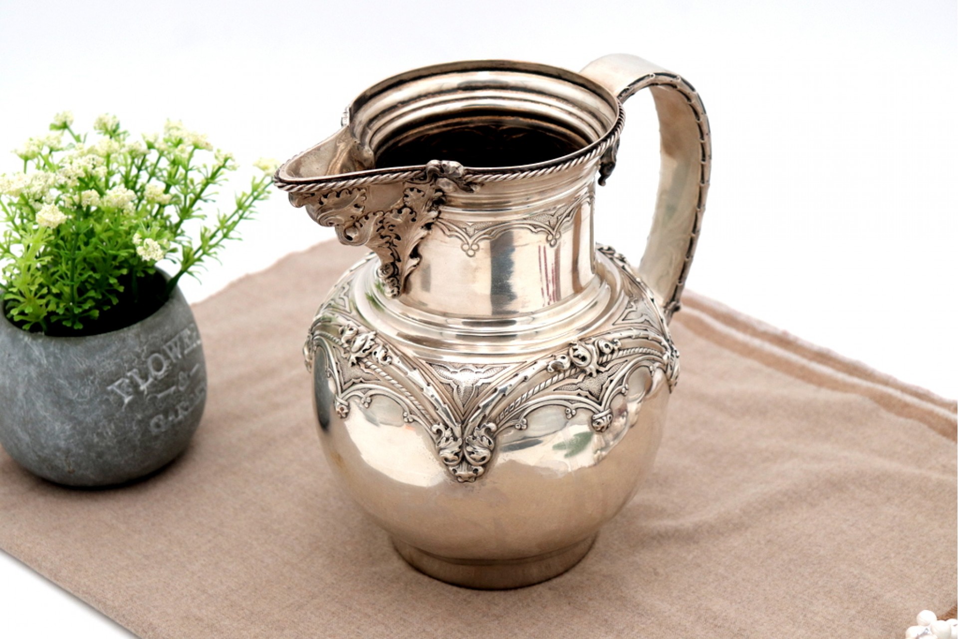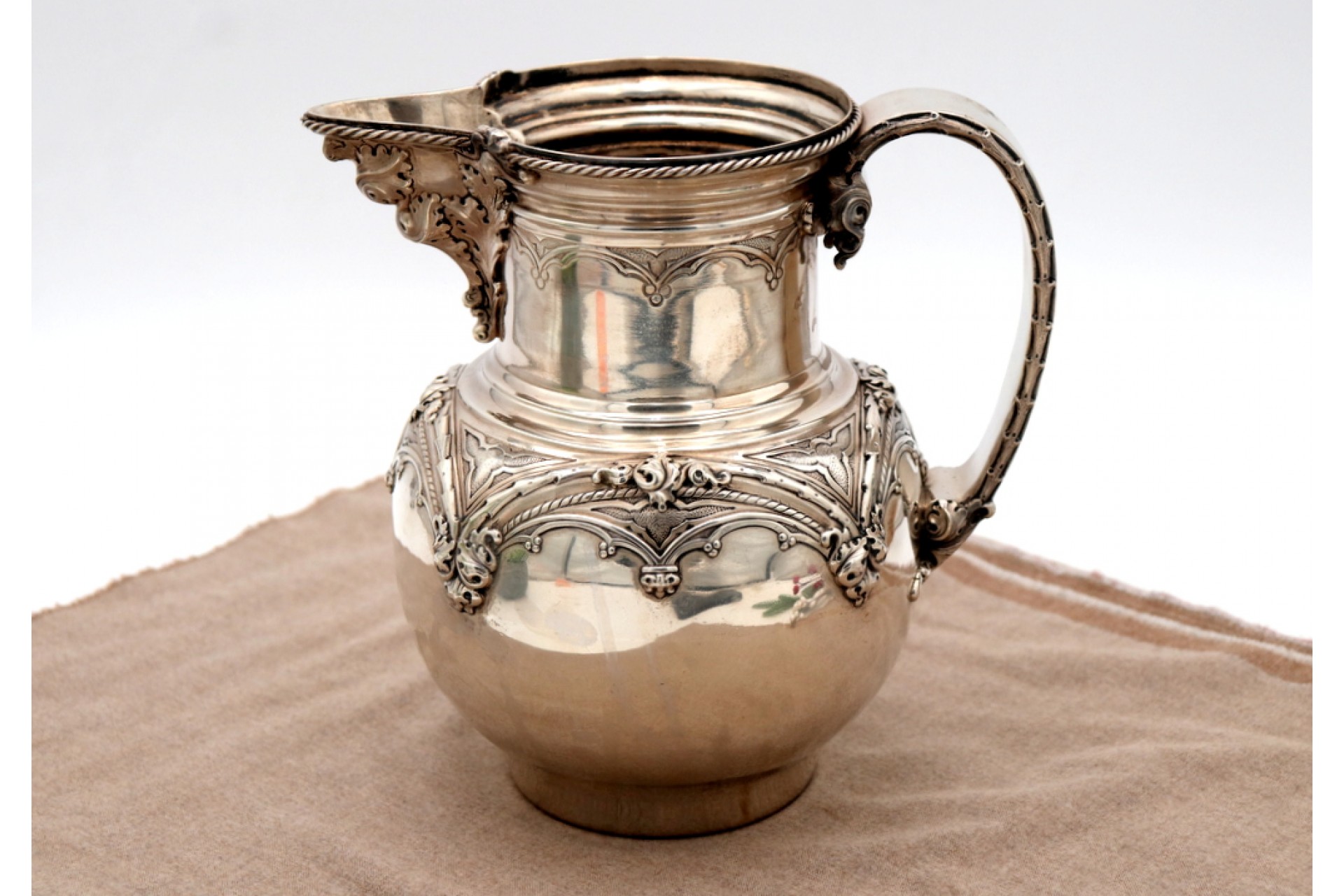 Jarro bojudo em prata para vinho com motivos vegetalistas e grinaldas relevadas