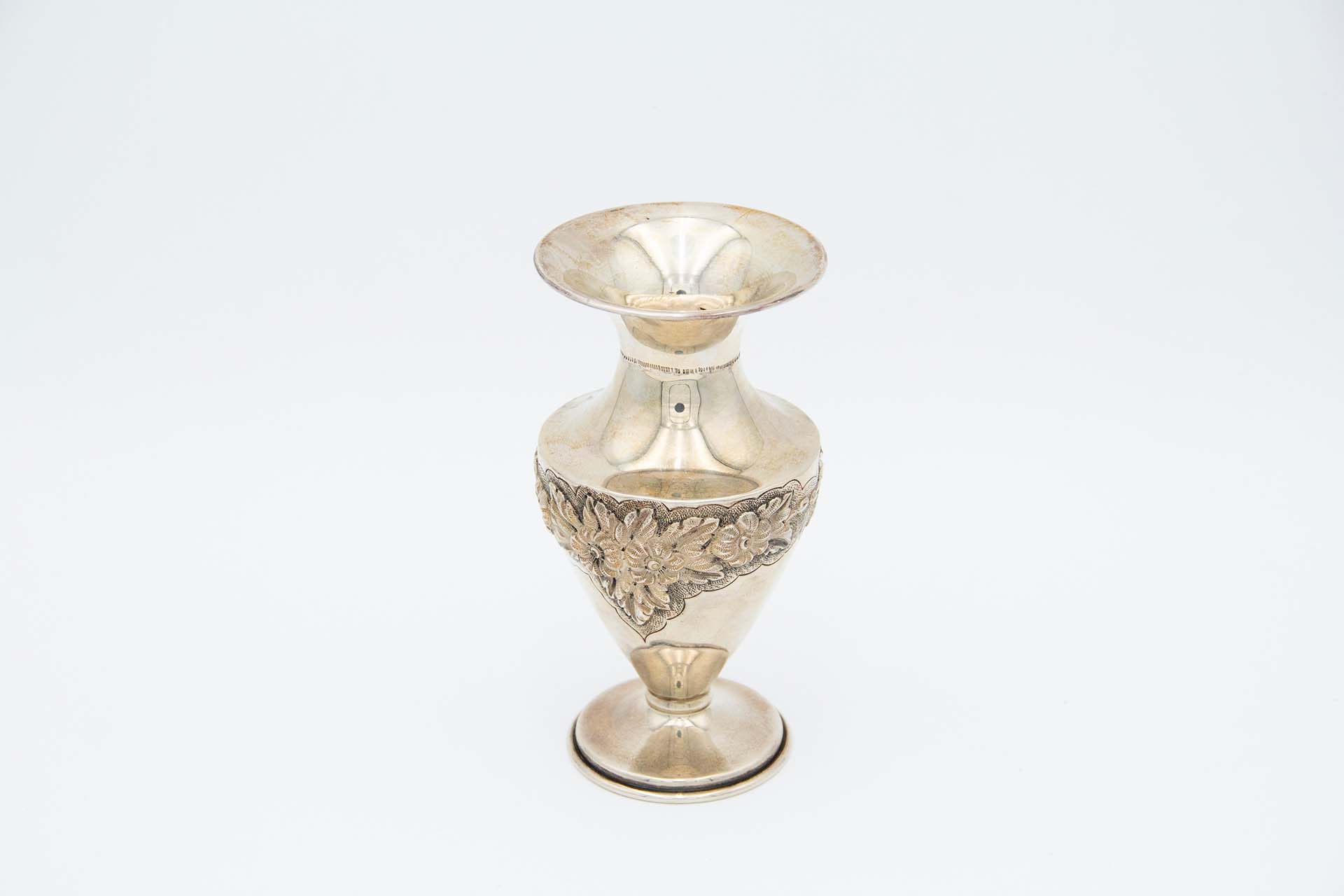 • Descrição: Jarra de prata lisa com motivos florais relevados na envolvência.