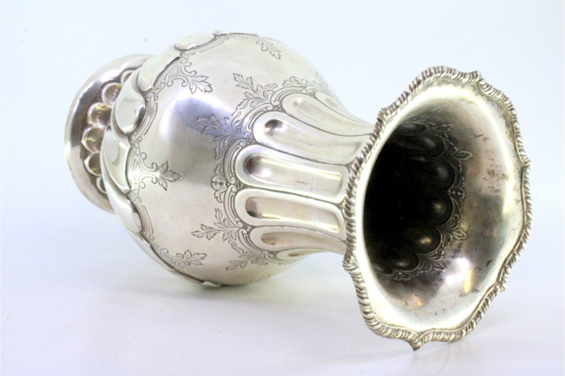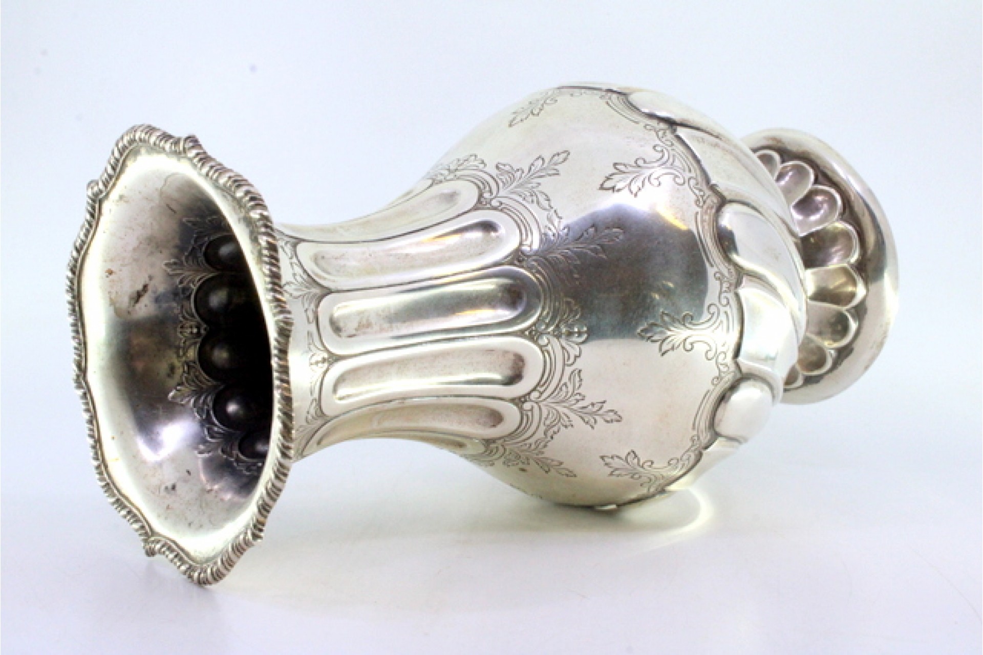 • Descrição: Jarra em prata com caneluras no rebordo e base, motivos florais gravados e friso em forma de corda no bordo.