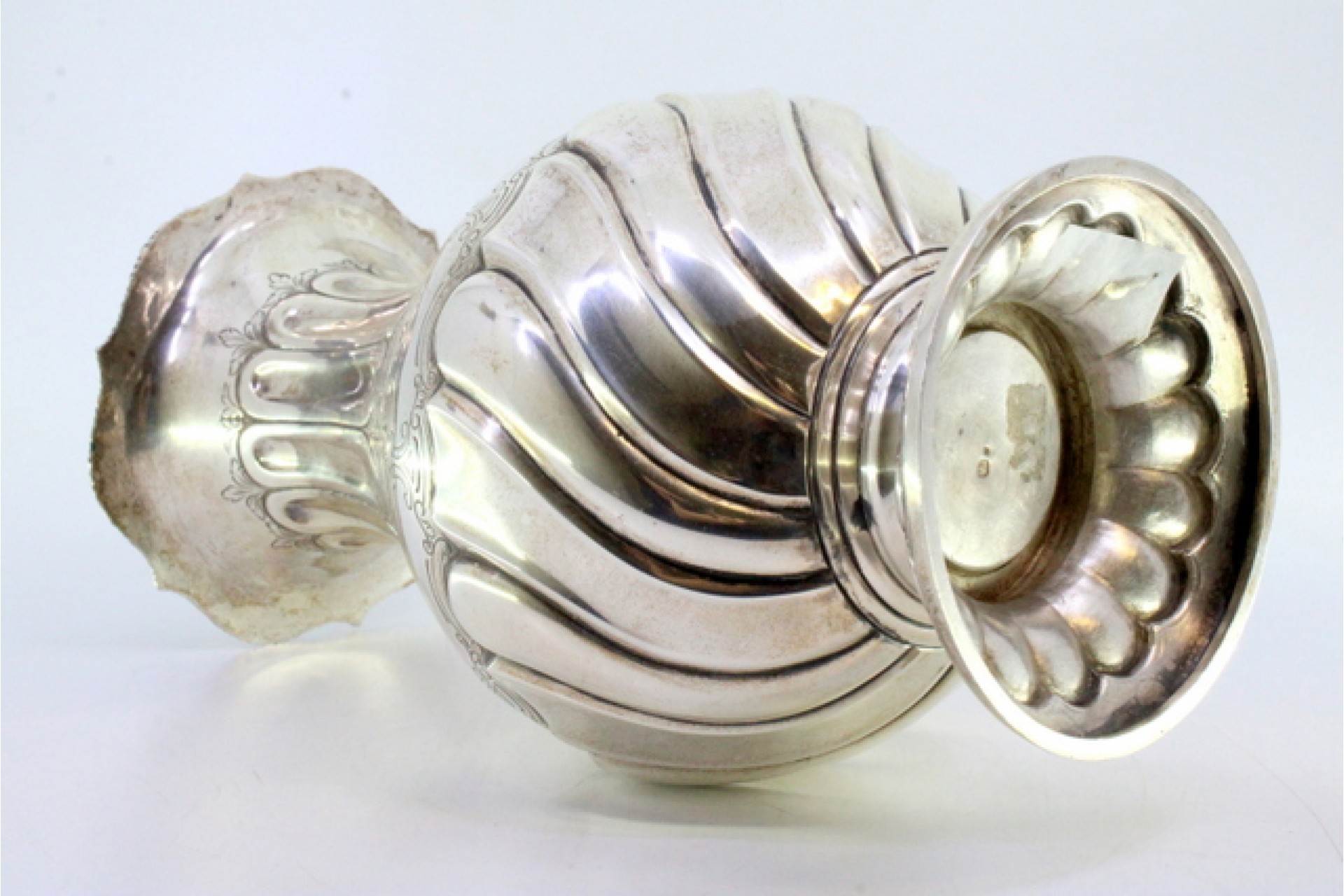 Jarra em prata com caneluras no rebordo e base, motivos florais gravados e friso em forma de corda no bordo.