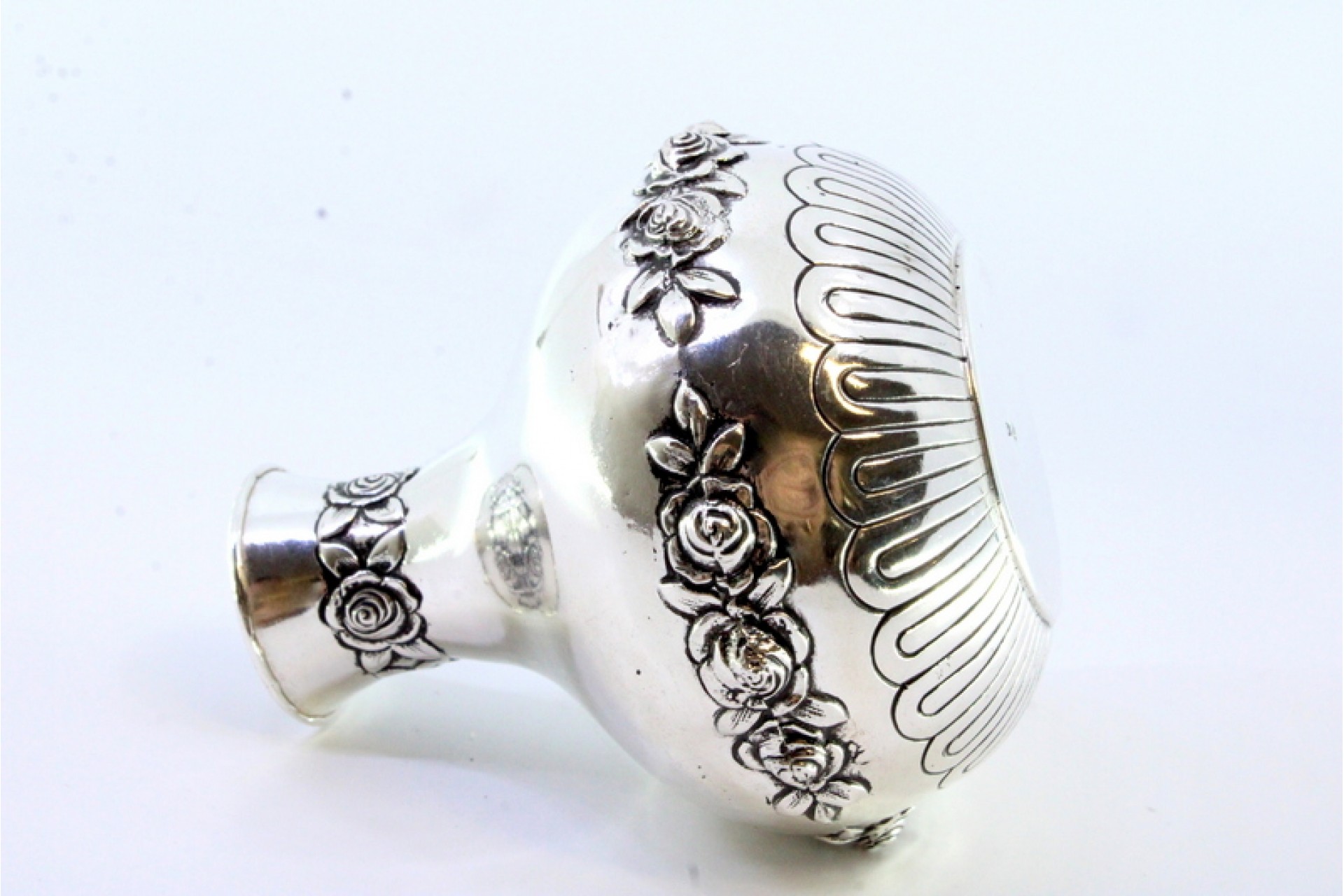 • Descrição: Jarra pequena em prata com motivos florais relevados e gravados na base.