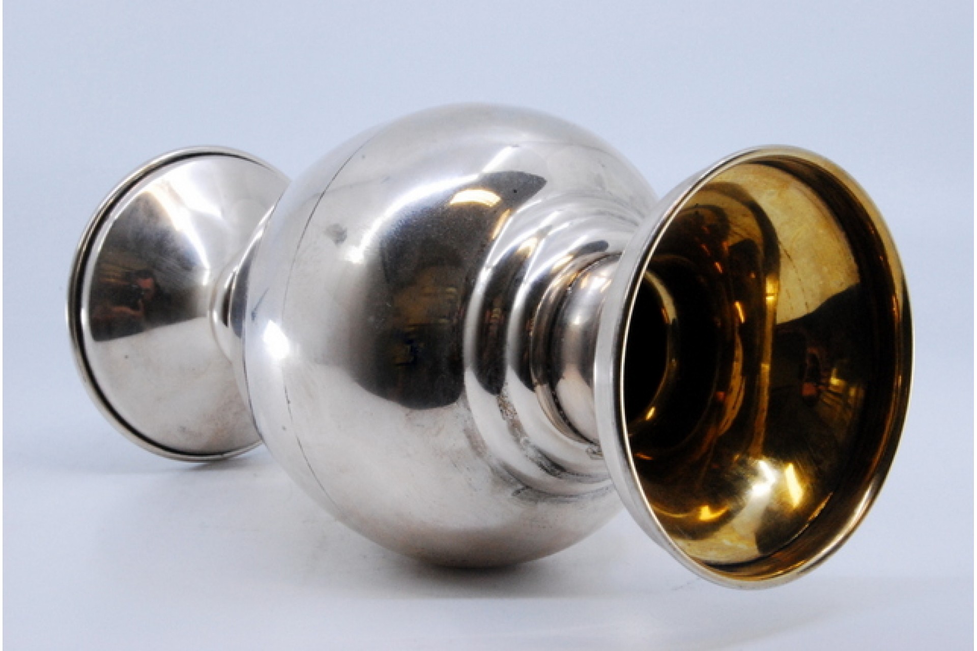 Jarra pequena em prata lisa com base circular e dourado no interior.