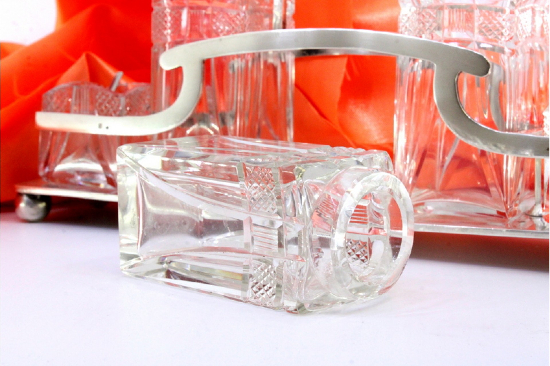Licoreiro com estrutura em prata , duas galhetas em vidro lapidado, mostardeira