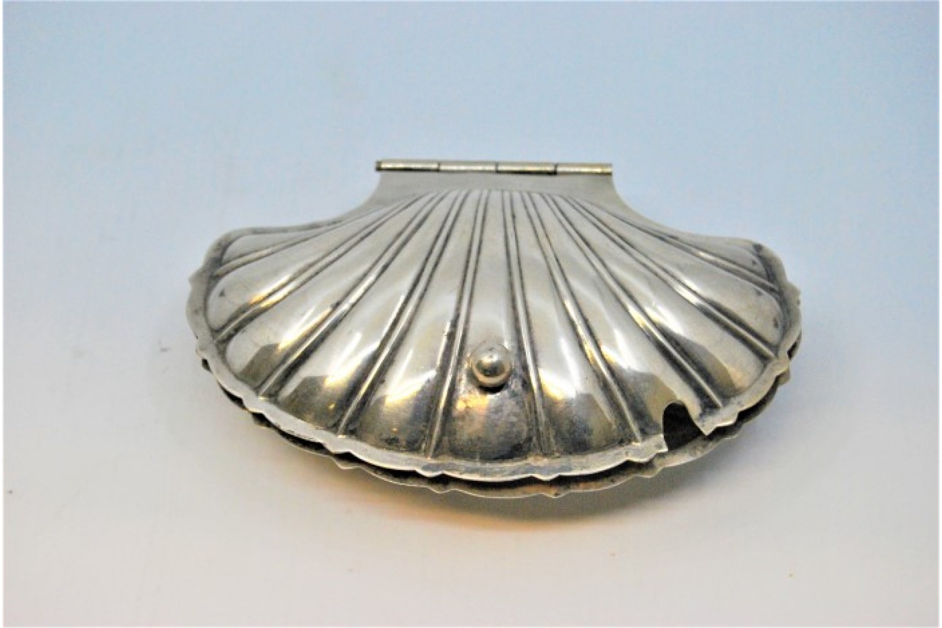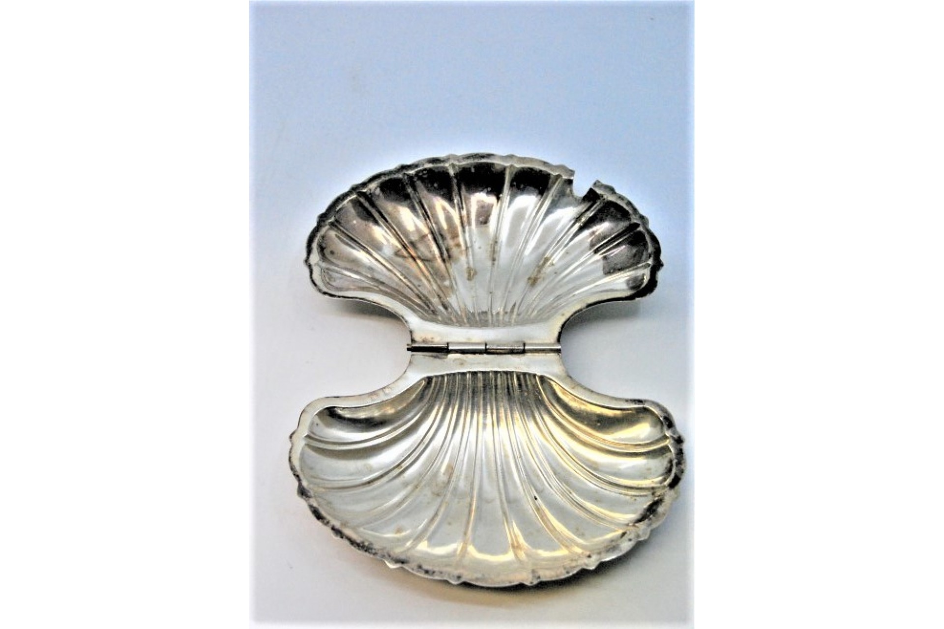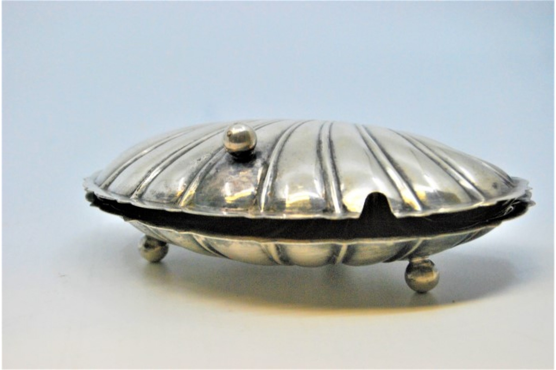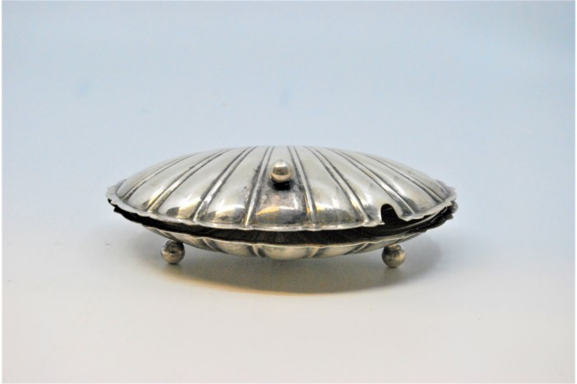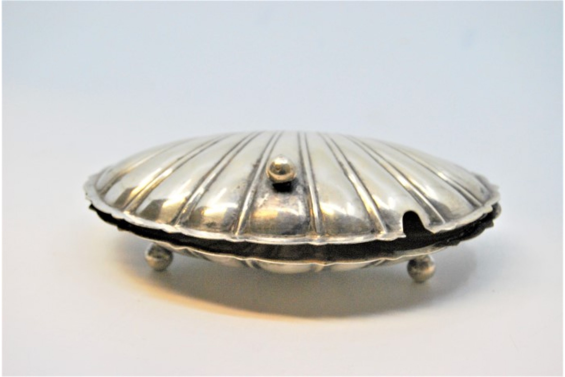 Manteigueira de prata em forma de dupla concha e assente sobre três pés.