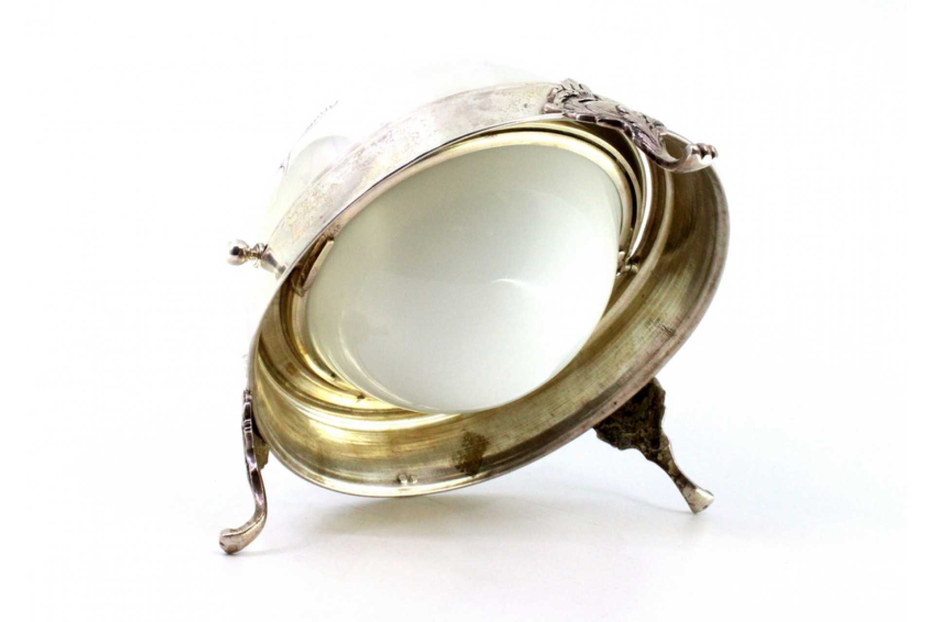 • Descrição: Manteigueira em prata com aplicações reveladas, alma em vidro branco e pomo concheado na tampa com cartela para monograma com assente em três pés em forma de garras.
