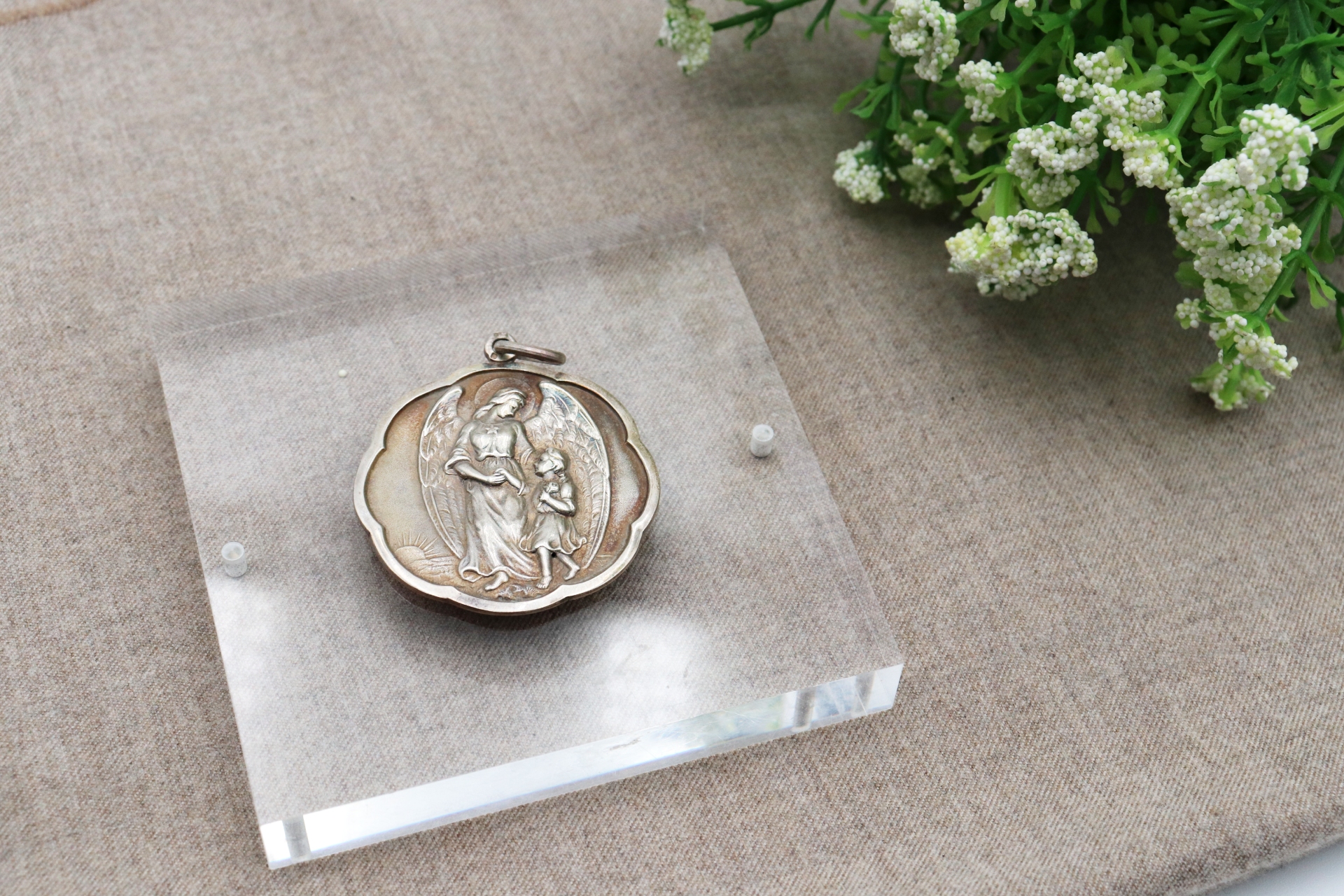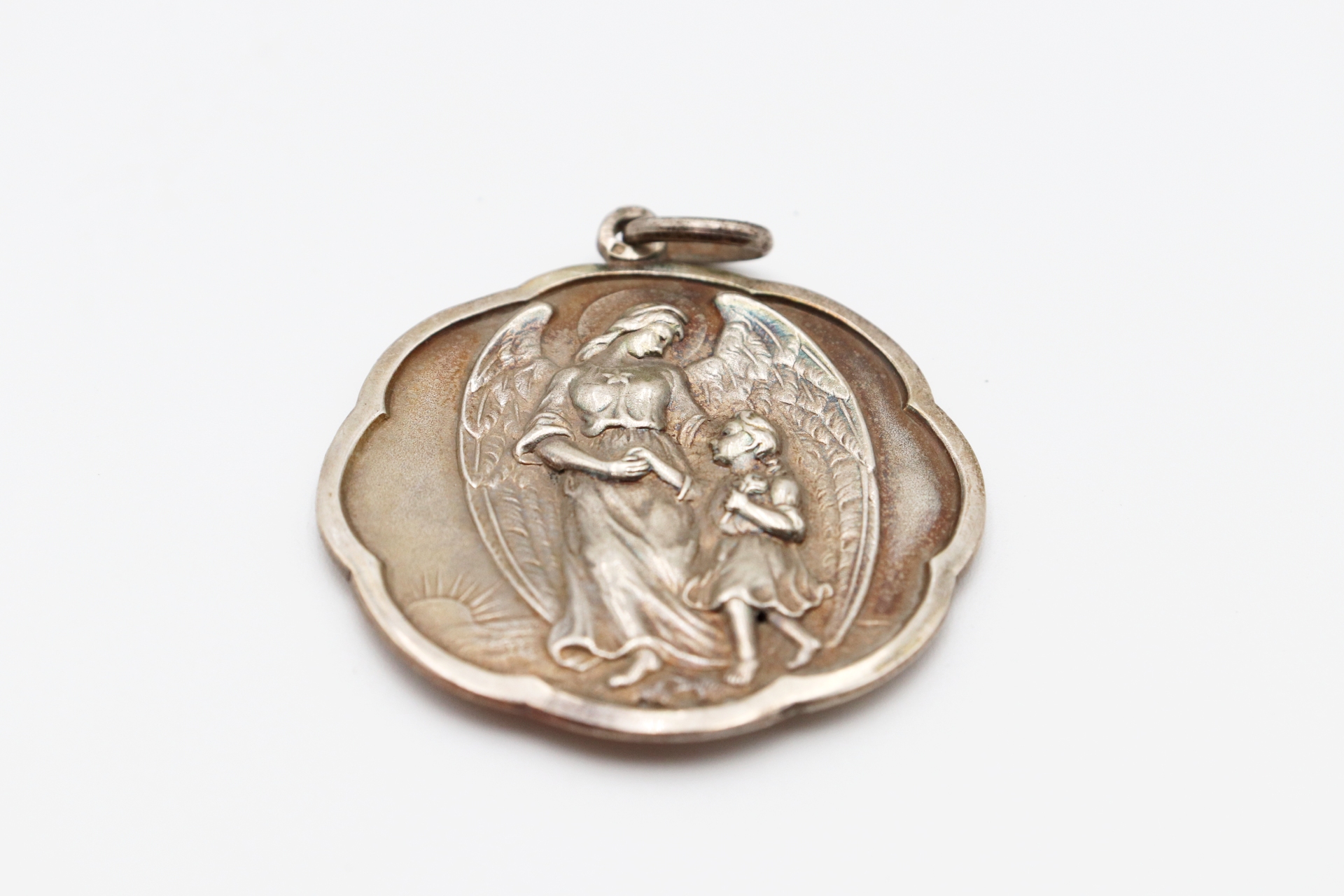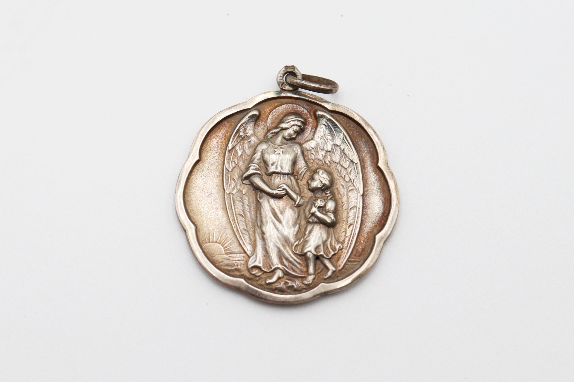 Medalha de prata com friso e aplicação figura de Anjo da Guarda e criança