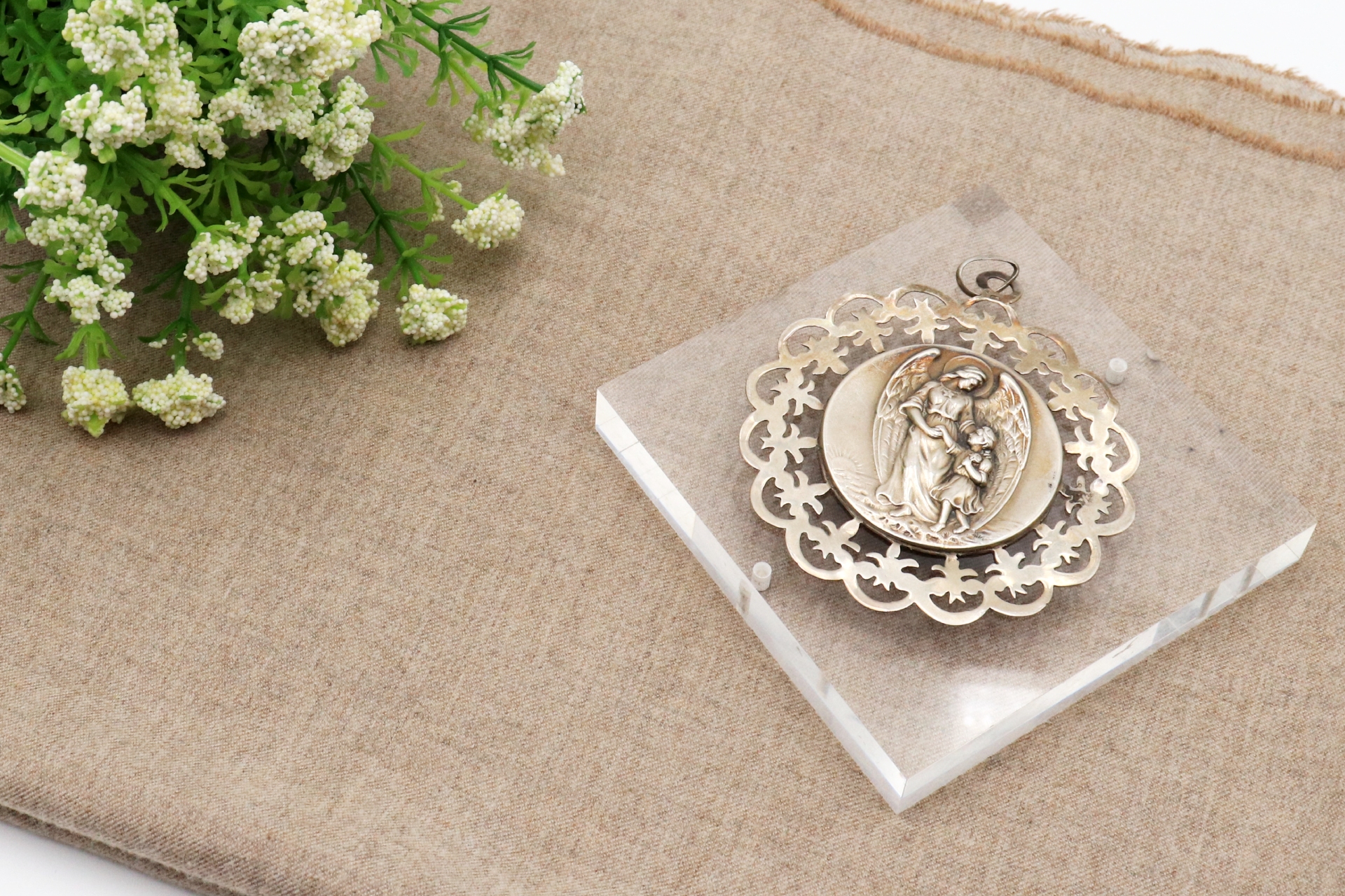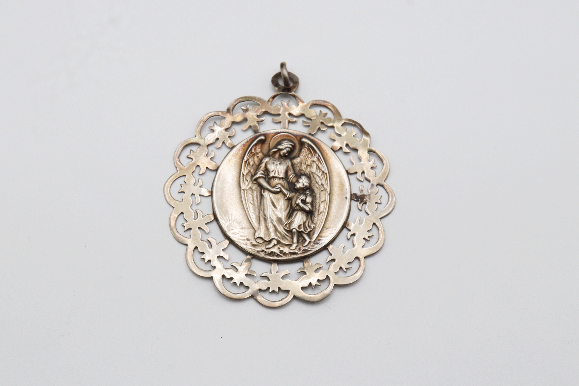 Medalha de prata recortada com figura de Anjo da Guarda e criança no centro