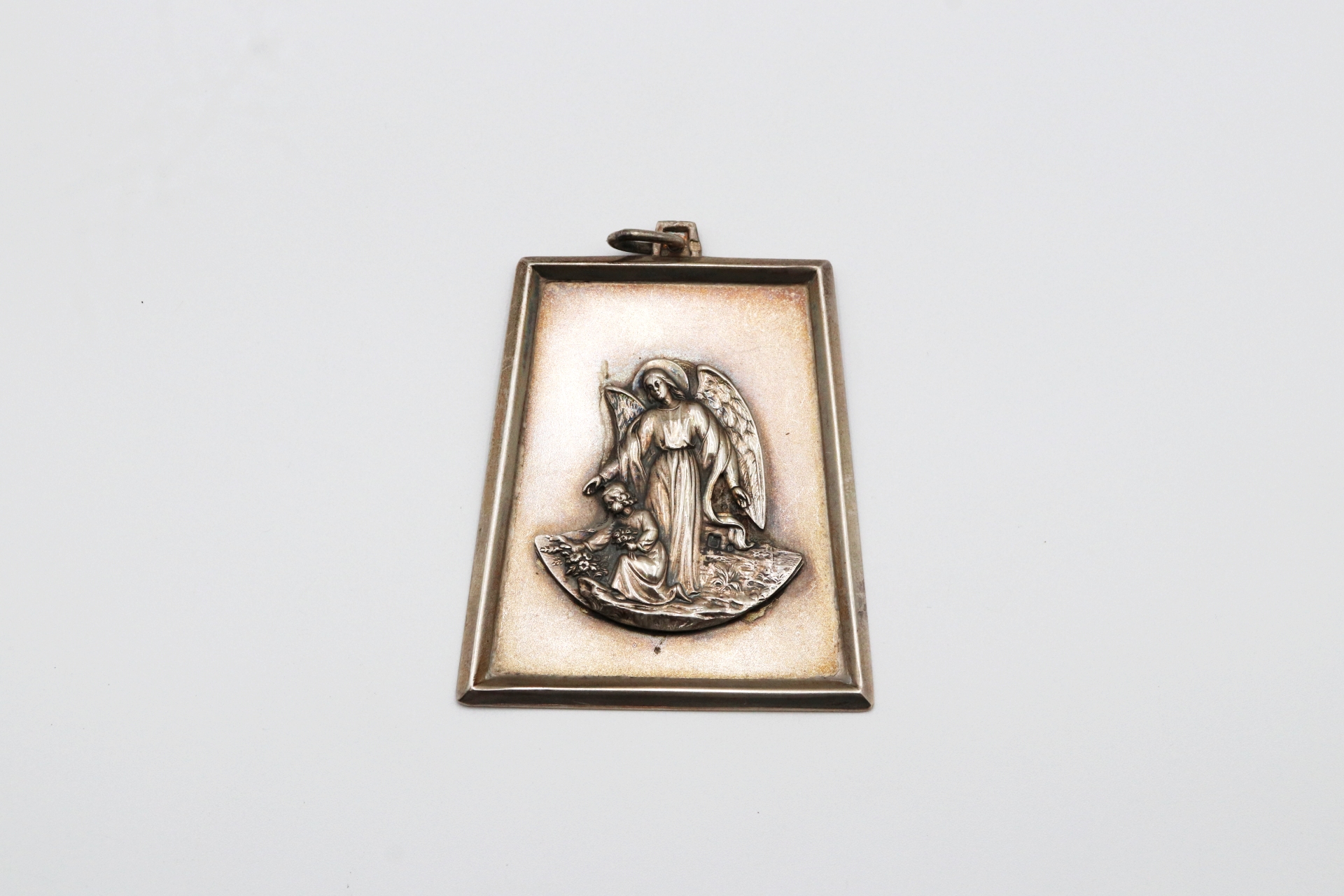 • Descrição: Medalha de prata com moldura e representação de Anjo da Guarda e menino em alto relevo.