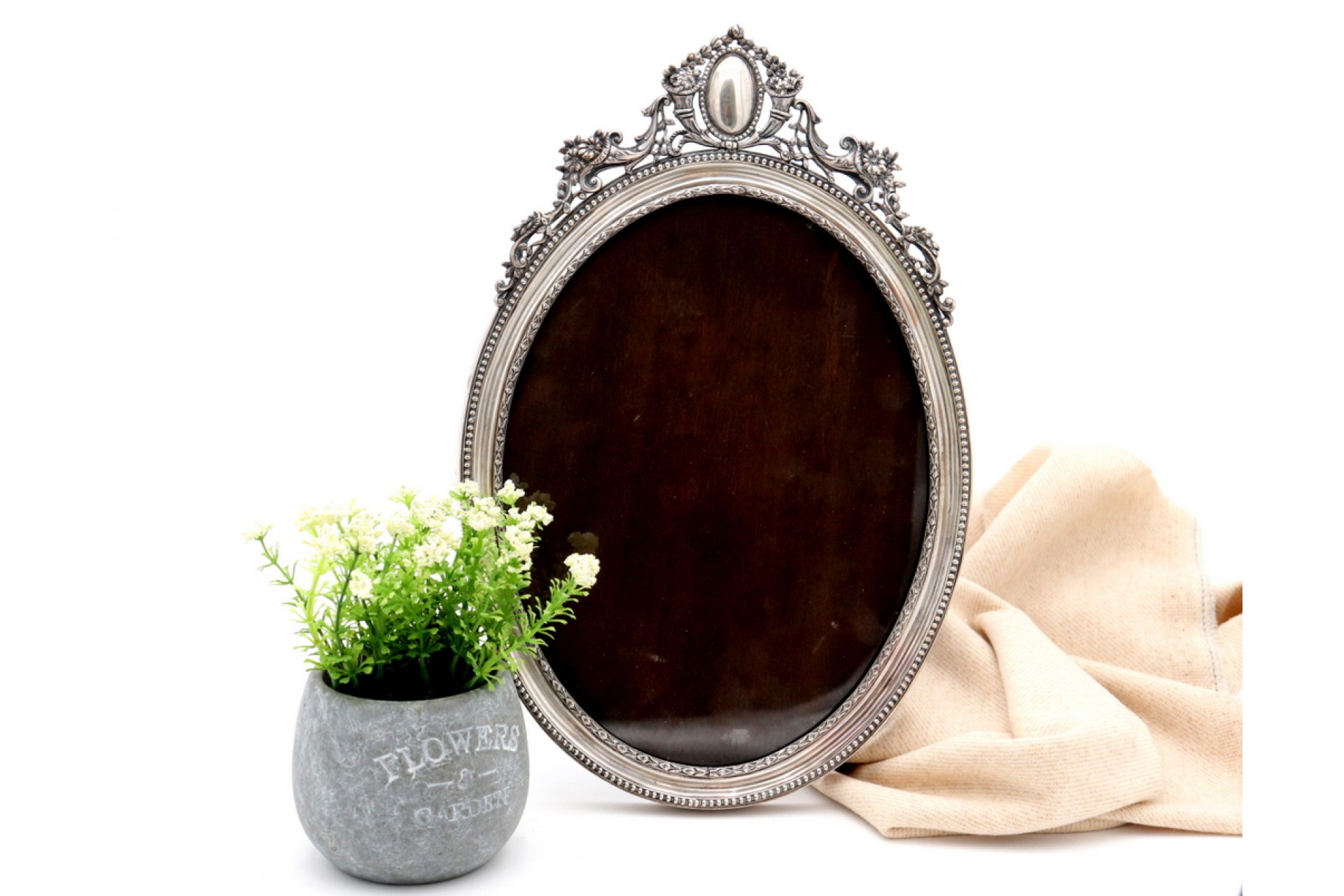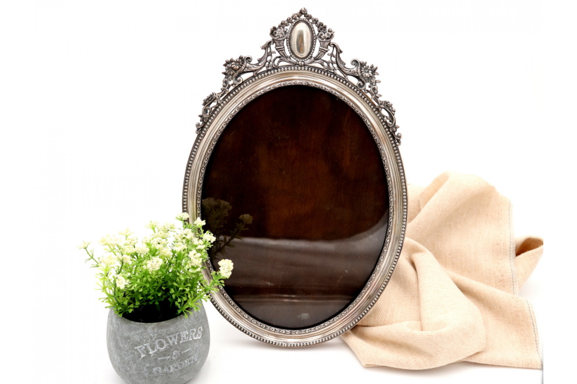 • Descrição: Moldura em prata de formato elíptico com relevos e aplicações perladas, com cartela para monograma.