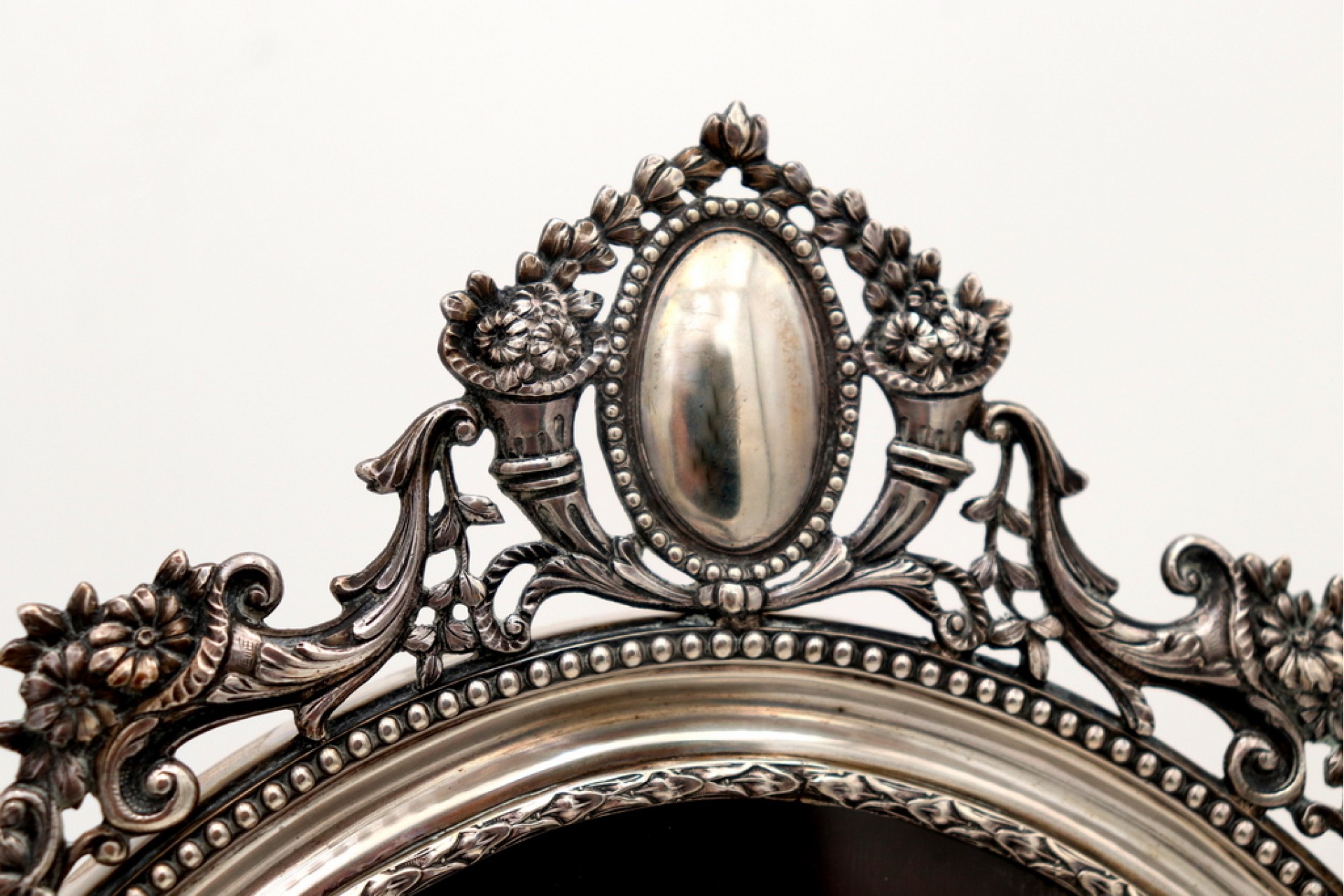 Moldura em prata de formato elíptico com relevos e aplicações perladas
