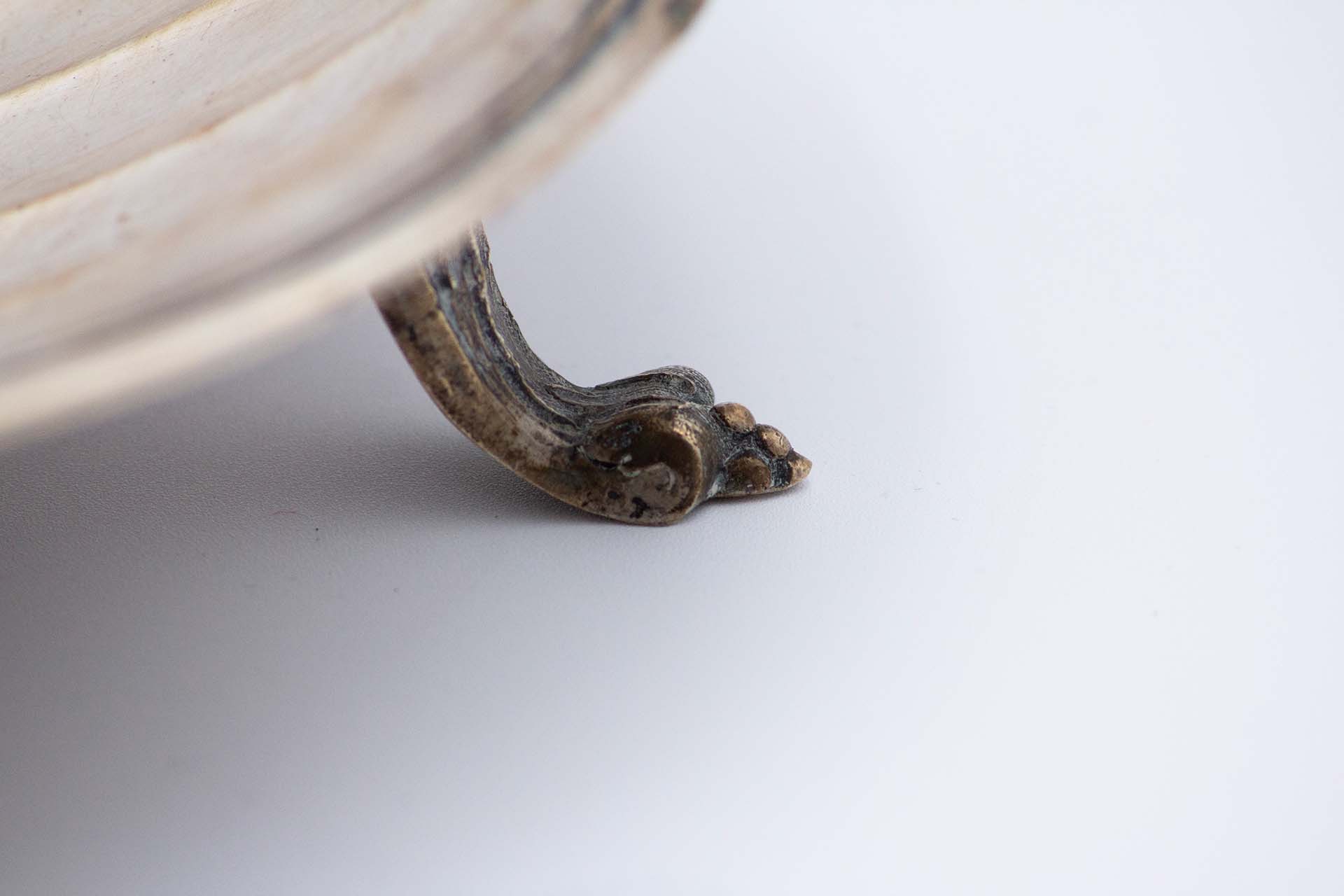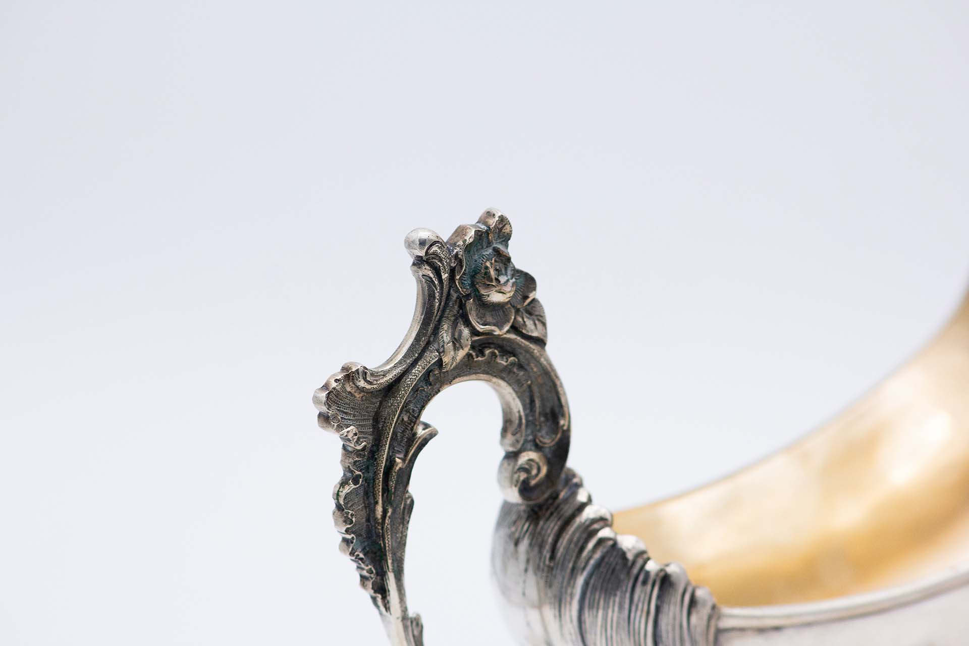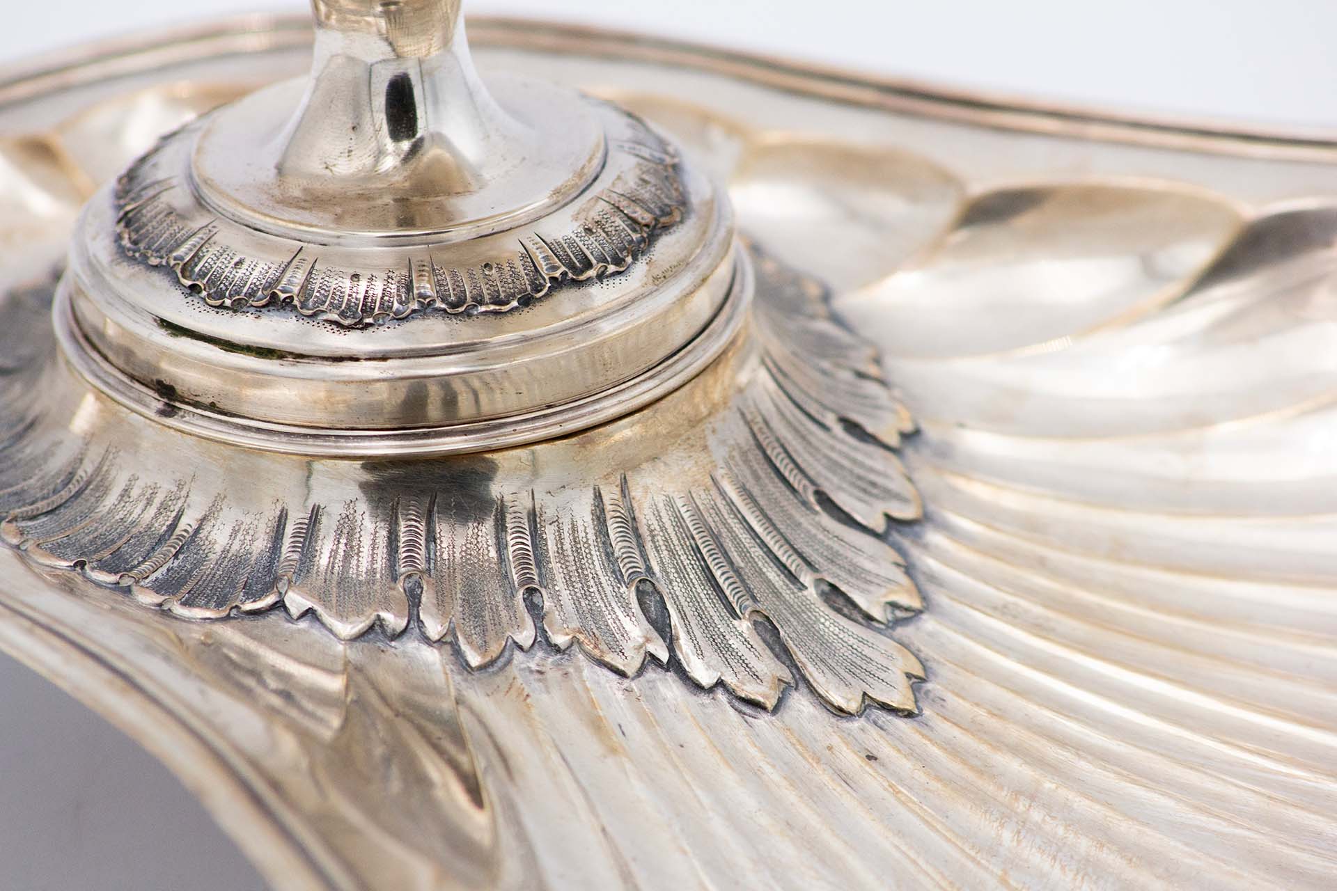 • Descrição: Molheira de prata em forma de nave de asa relevada e prato gomado com aplicação de folhas de acanto, assente em três alteados relevados.