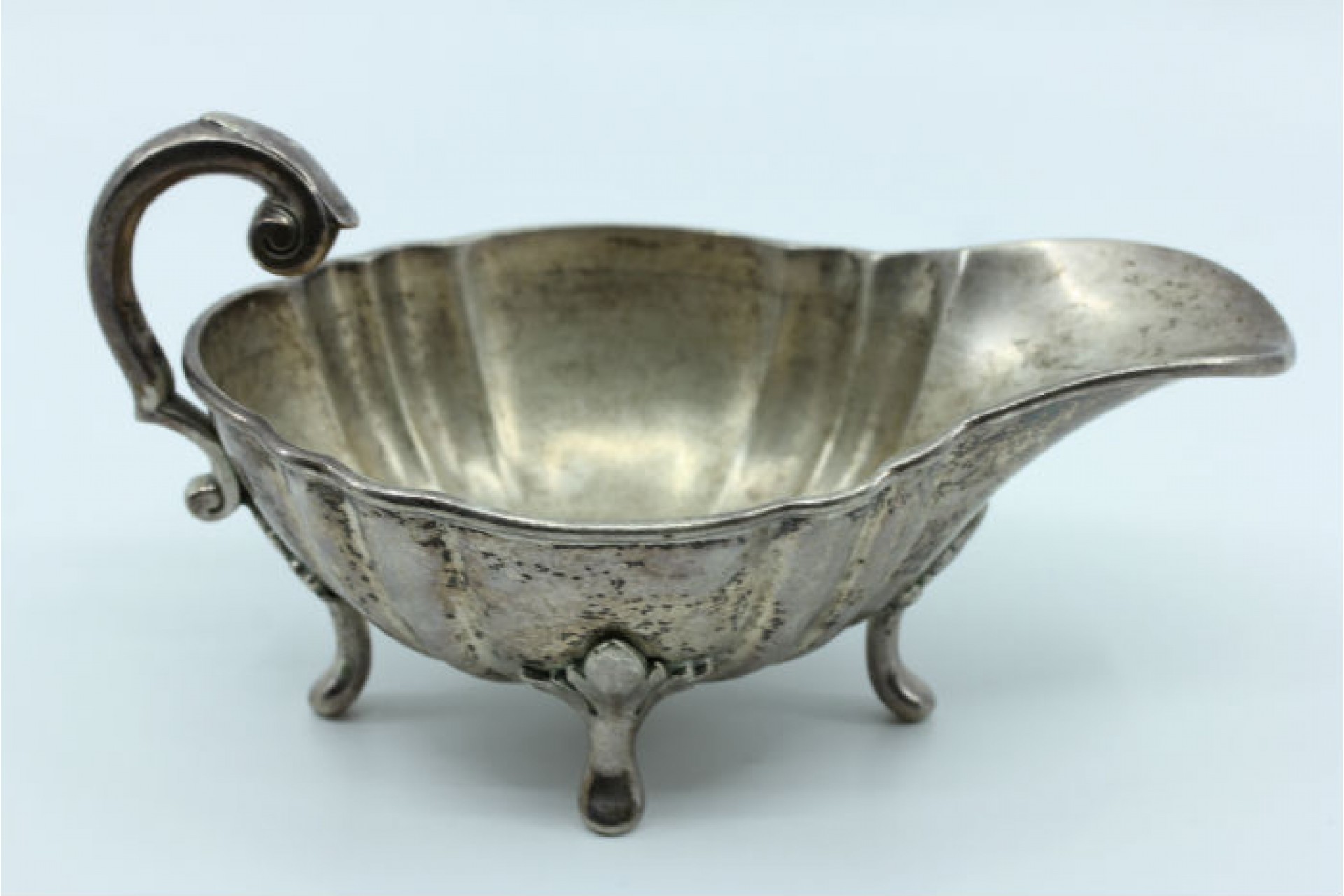 • Descrição: Molheira de prata gomada com frisos na envolvência de asa perdida e assente sobre quatro pés.