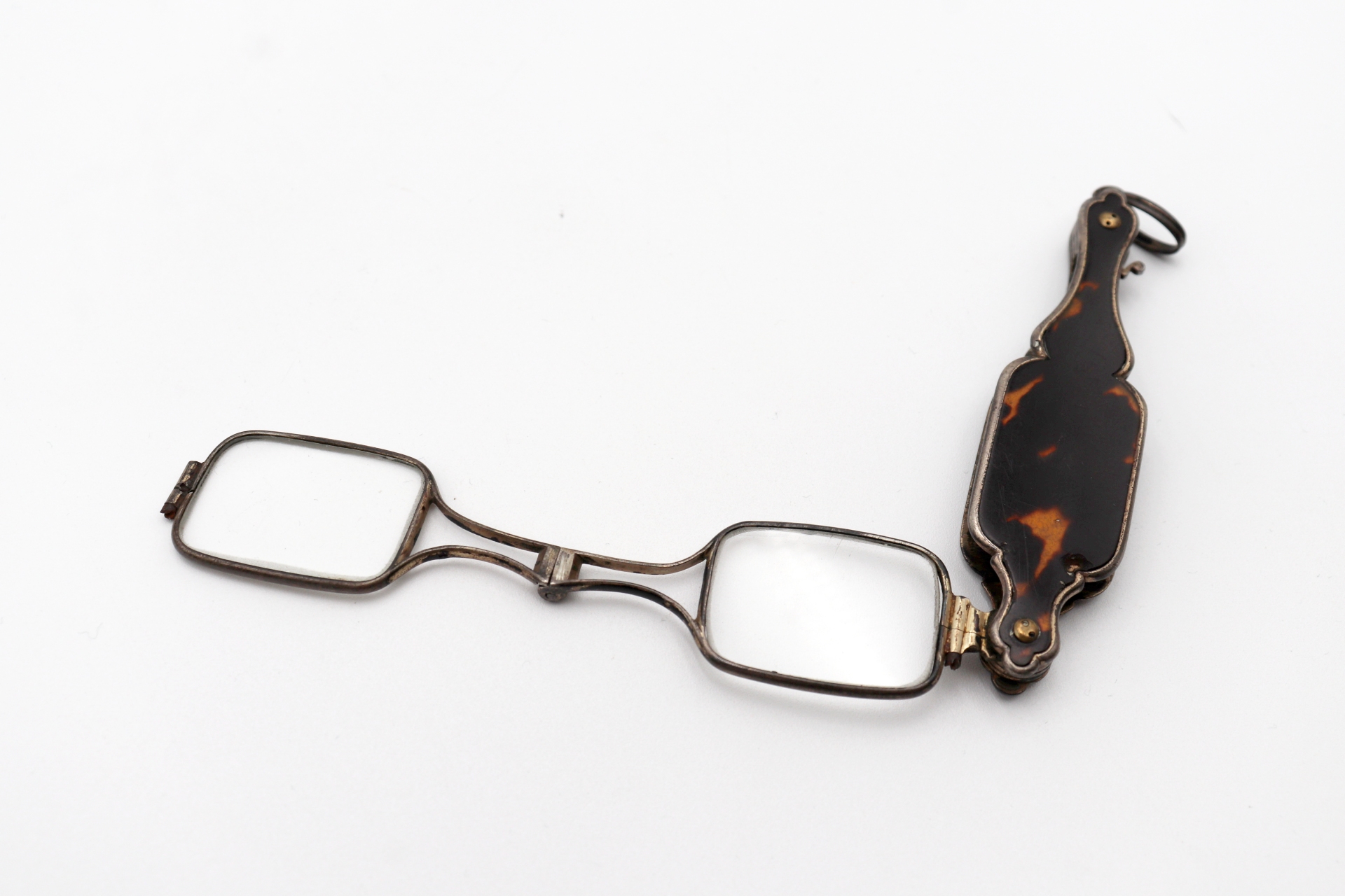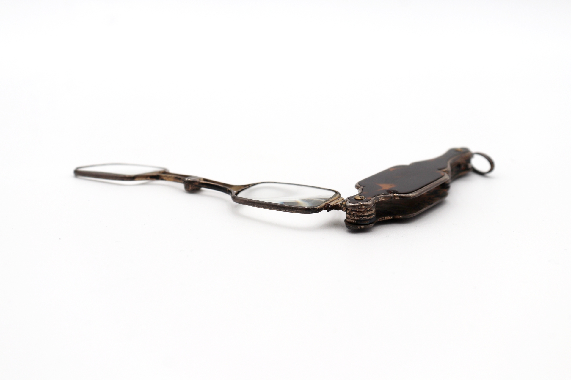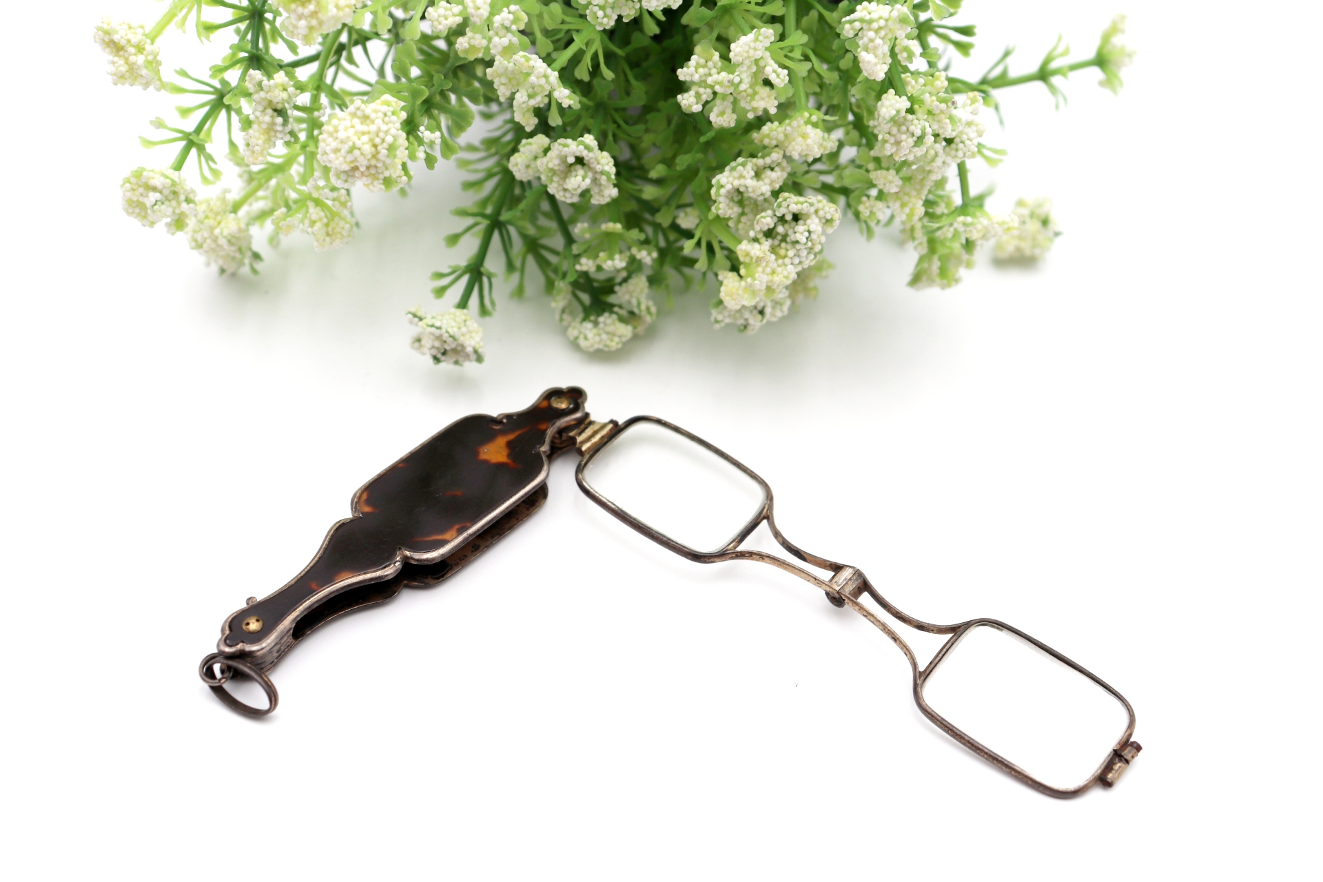 Lorgnon em prata com cobertura de tartaruga no cabo e sistema mecânico
