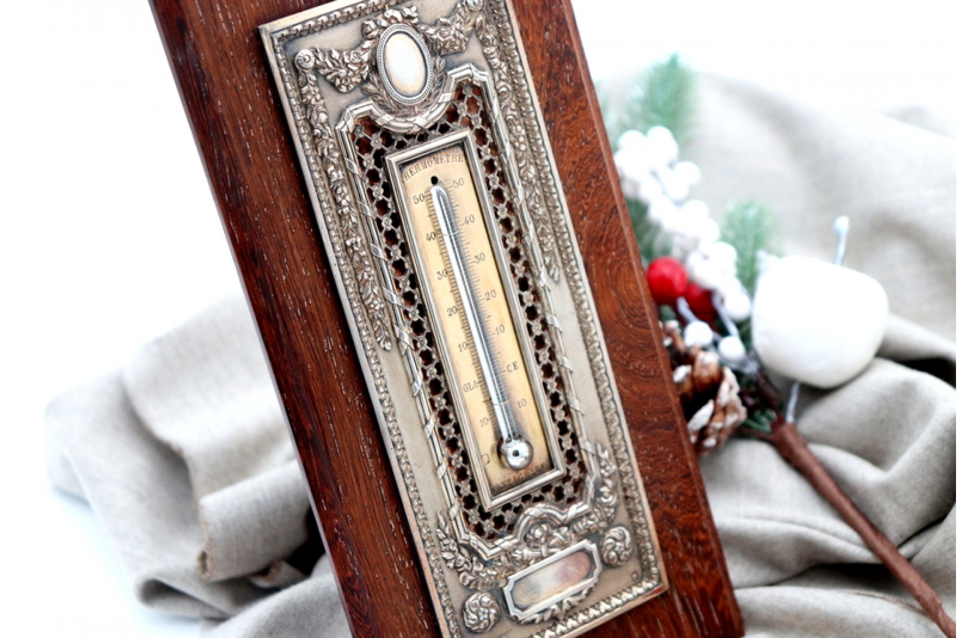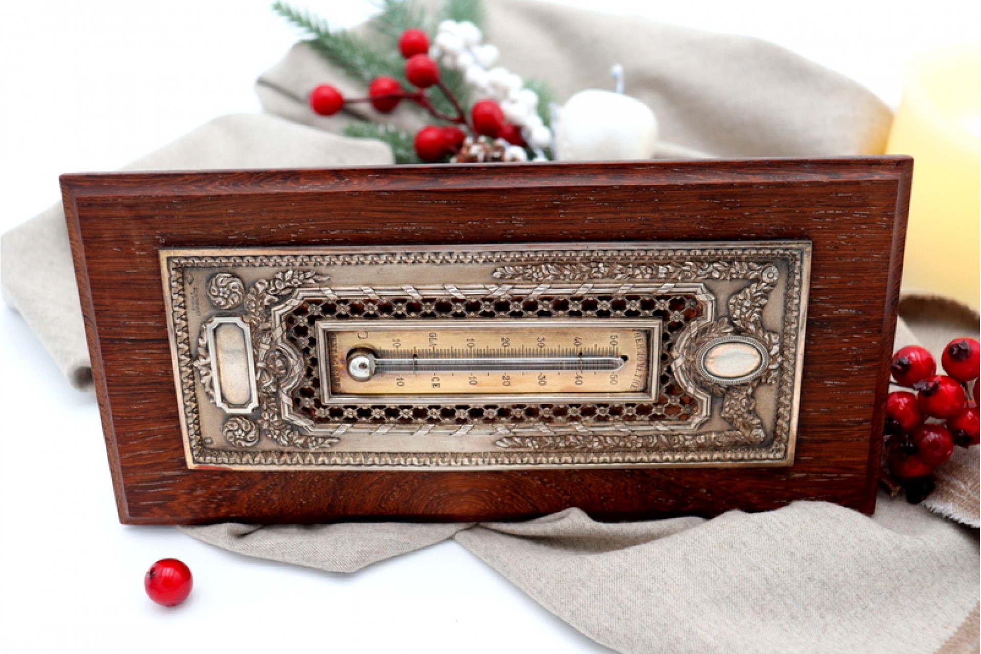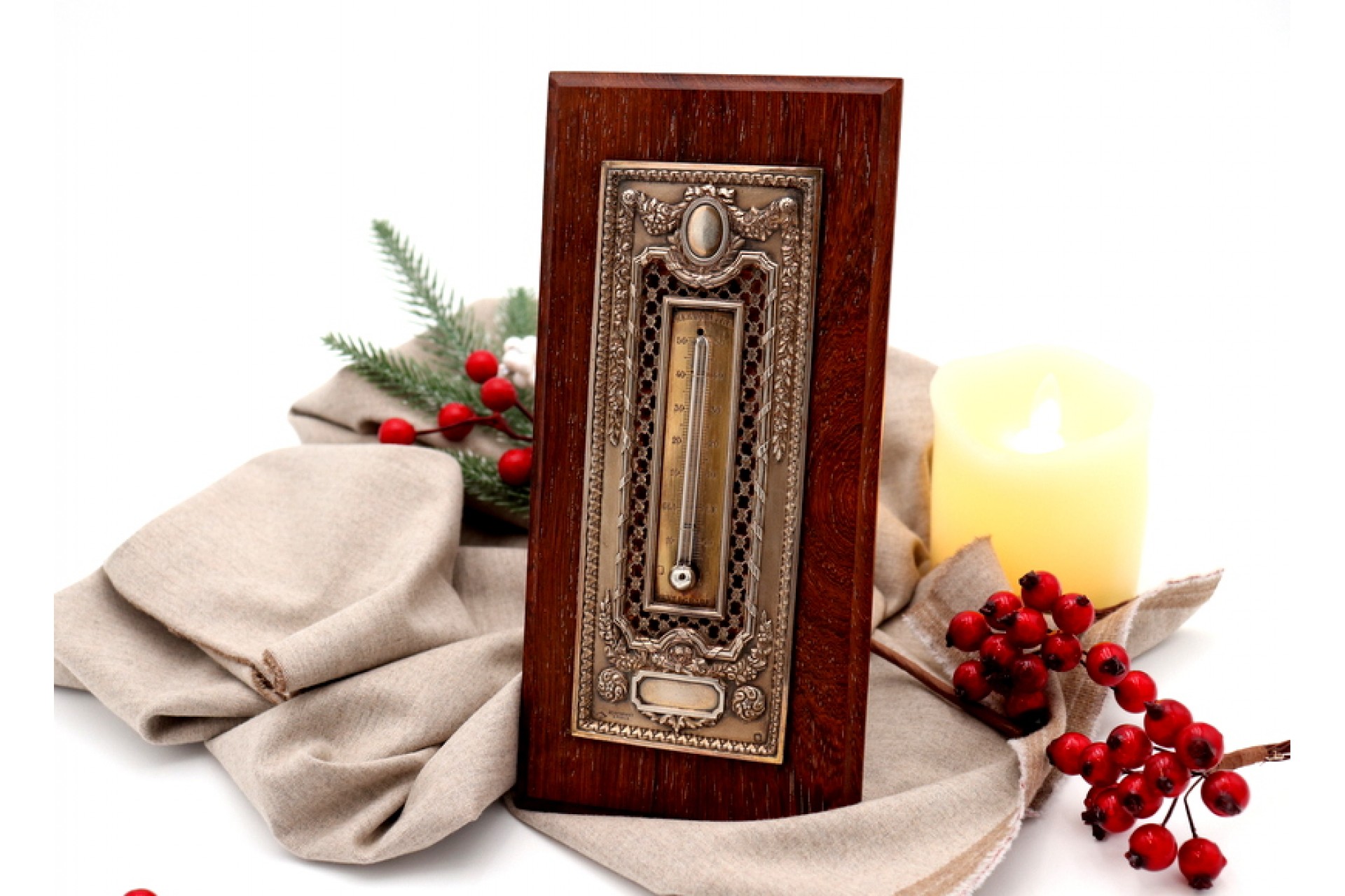 Termómetro em prata recortada, cartela para monograma com base em madeira
