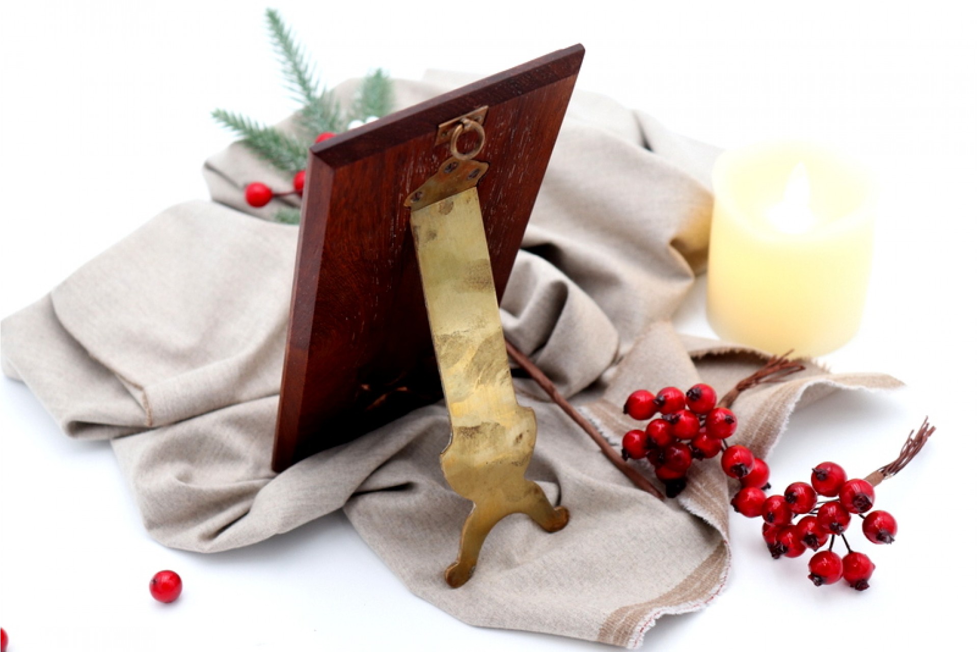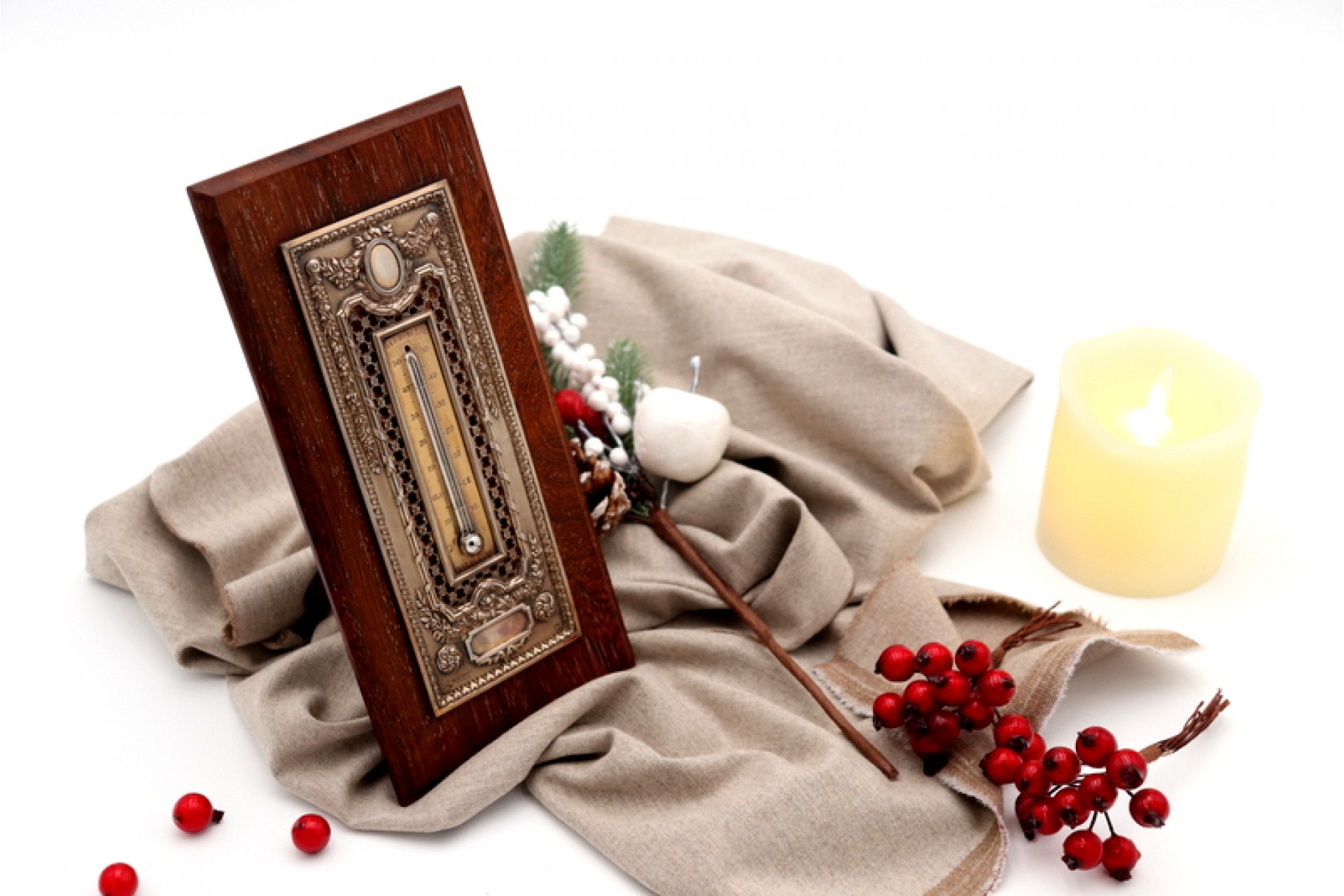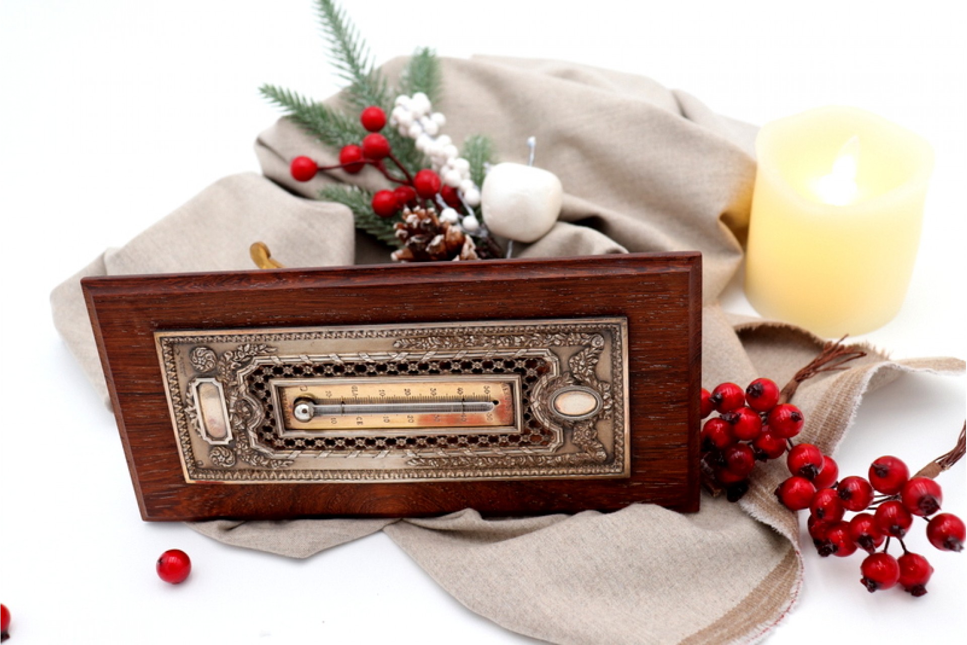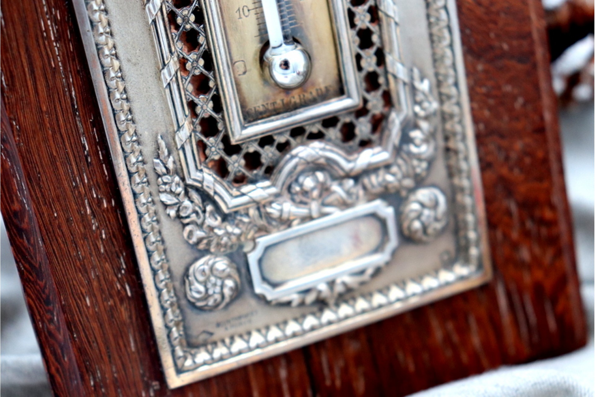 Termómetro em prata recortada, cartela para monograma com base em madeira