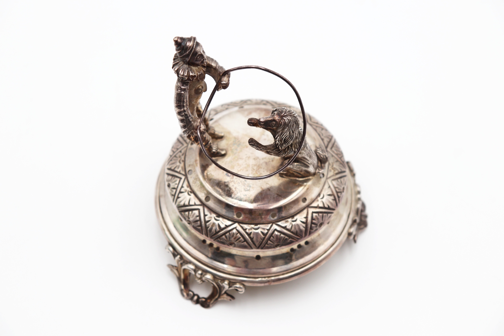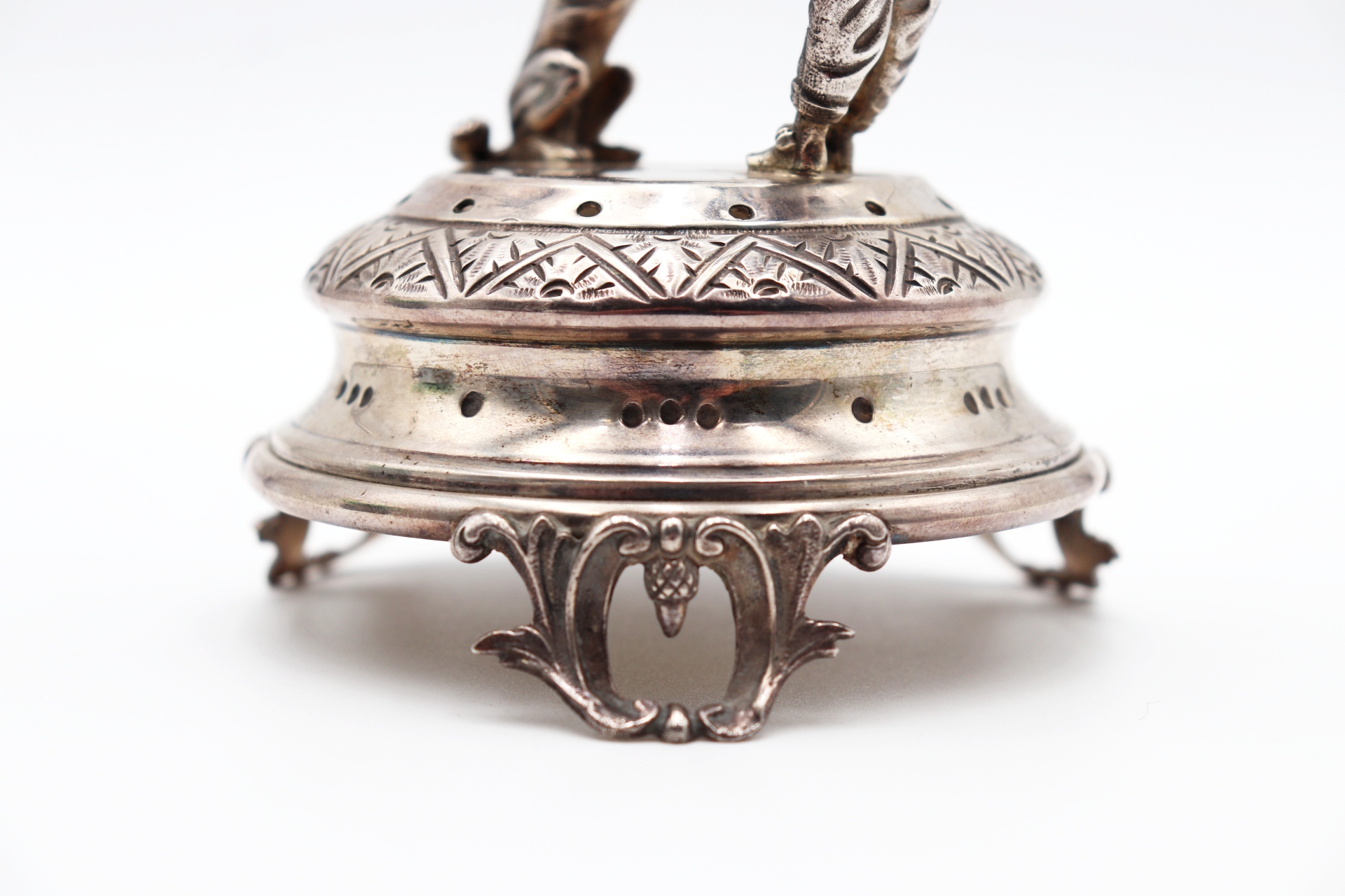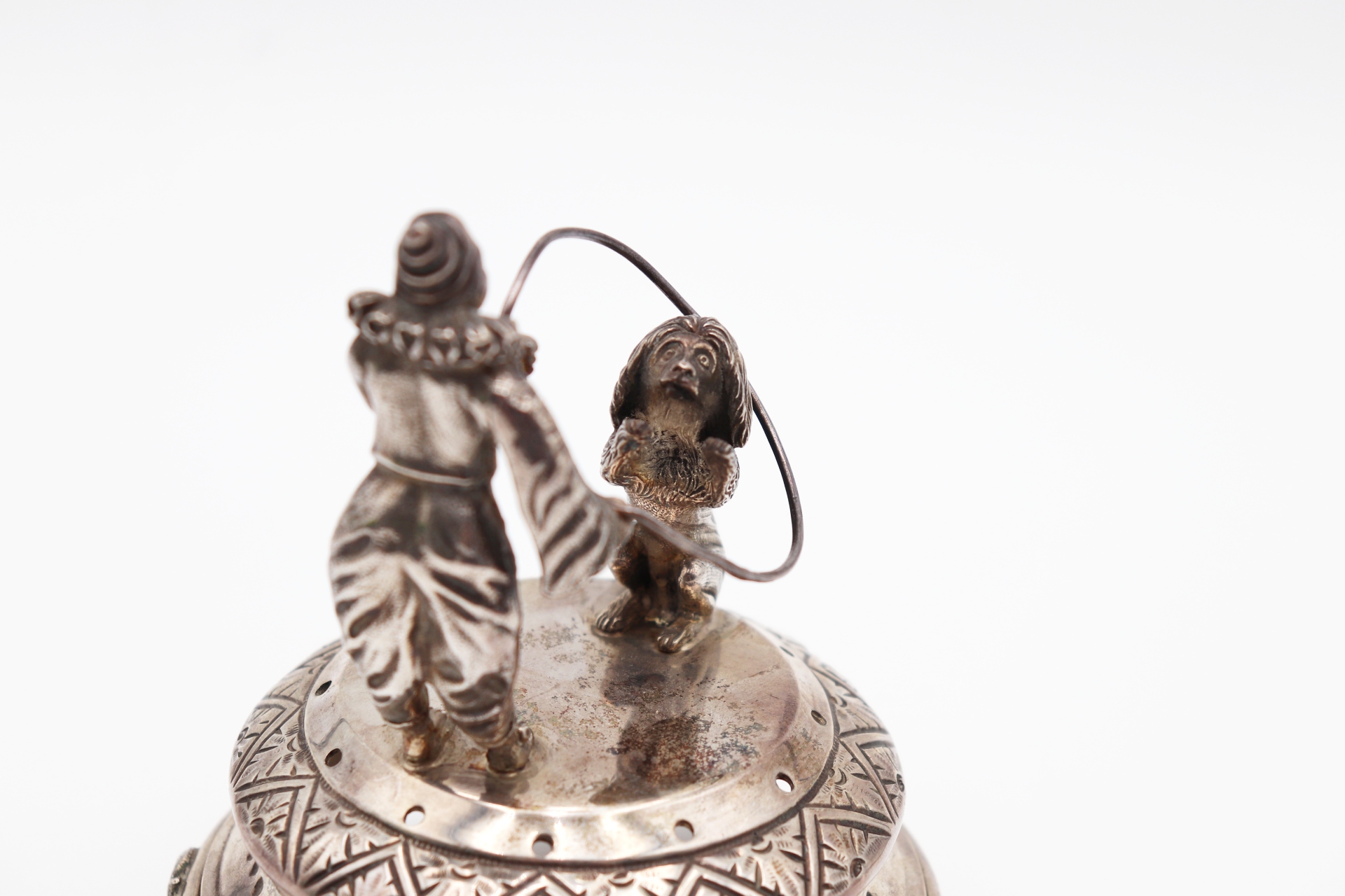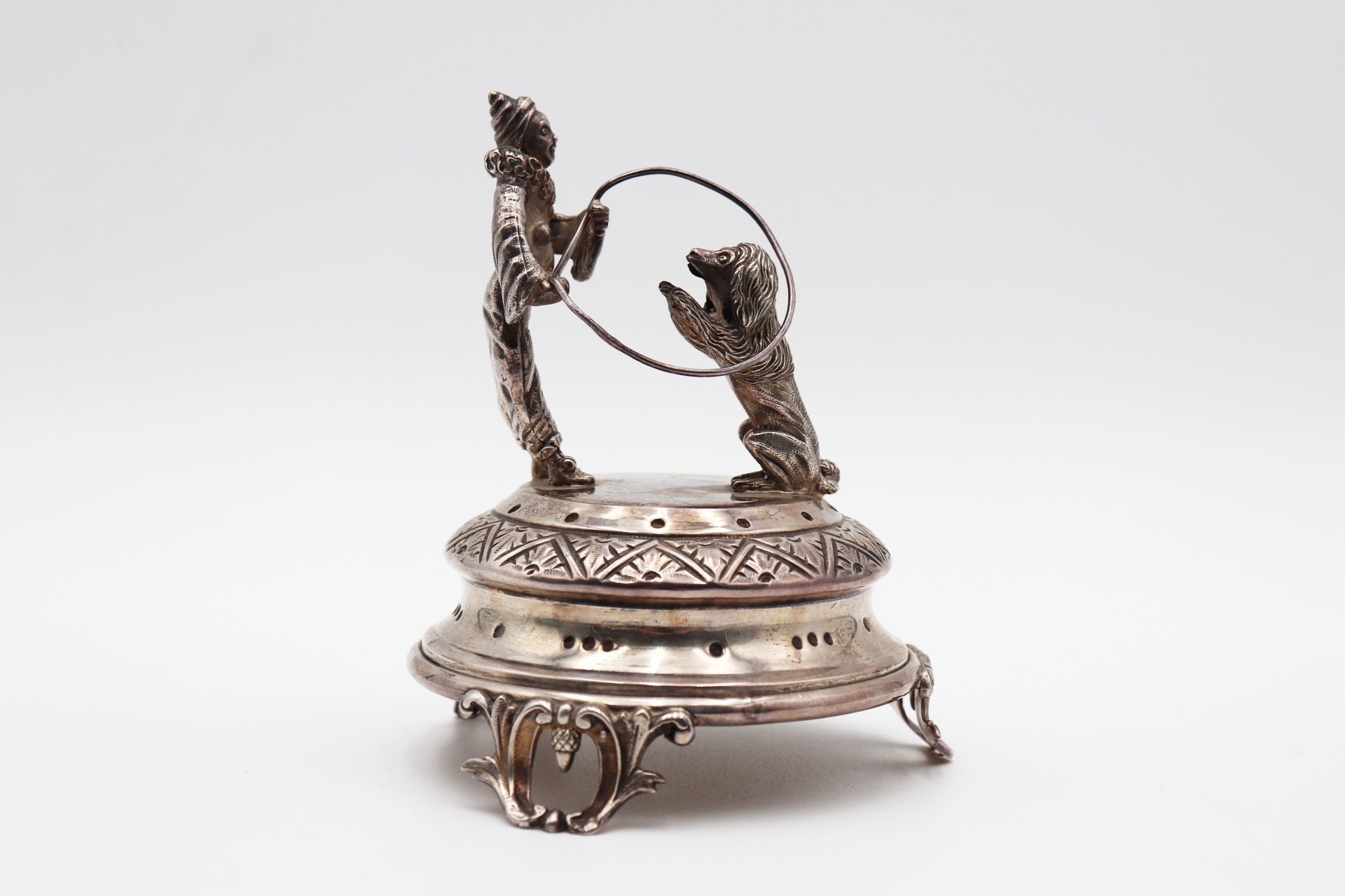 • Descrição: Paliteiro de prata com palhaço domador e leão em salto de corda, base circular com padrões geométricos assente em três pés vazados.