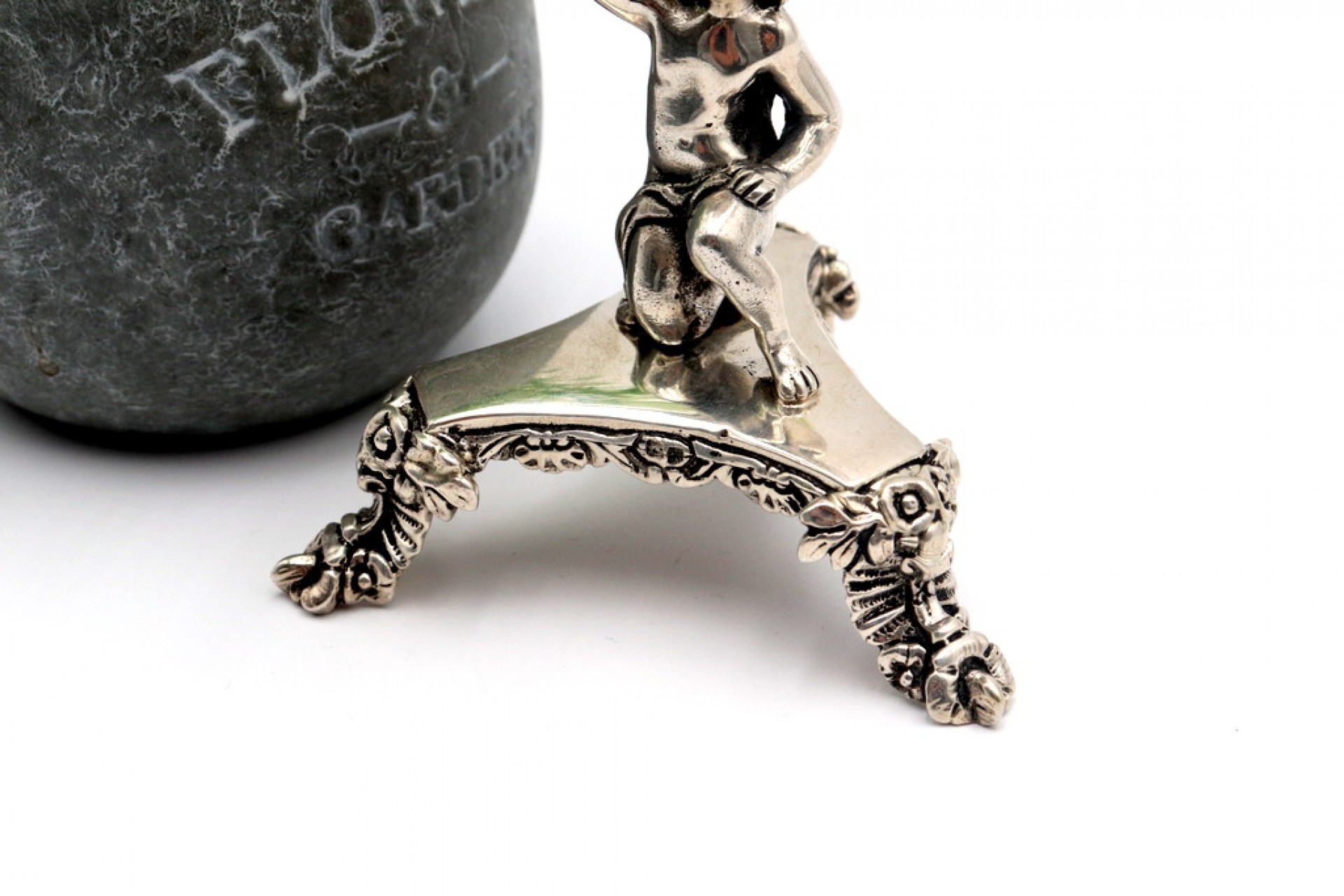 • Descrição: Paliteiro em prata com menino segurando esfera sobre pedestal relevado de formato trípodo e assente em três pés com  aplicações.