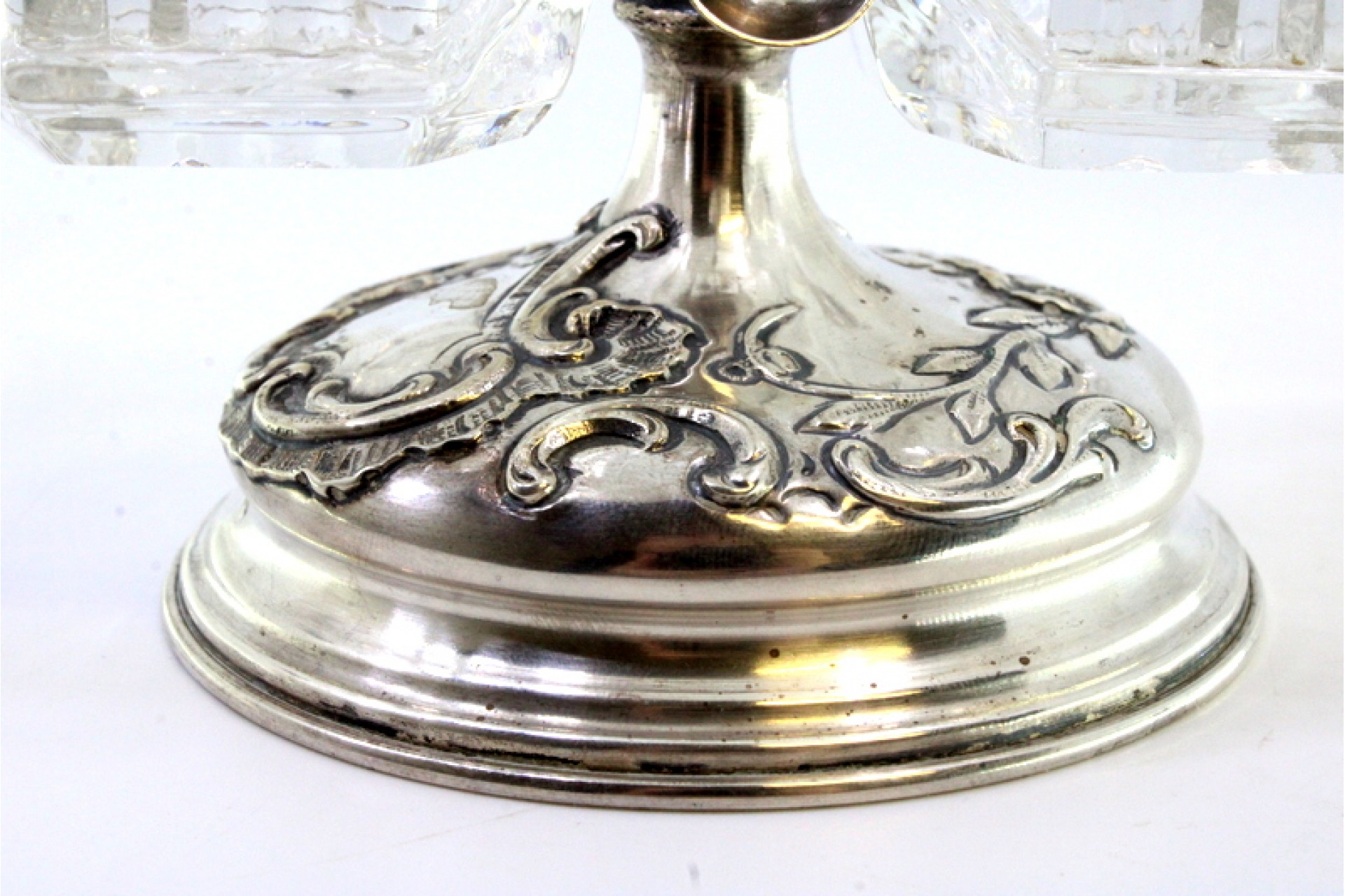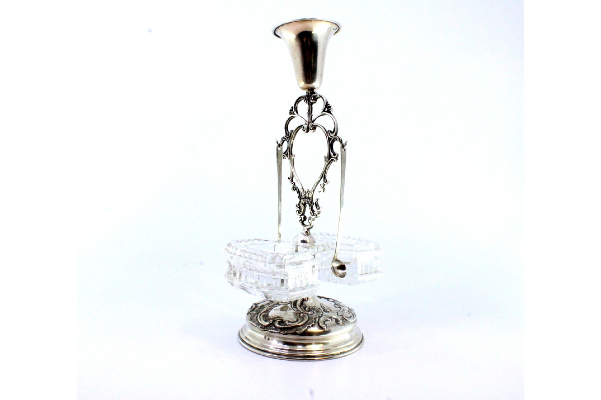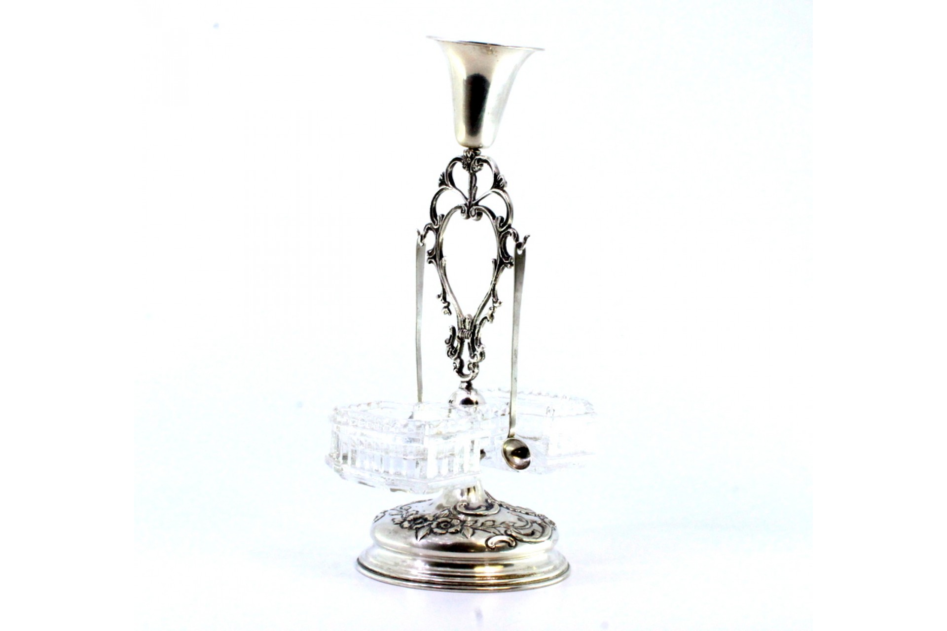 • Descrição: Paliteiro em prata com cálice suportado sobre aplicação recortada, depósitos em vidro lapidado para sal e pimenta com duas conchas.