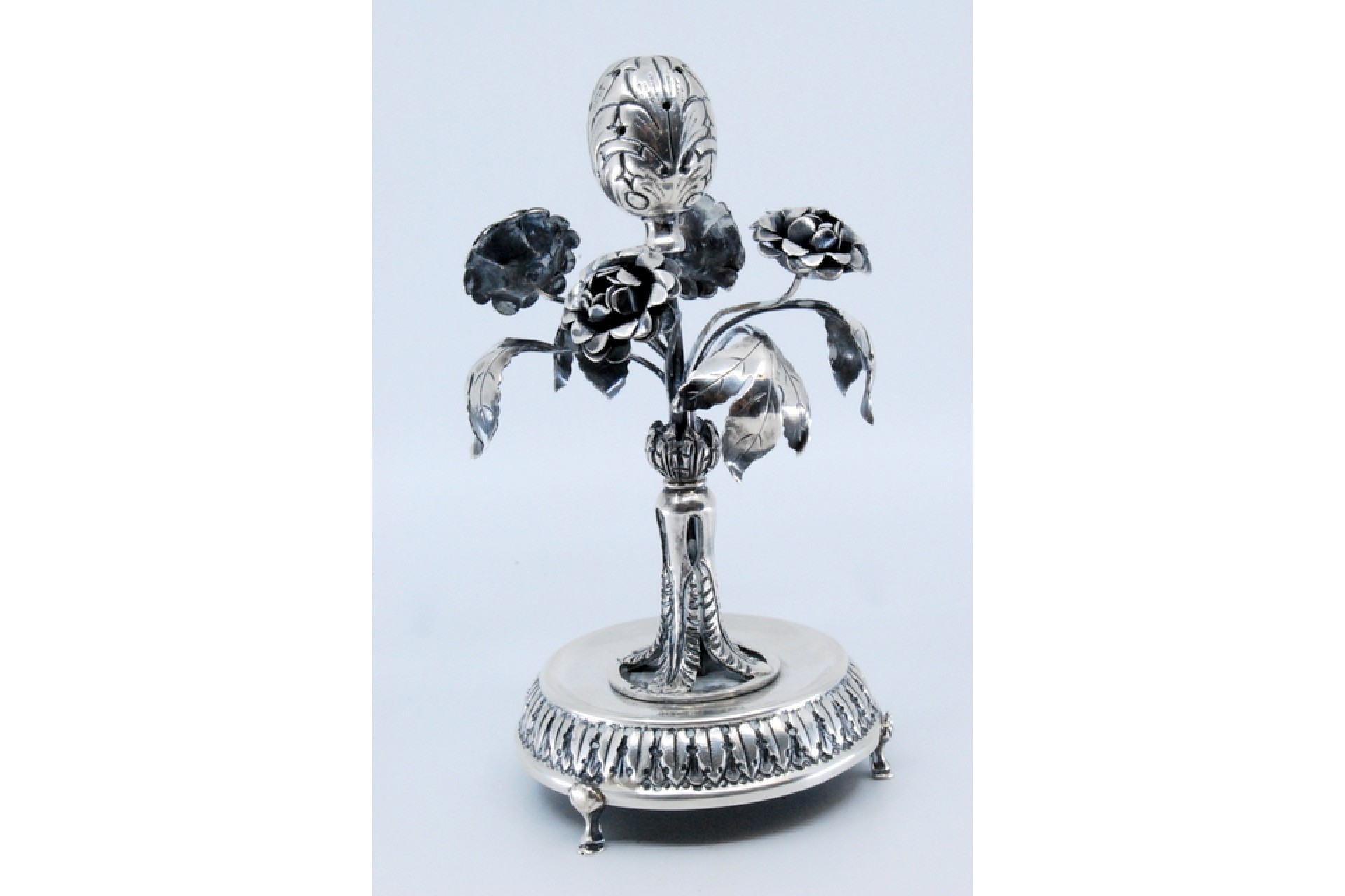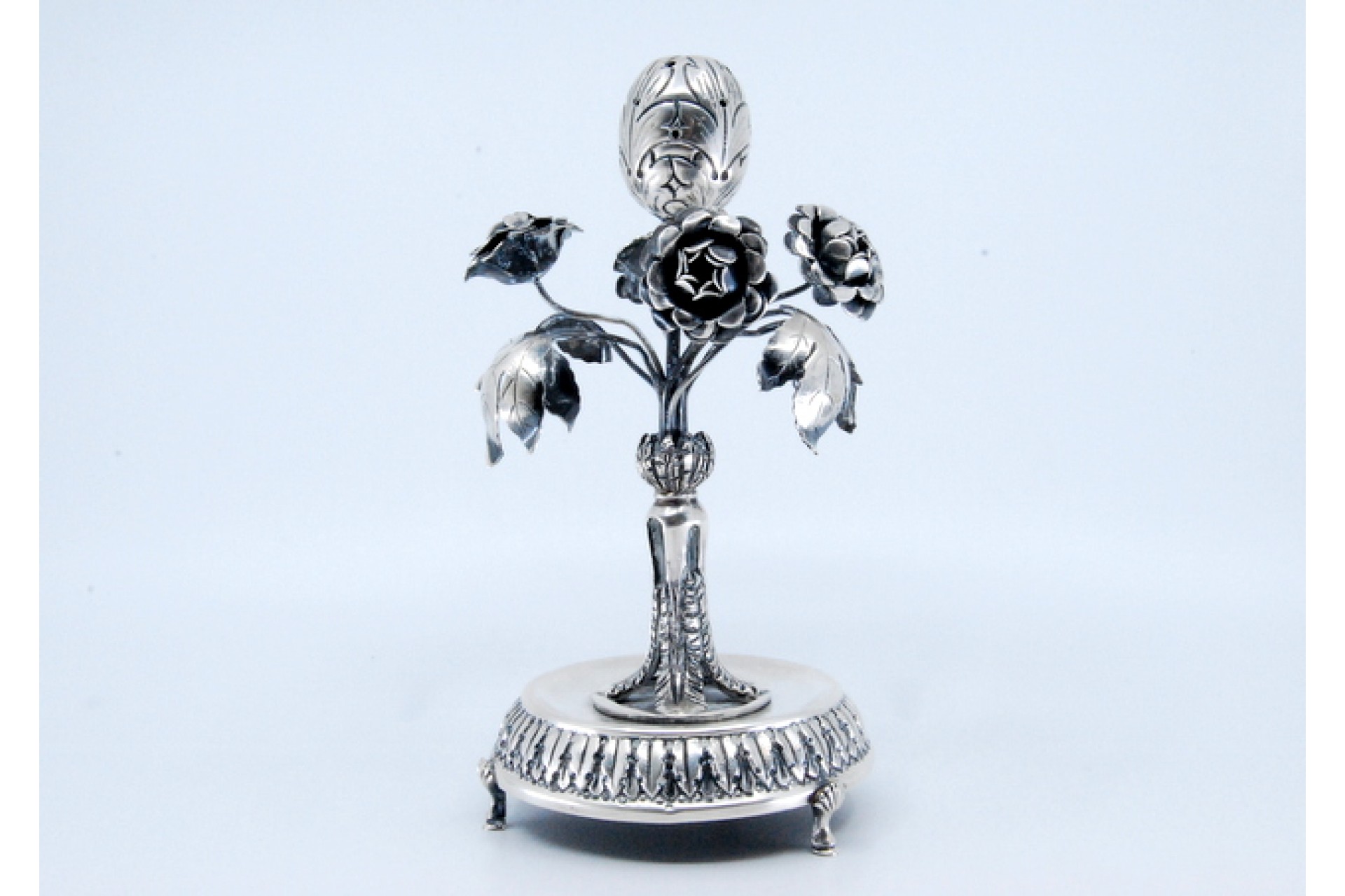• Descrição: Paliteiro em prata com flores e folhas, noz no centro, assente sobre base com relevos e três pés.