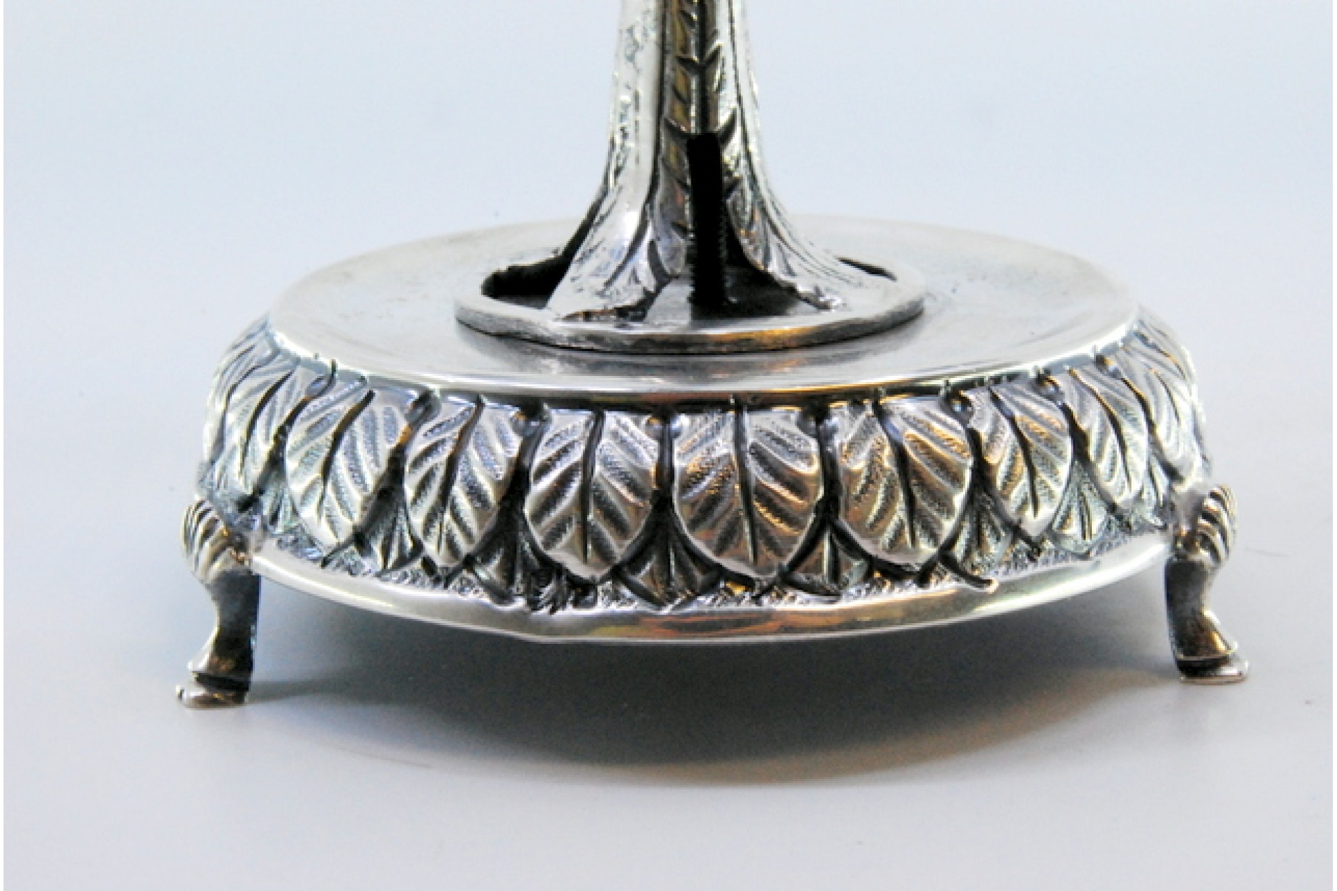 • Descrição: Paliteiro em prata com folhas e flores encimado com bolbo e assente em base relevada, com folhas de acanto e três pés.