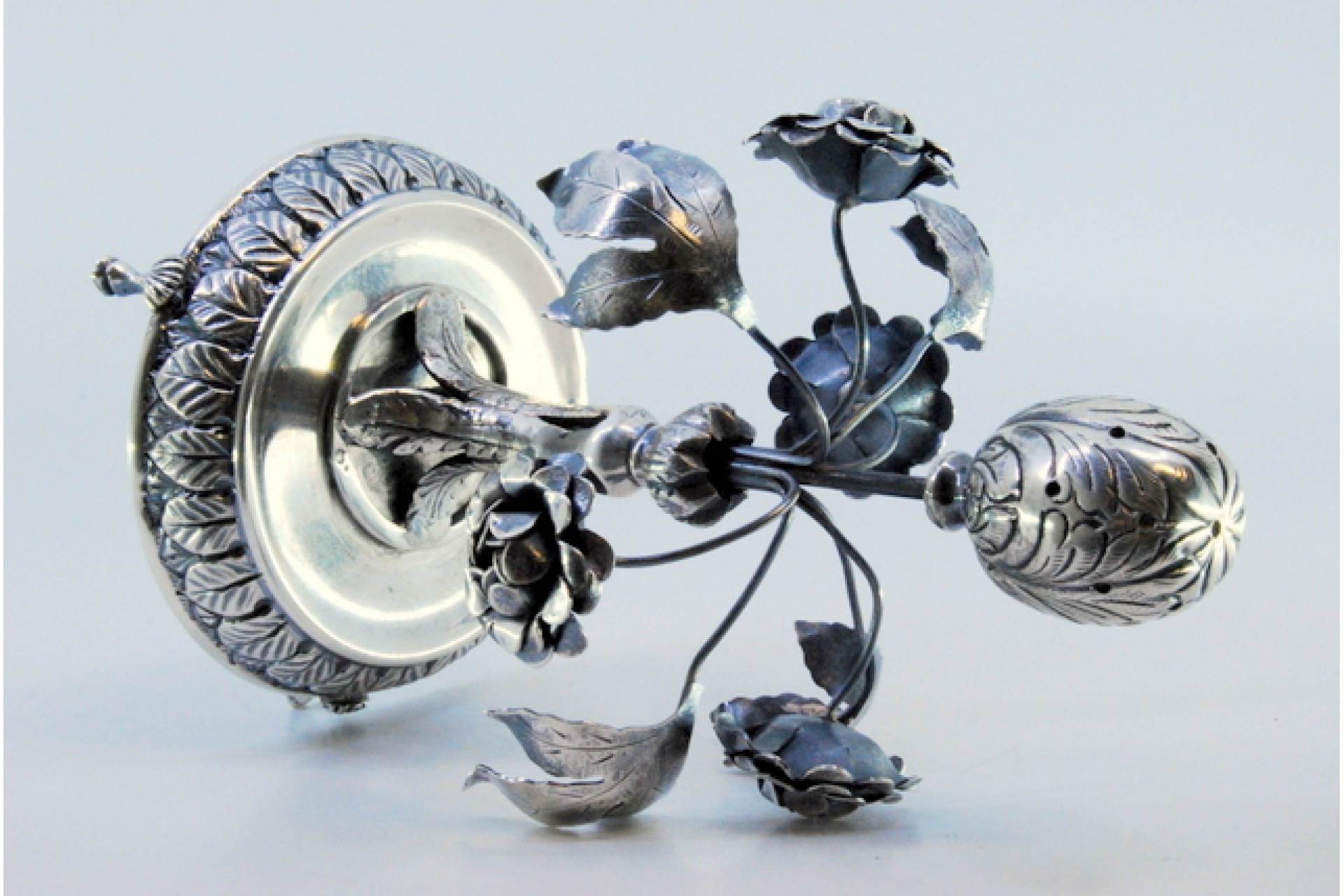 Paliteiro em prata com folhas e flores encimado com bolbo e assente em base relevada