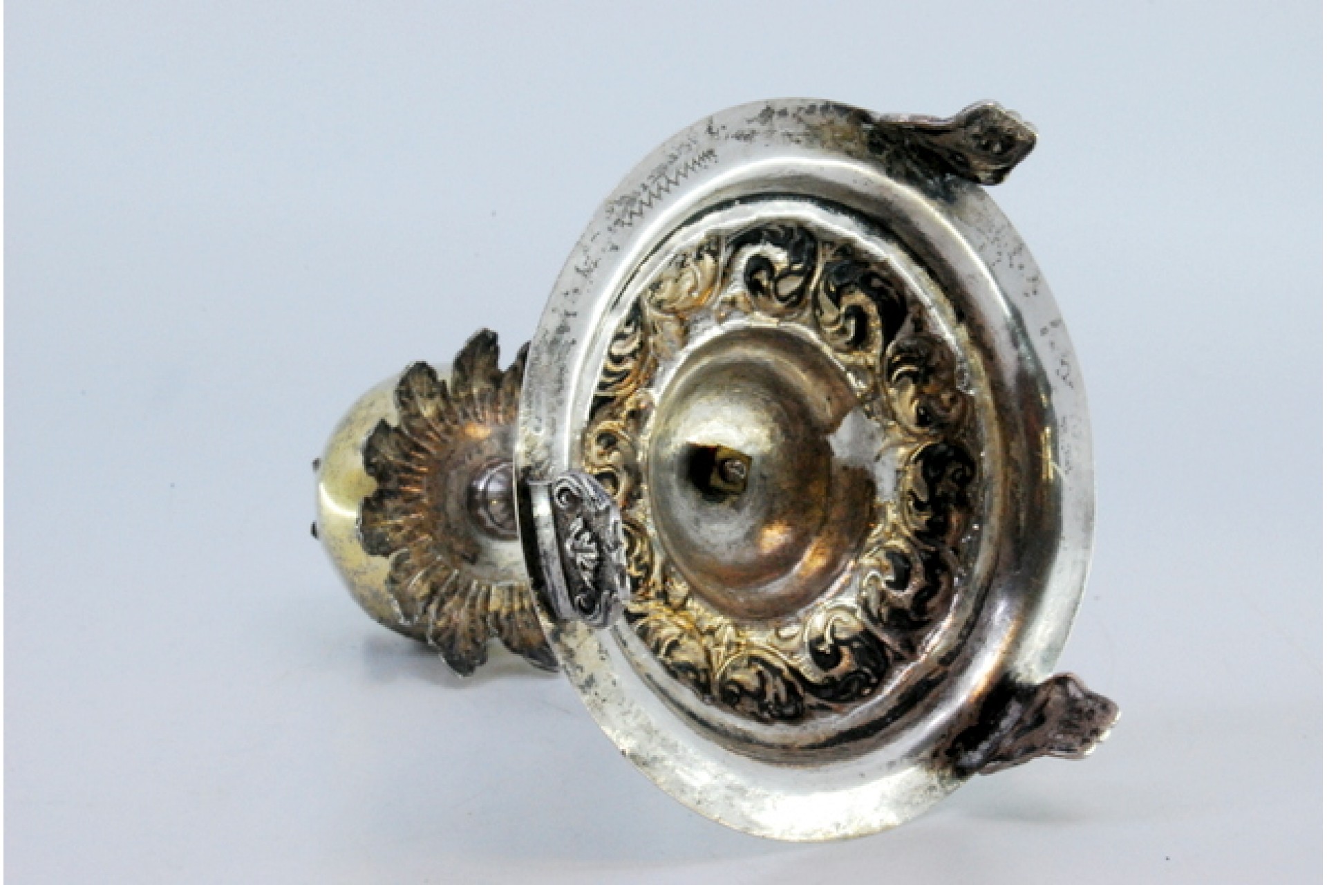 • Descrição: Paliteiro em prata com bola em palmeira sobre base com volutas gravadas e assente em três pés.