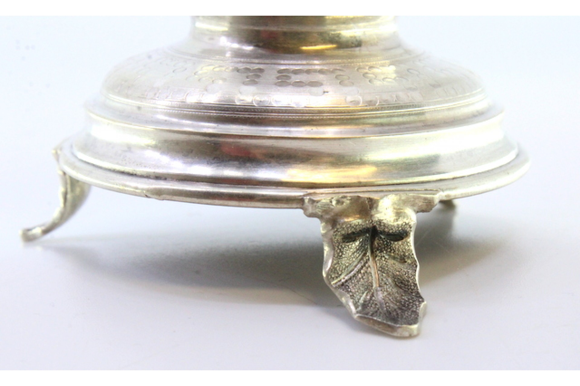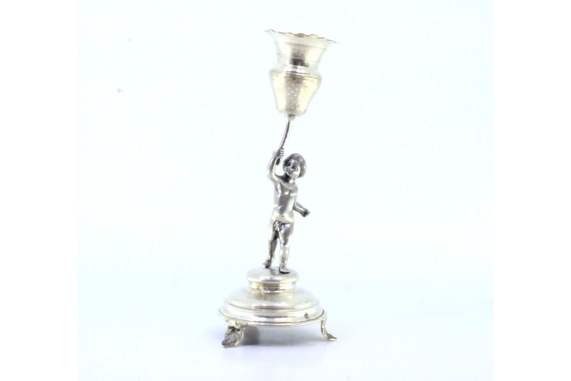 • Descrição: Paliteiro em prata com cálice dourado suportad por putti em pé sobre plinto guilhochado e assente em três pés em forma de folhas de acanto.