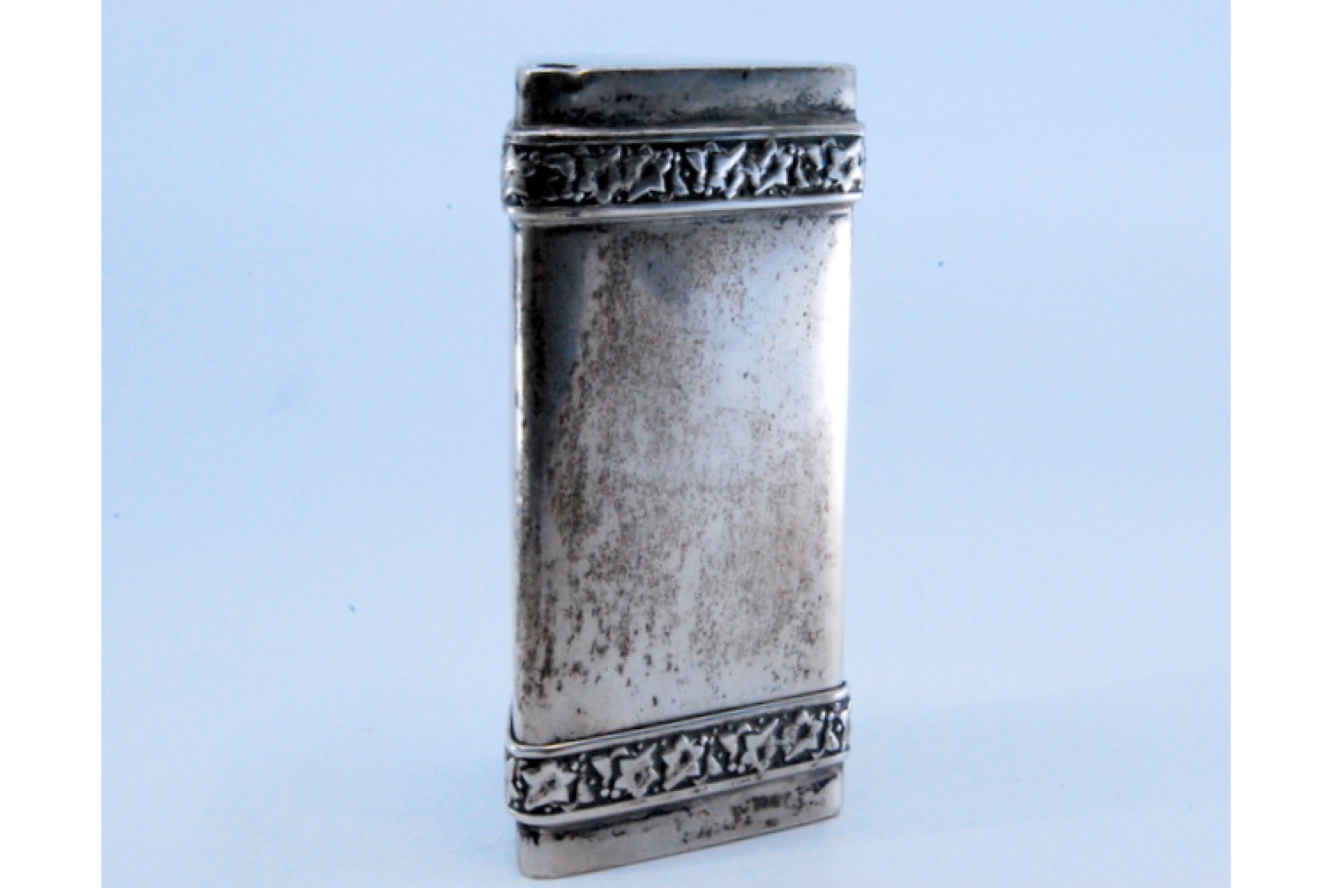 Paliteiro em prata de forma triangular com duas faixas em relevo e tampa para abertura.
