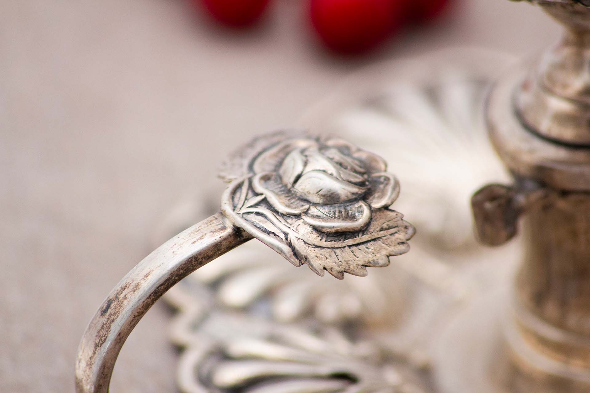 • Descrição: Palmatória em prata com relevos alusivos a flores.