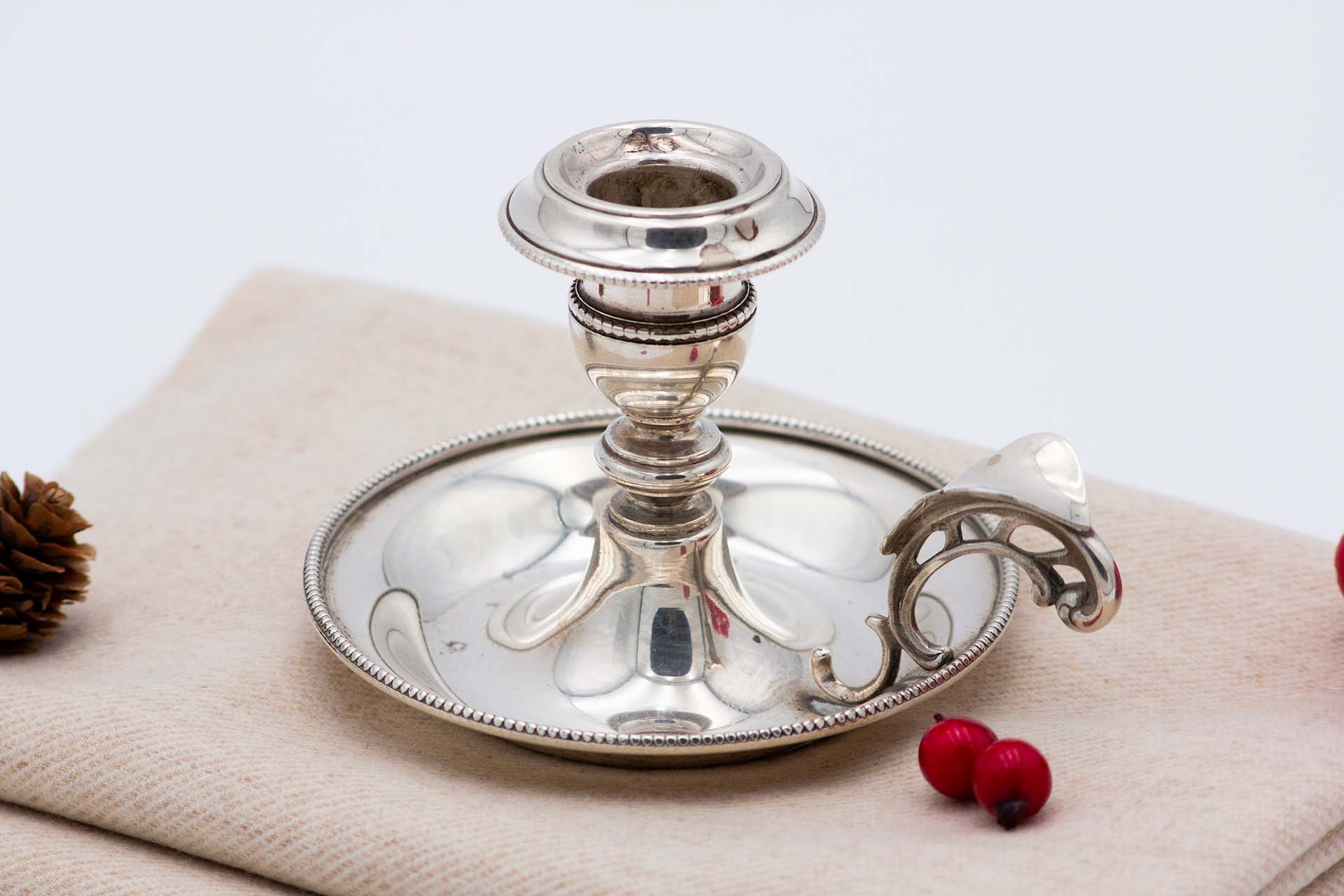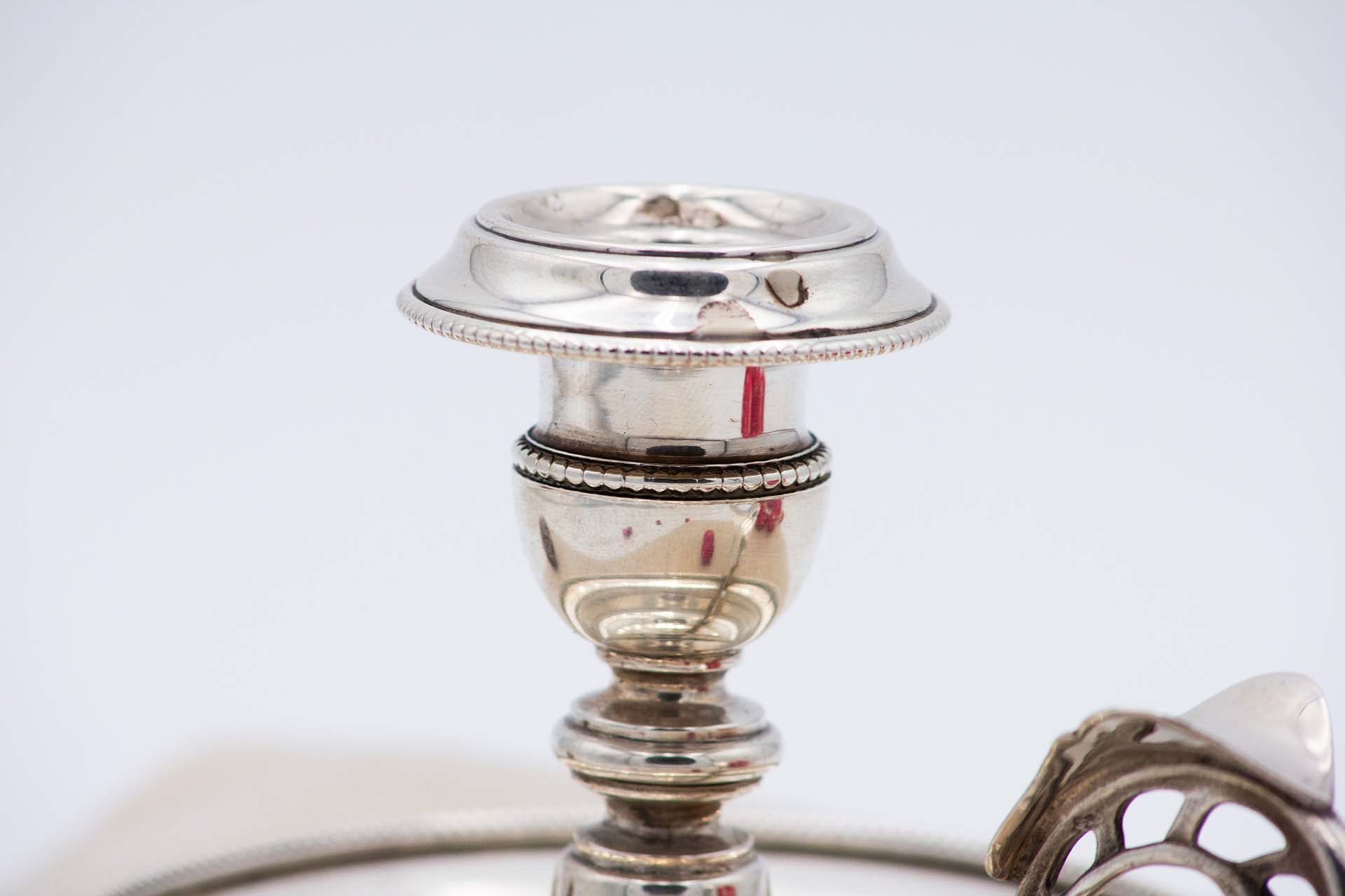 • Descrição: Palmatória em prata lisa com envolvente frisada e base circular.