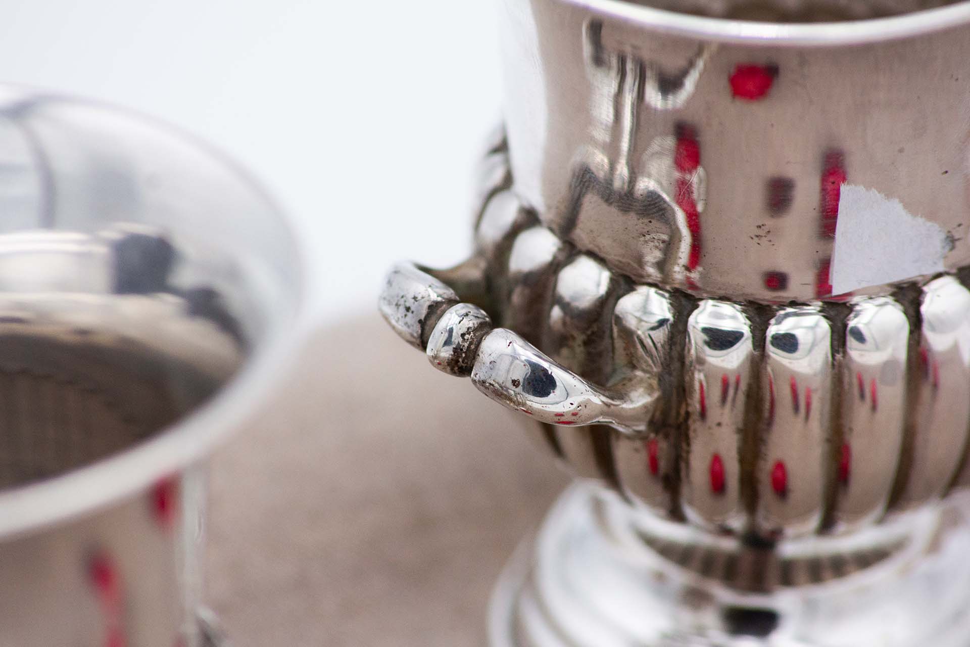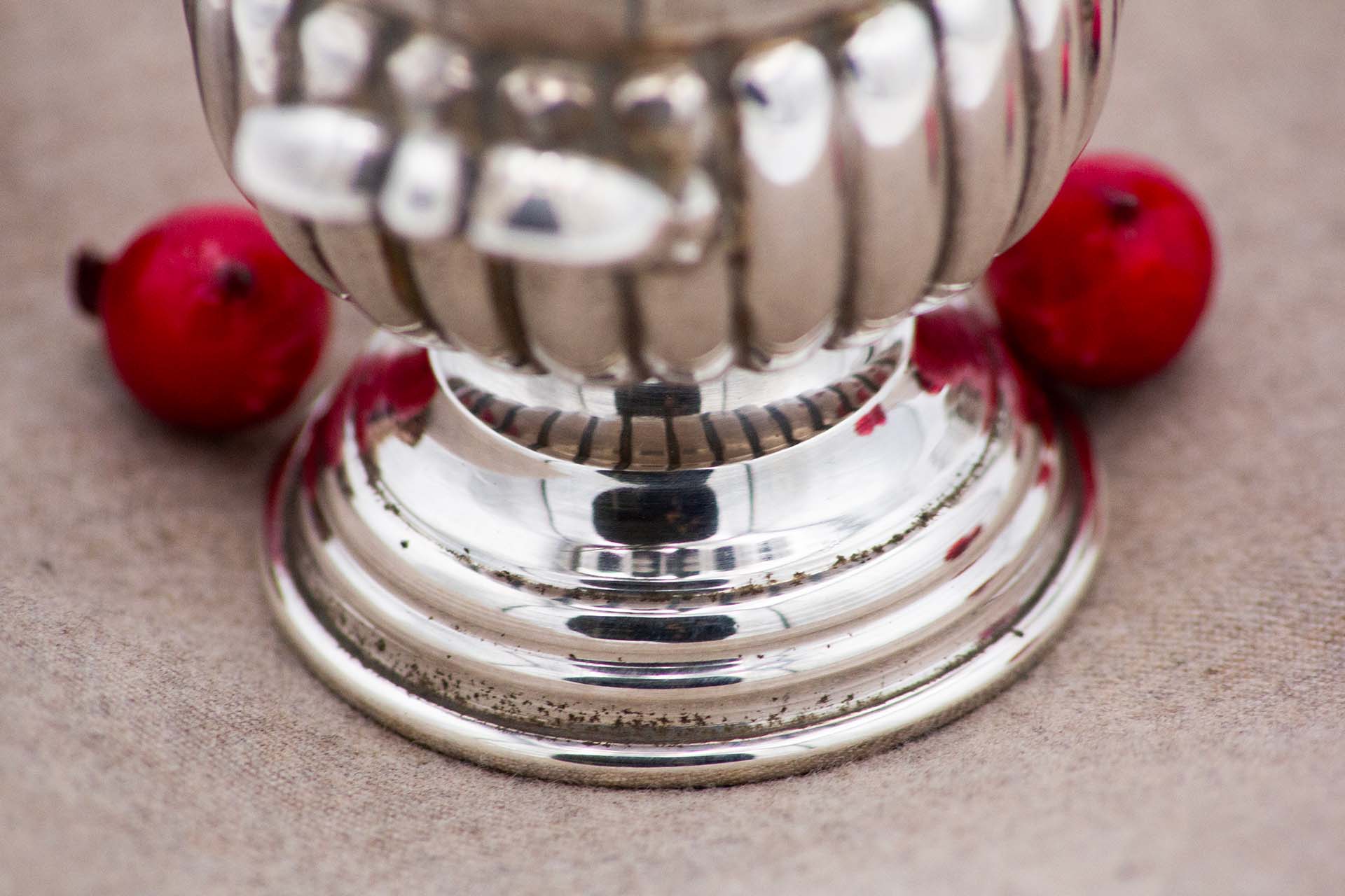 • Descrição: Par de taças em prata canelada e asas relevadas.