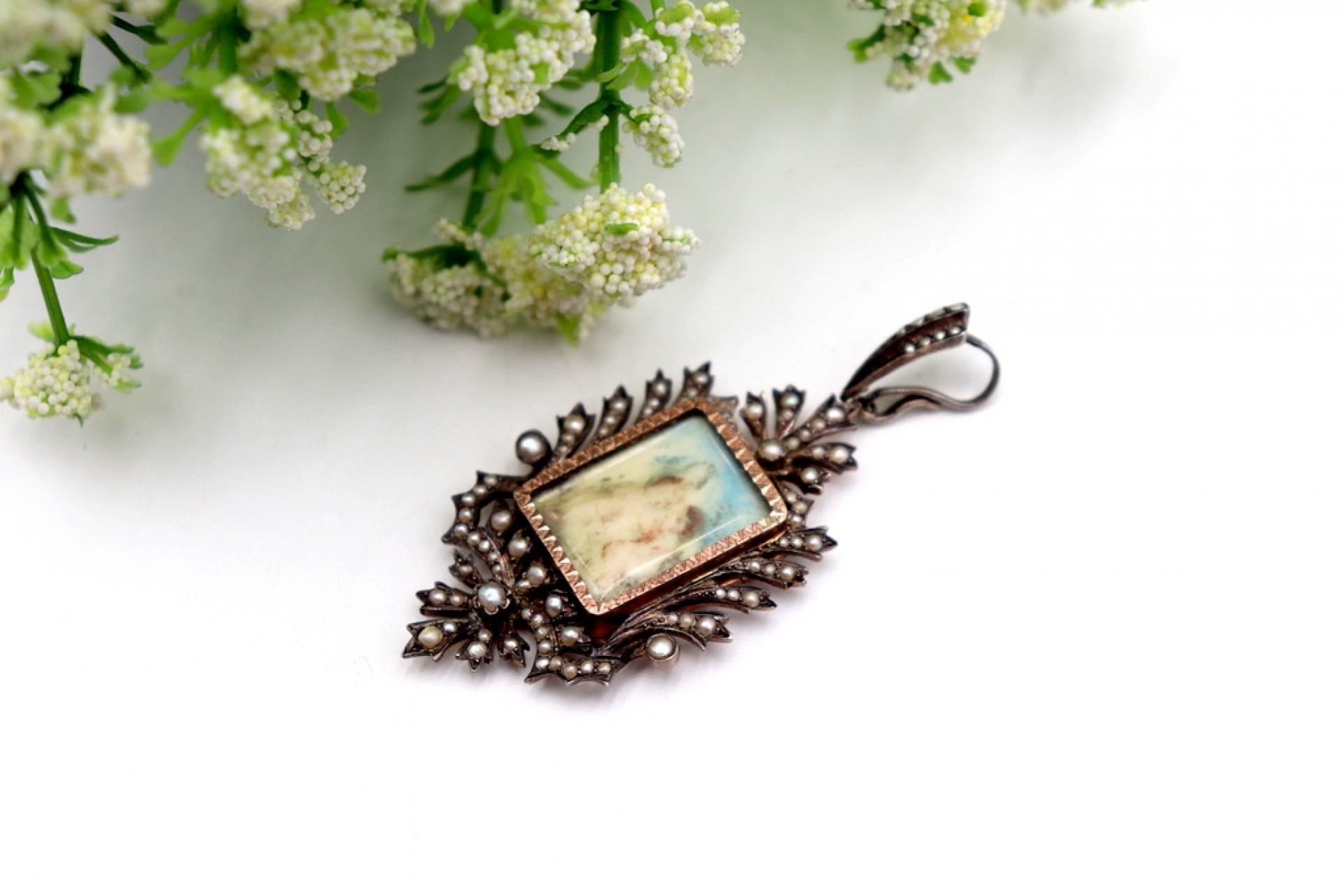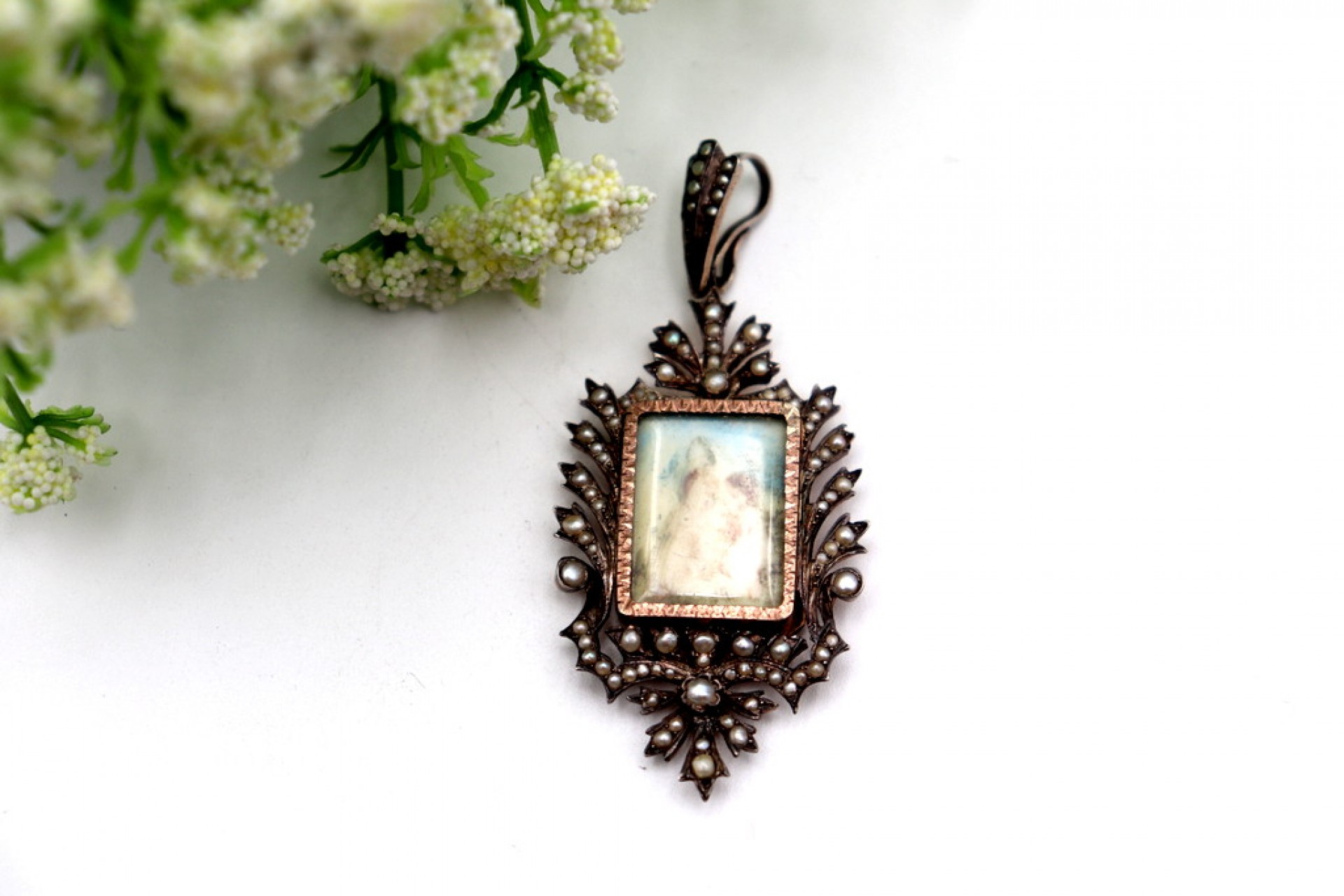 • Descrição: Pendente de prata e ouro com pérolas de semente aplicadas e moldura no centro com cenário de jovens damas.