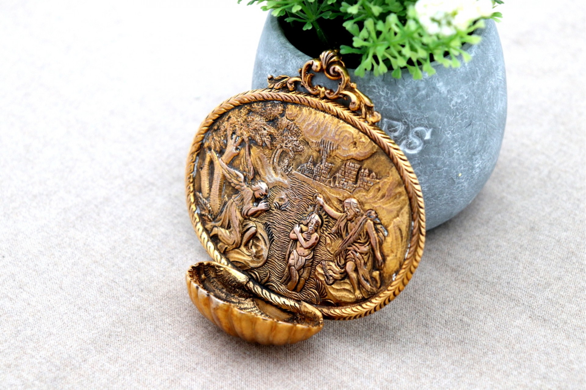 • Descrição: Pia de água benta em prata dourada com relevos e aplicações, com argola de suspensão.