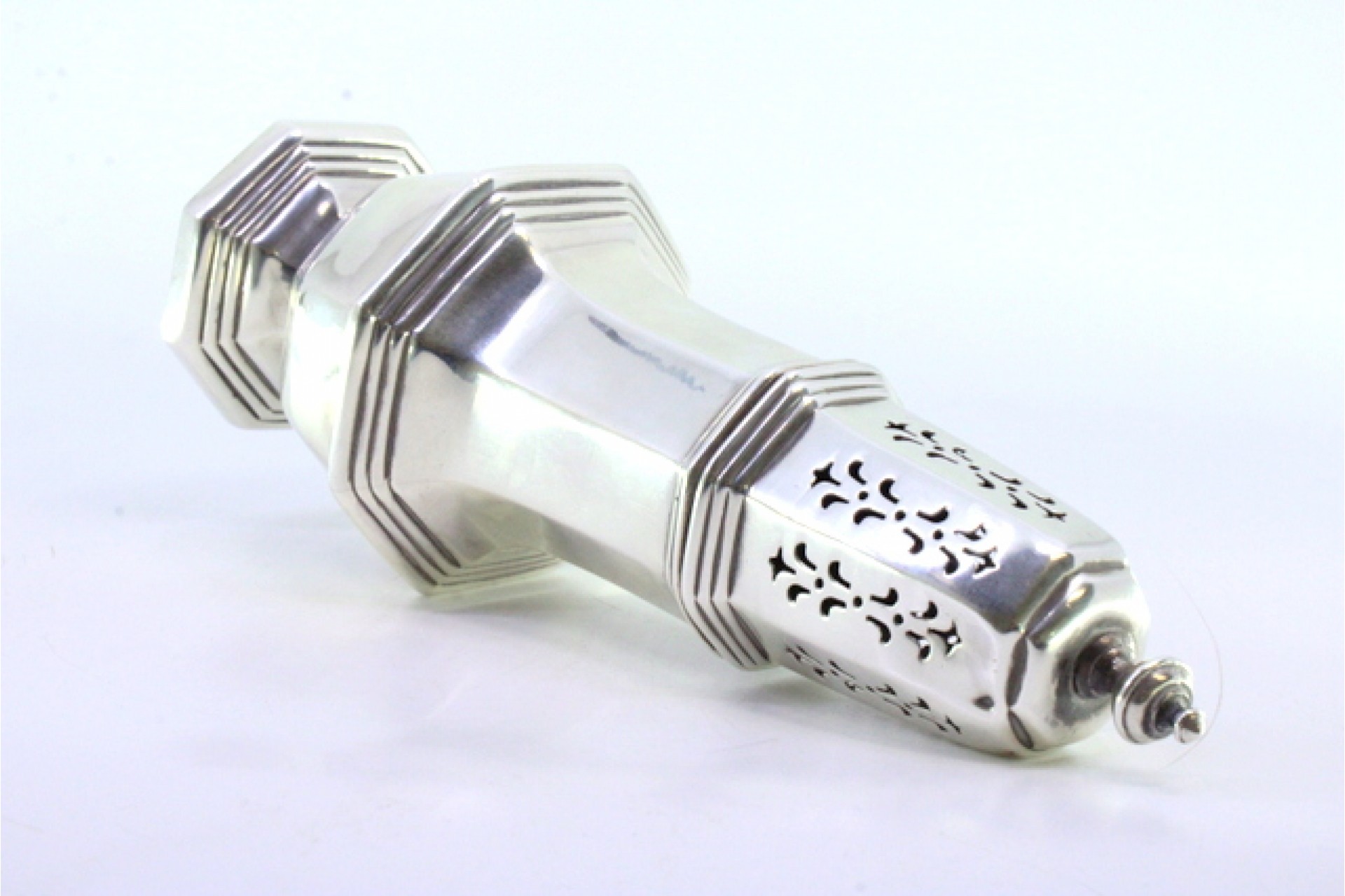 • Descrição: Polvilhador em prata em forma oitavada e pomo na tampa.