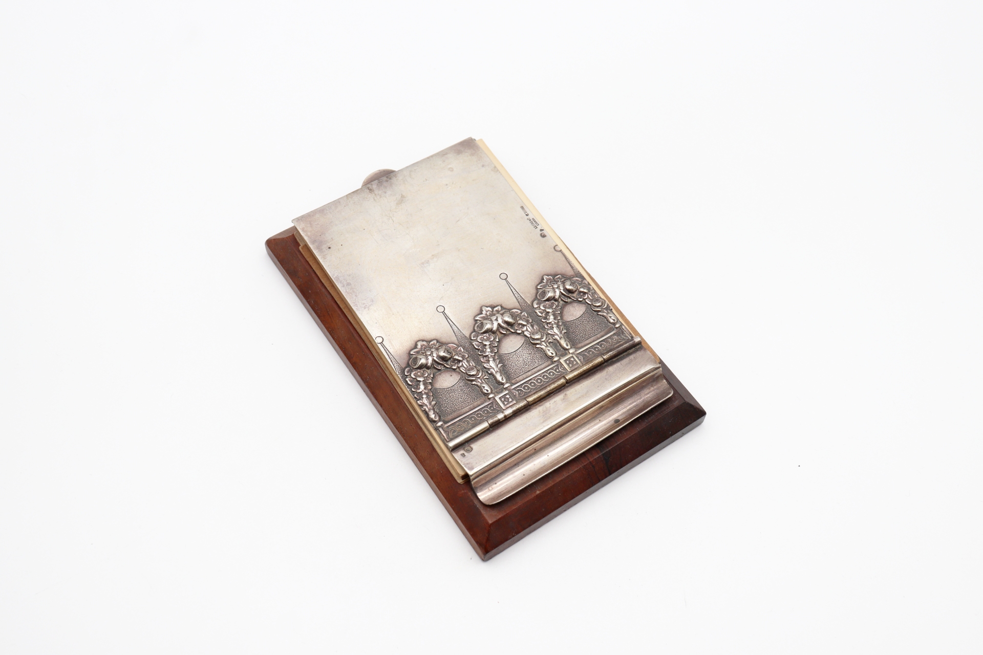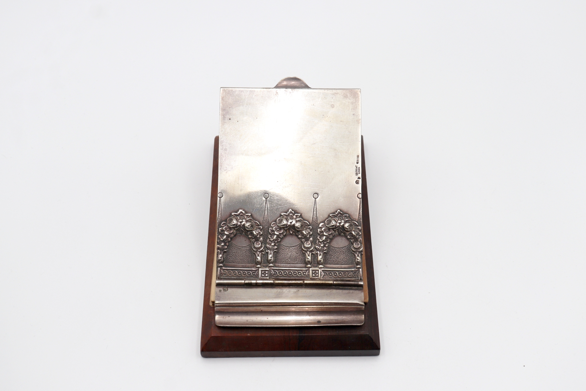 Porta blocos com base em madeira e tampa em prata relevada com motivos florais e