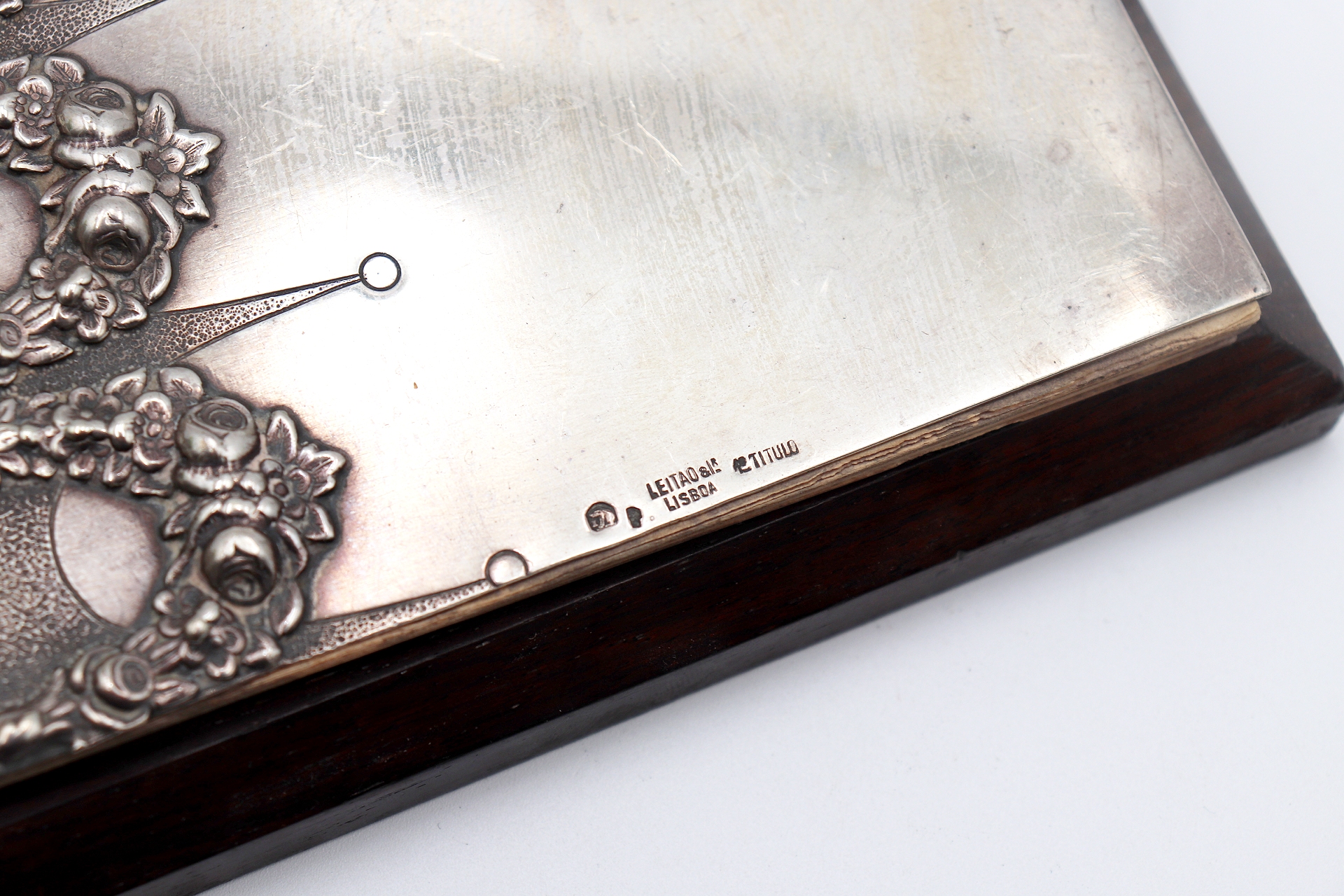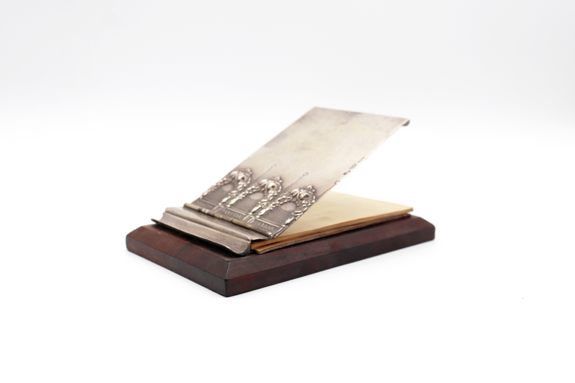 • Descrição: Porta blocos com base em madeira e tampa em prata relevada com motivos florais e grinaldas.