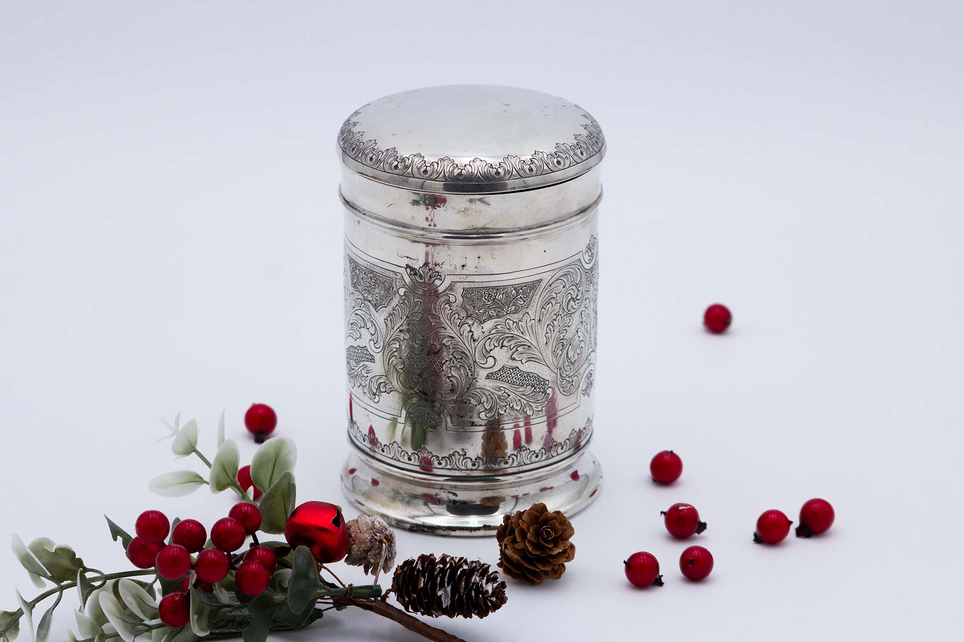 • Descrição: Pote em prata com motivos florais, grinaldas e frisos gravados, tampa lisa amovível.