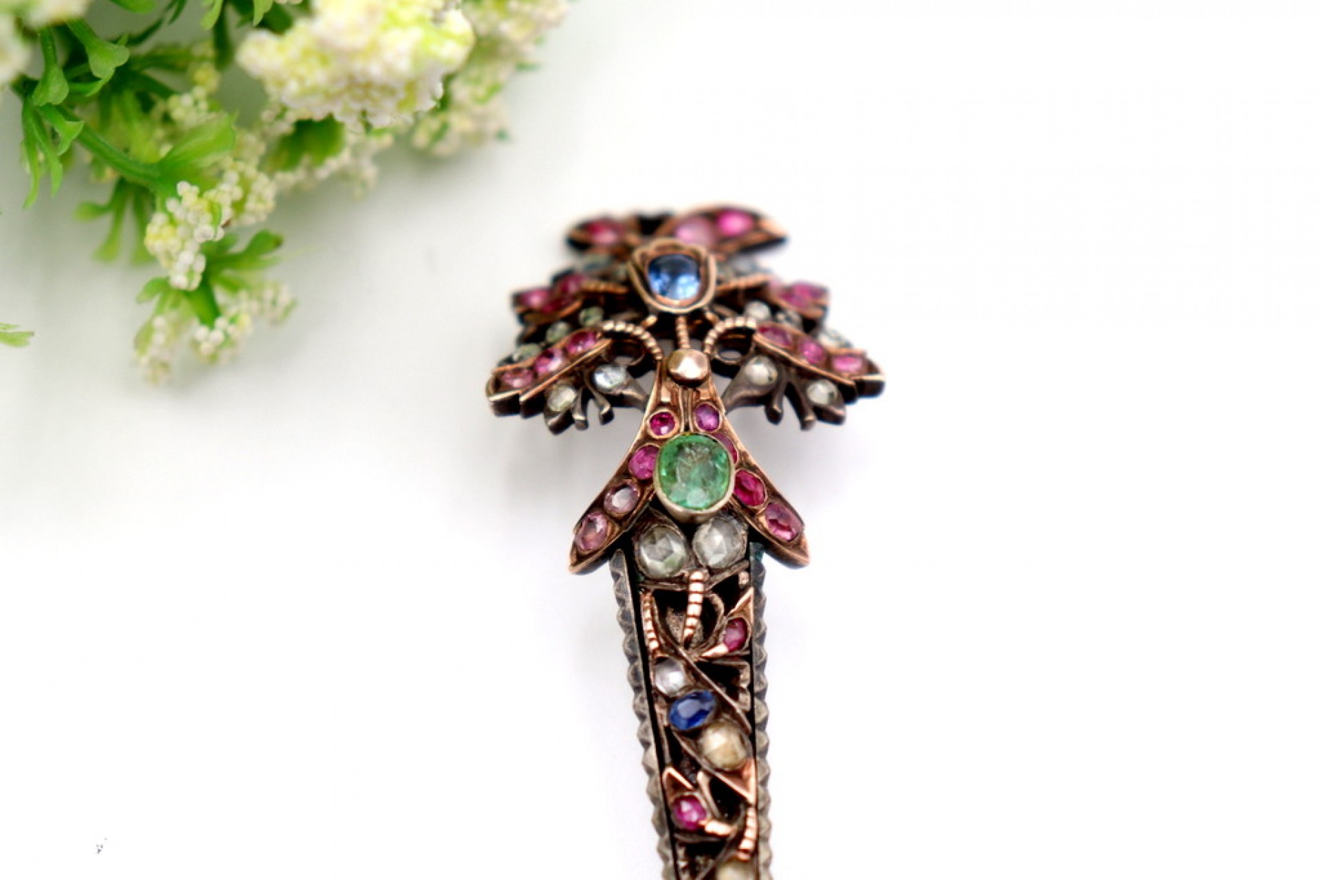 • Descrição: Alfinete de cabelo em prata e ouro com aplicação de diamantes coroados, rubis, safiras e esmeralda.